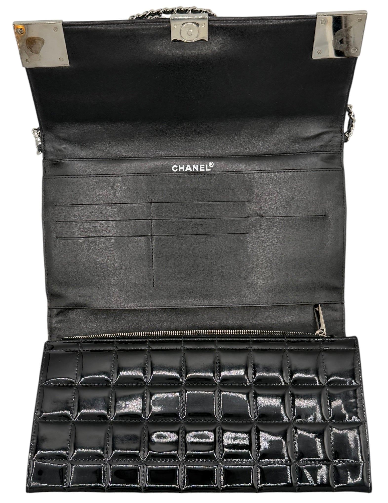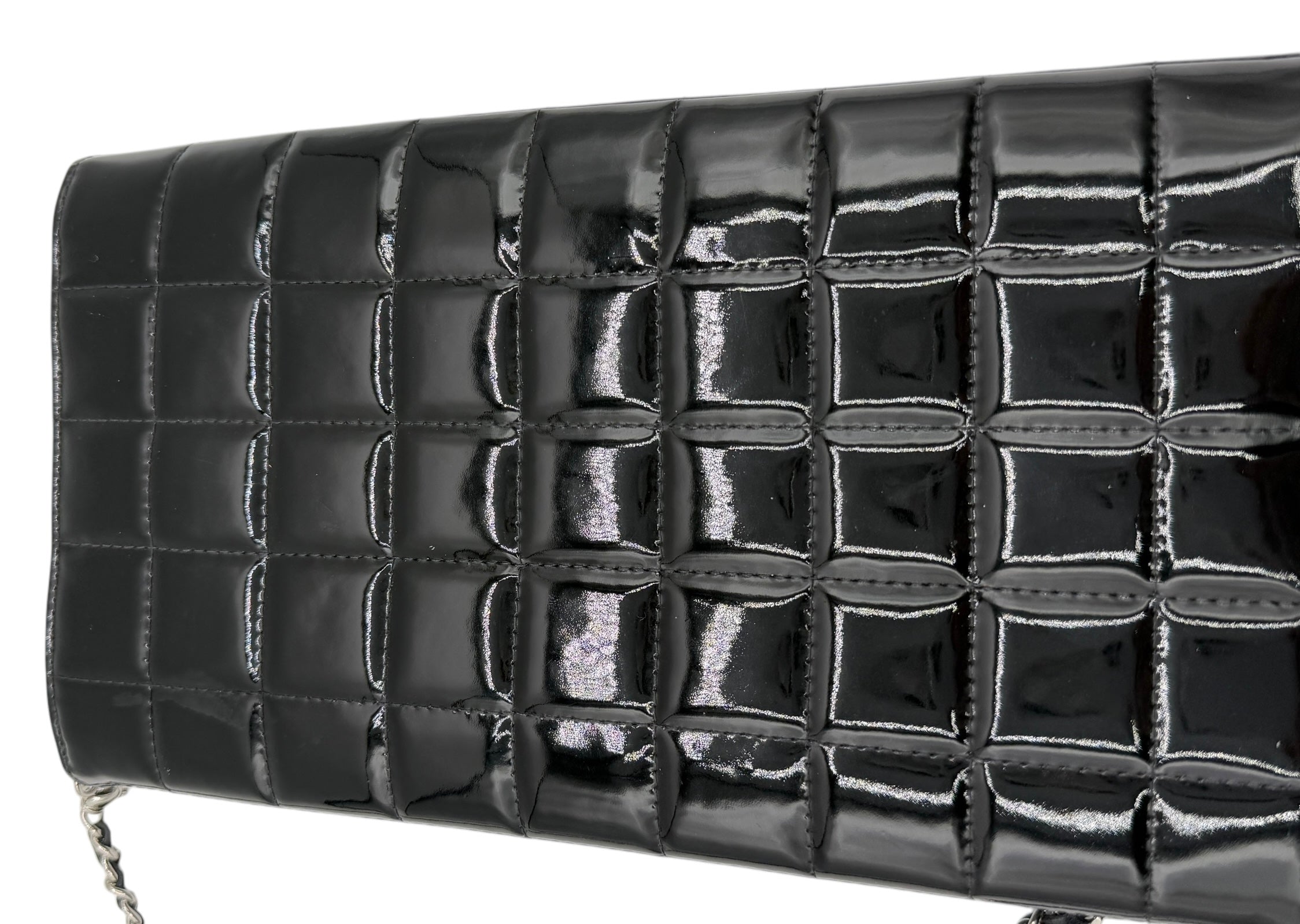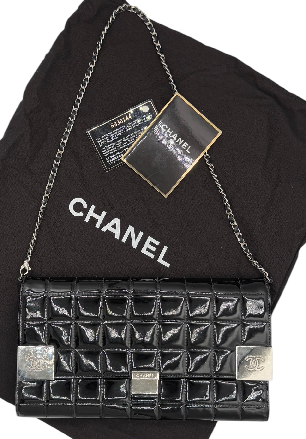 This fabulous Chanel bag has a quilted black patent leather exterior and flap style opening with one snap closure. It has black leather interior with two open top pockets on the back interior. The strap is the classic woven black leather and silver chain with a clasp on one end of the chain to adjust the strap length or style. It also comes with original dust bag!