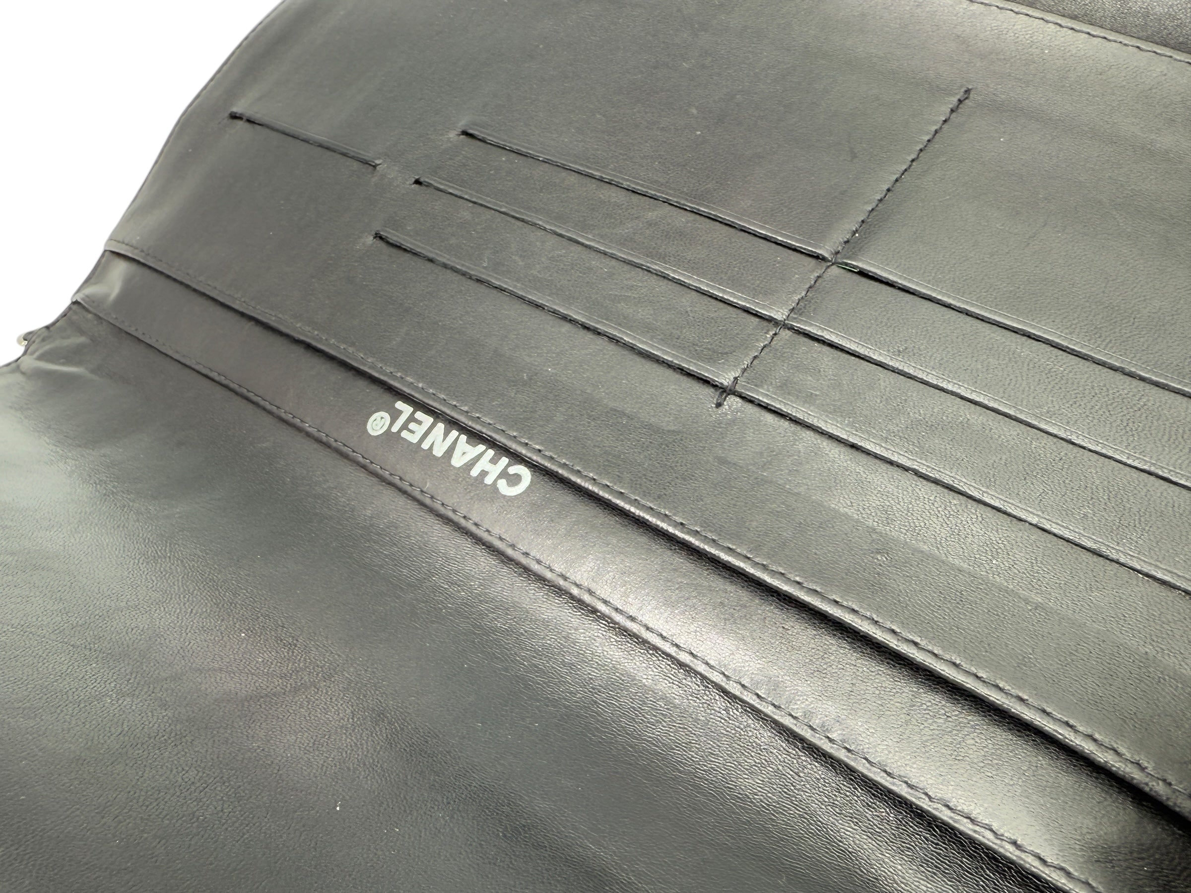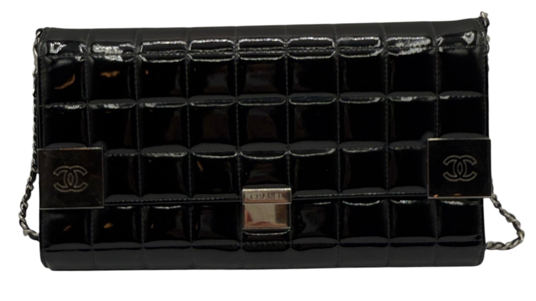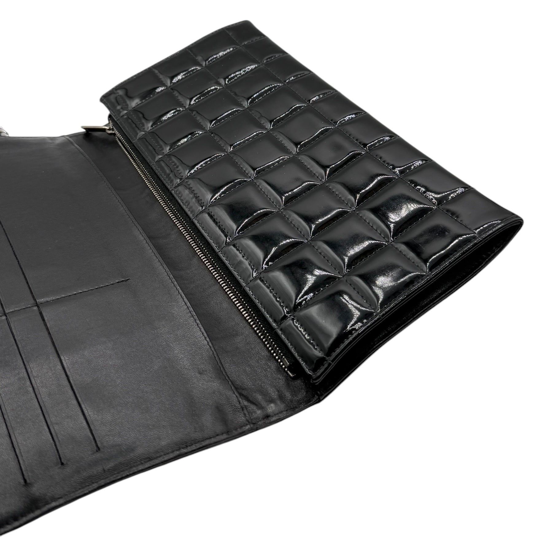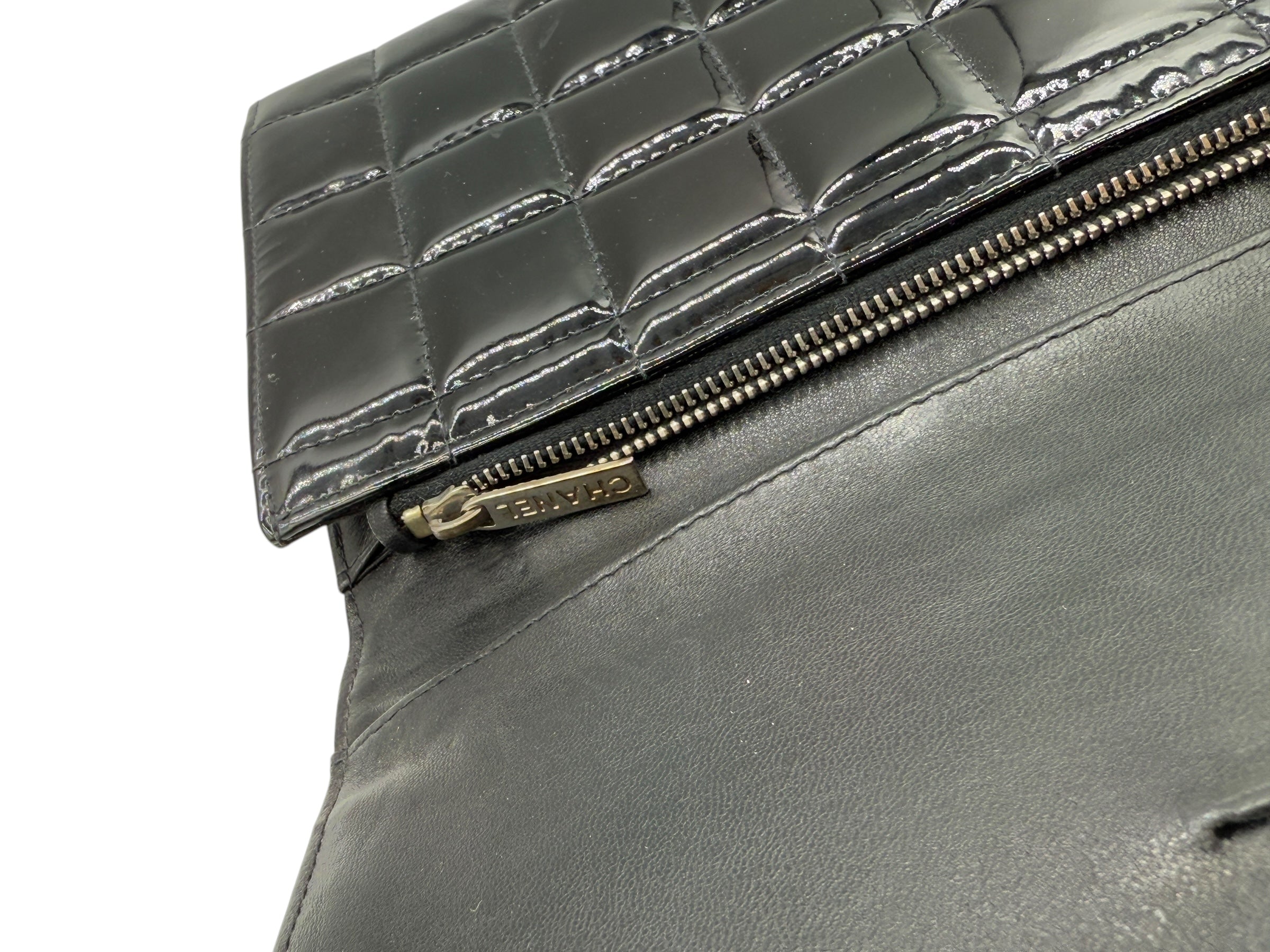 This fabulous Chanel bag has a quilted black patent leather exterior and flap style opening with one snap closure. It has black leather interior with two open top pockets on the back interior. The strap is the classic woven black leather and silver chain with a clasp on one end of the chain to adjust the strap length or style. It also comes with original dust bag!