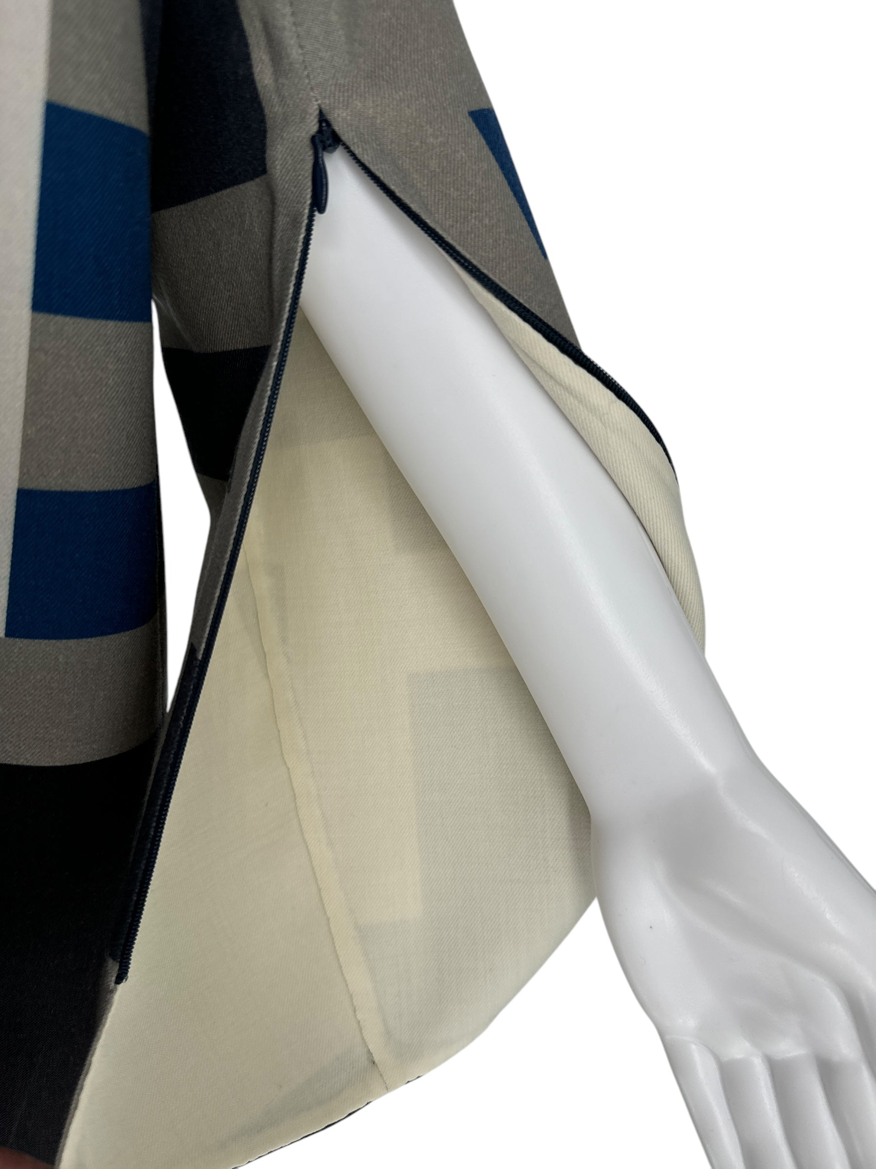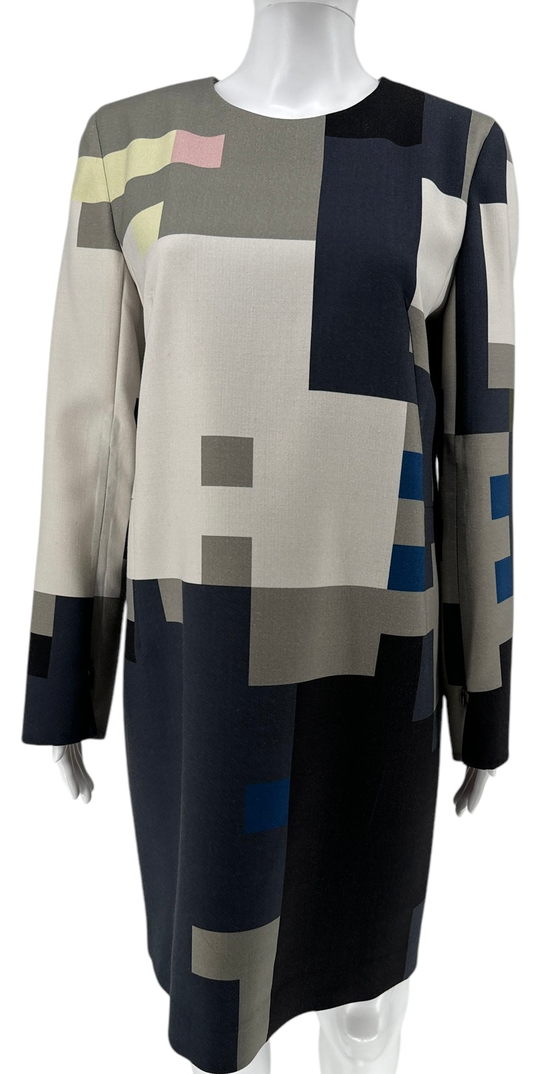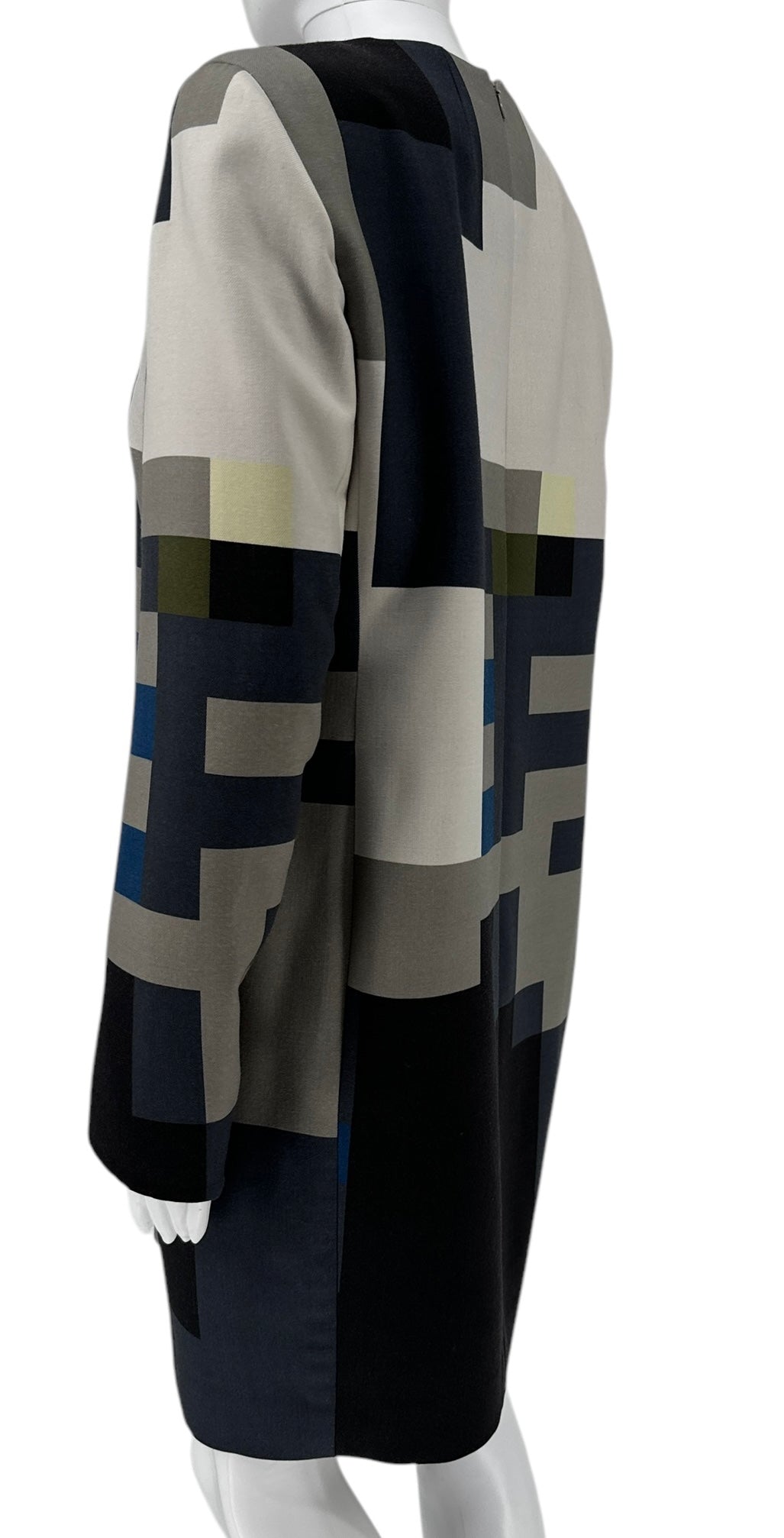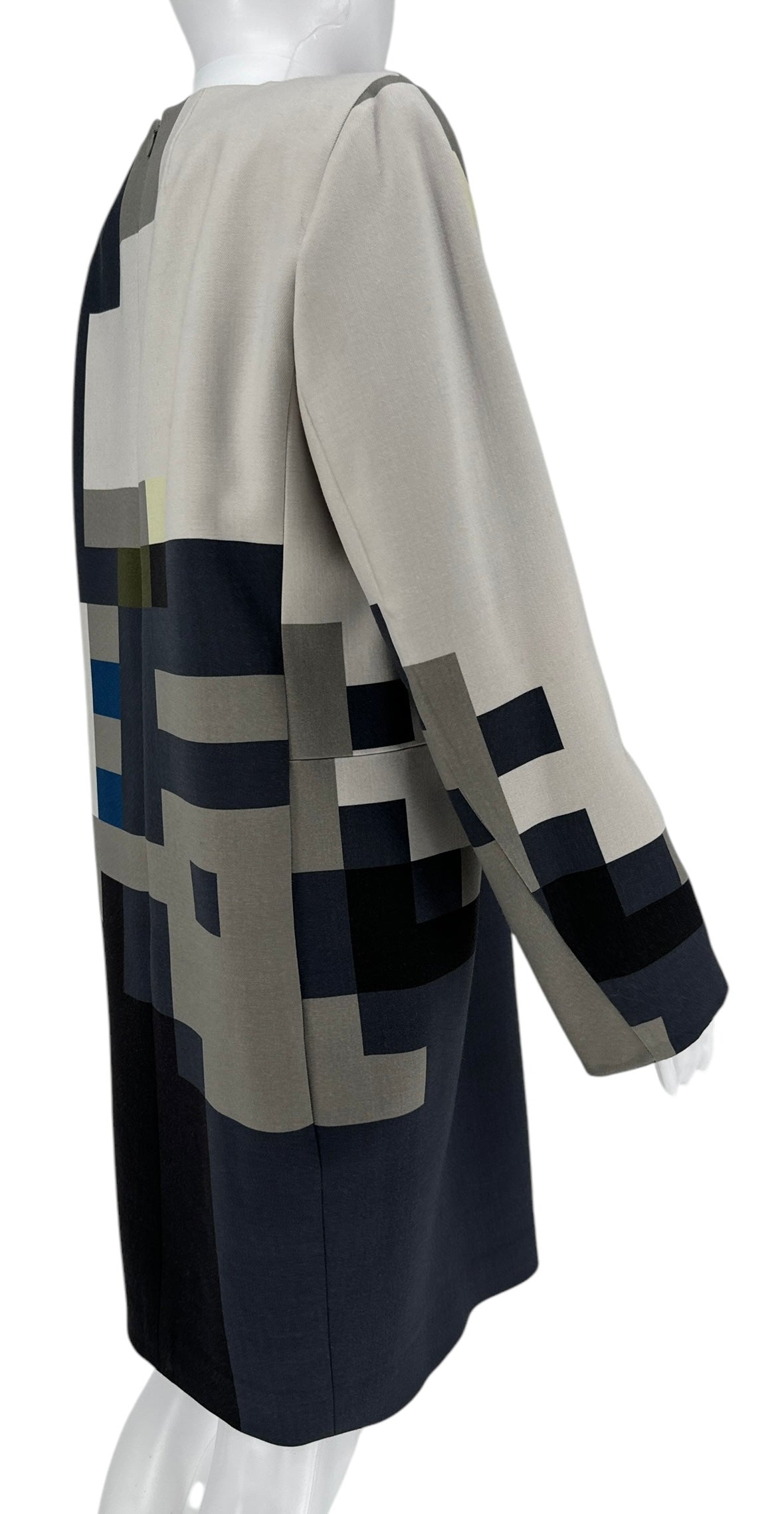 This Pixelated-Print Sheath Dress is a Classic dress styled with a sleek round neck and long sleeves. This design features side zip pockets and vented cuffs.