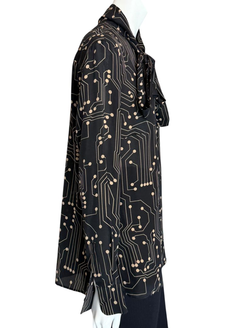 Details: Self-tie bow neckline, long sleeves with button cuffs, circuit-inspired print, fluid drape