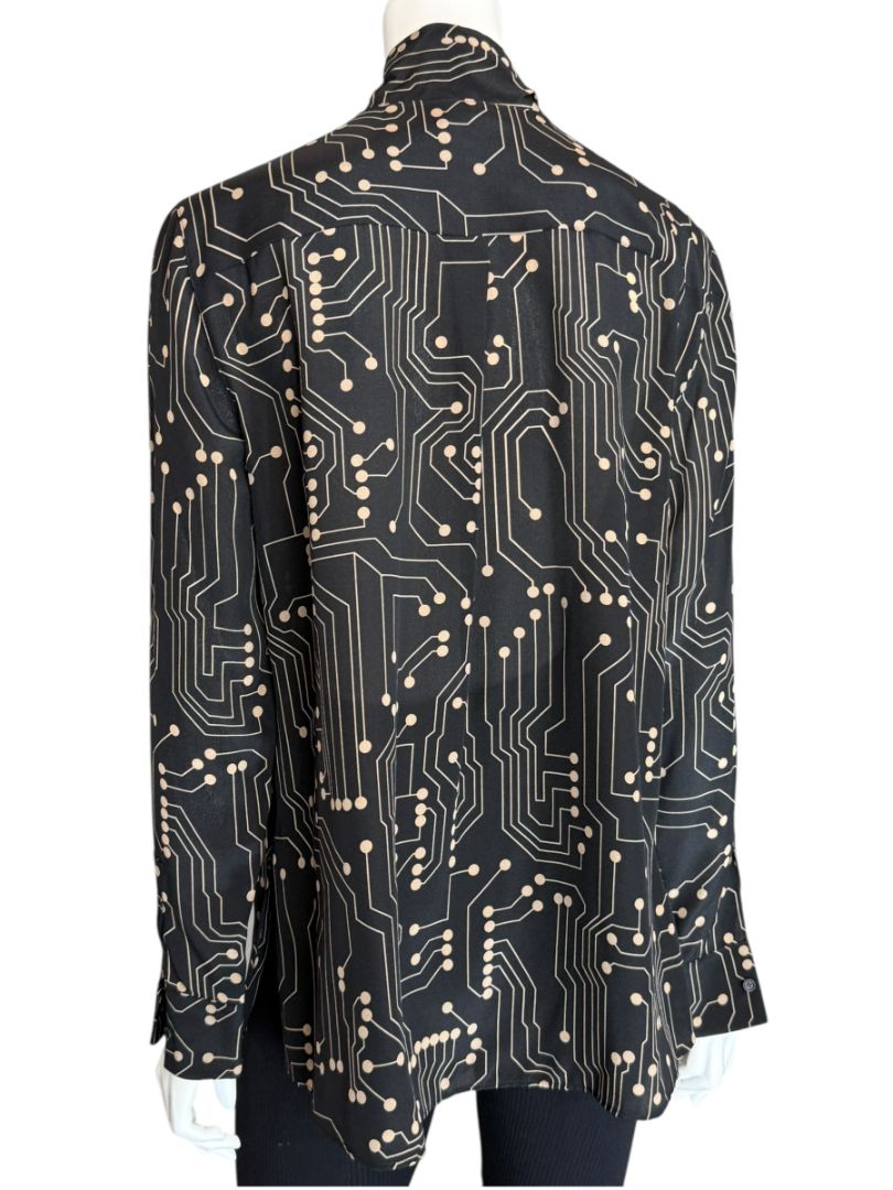 Elevate your wardrobe with this striking Akris Punto blouse, crafted from 100% mulberry silk in a sleek black and sand circuit-inspired print. Designed with a modern tie-neck bow, button cuffs, and a fluid silhouette, it blends innovative design with timeless sophistication. Perfect for styling with tailored trousers for work or a sharp pencil skirt for evening, this versatile piece embodies Akris’ contemporary elegance.