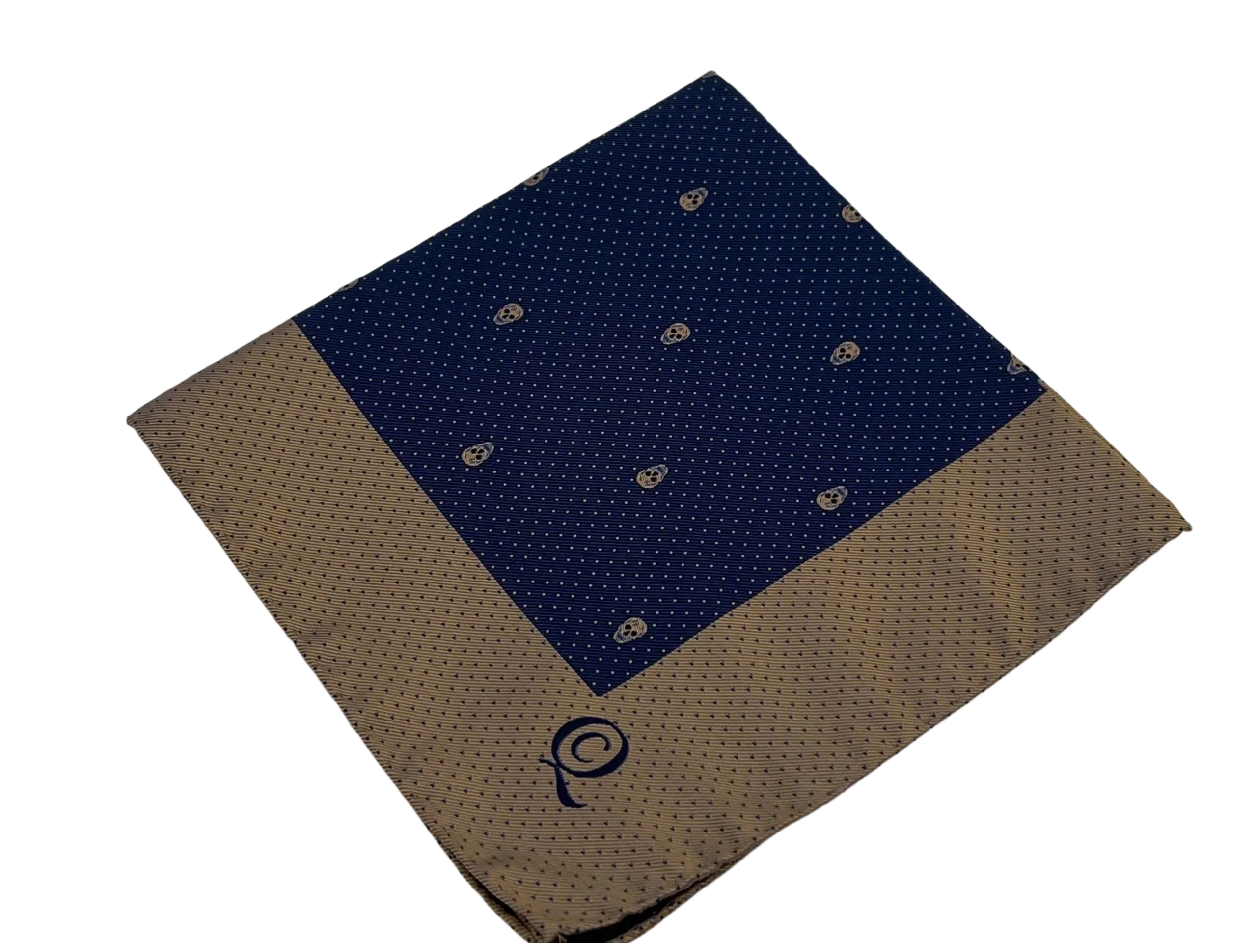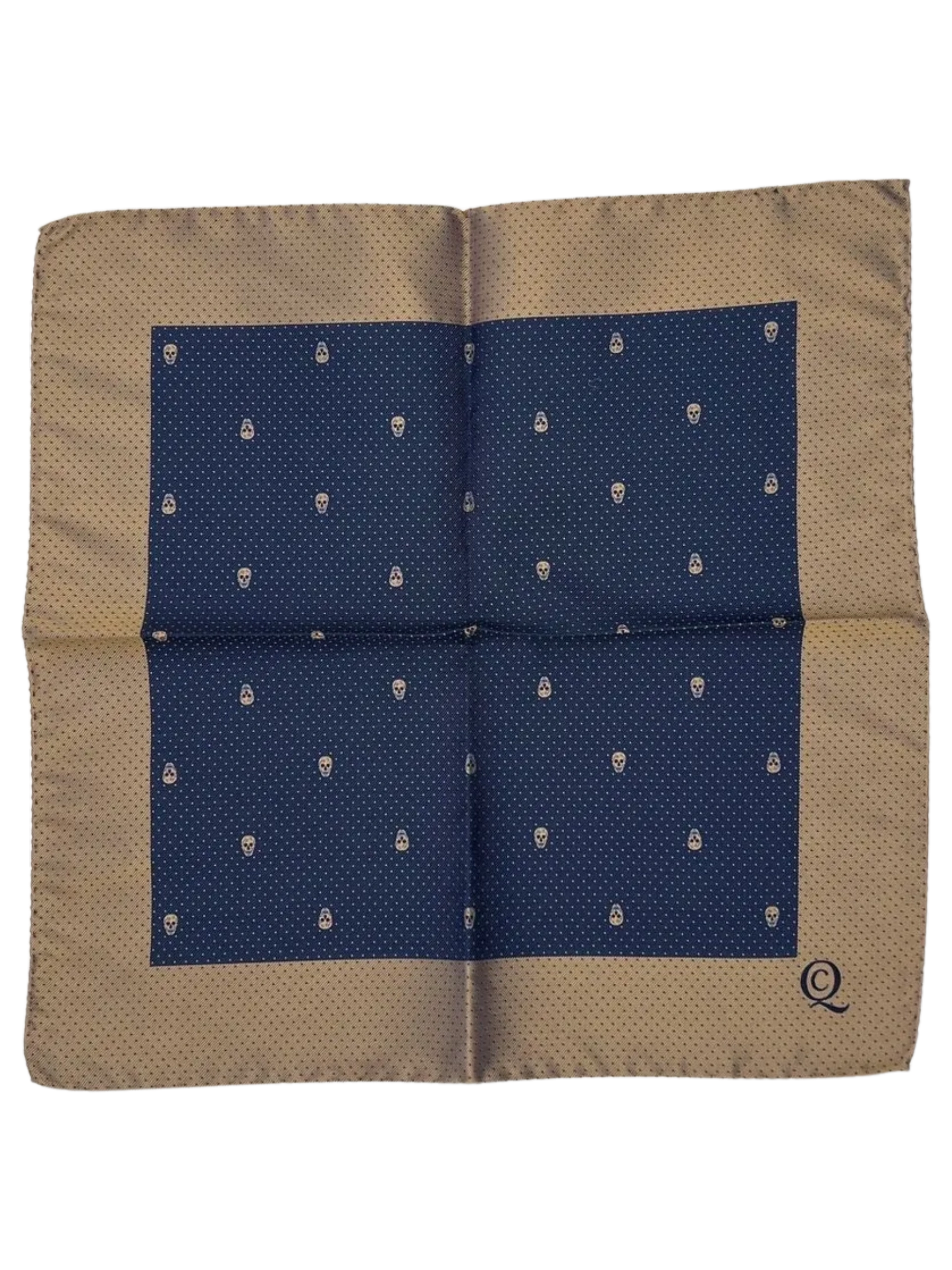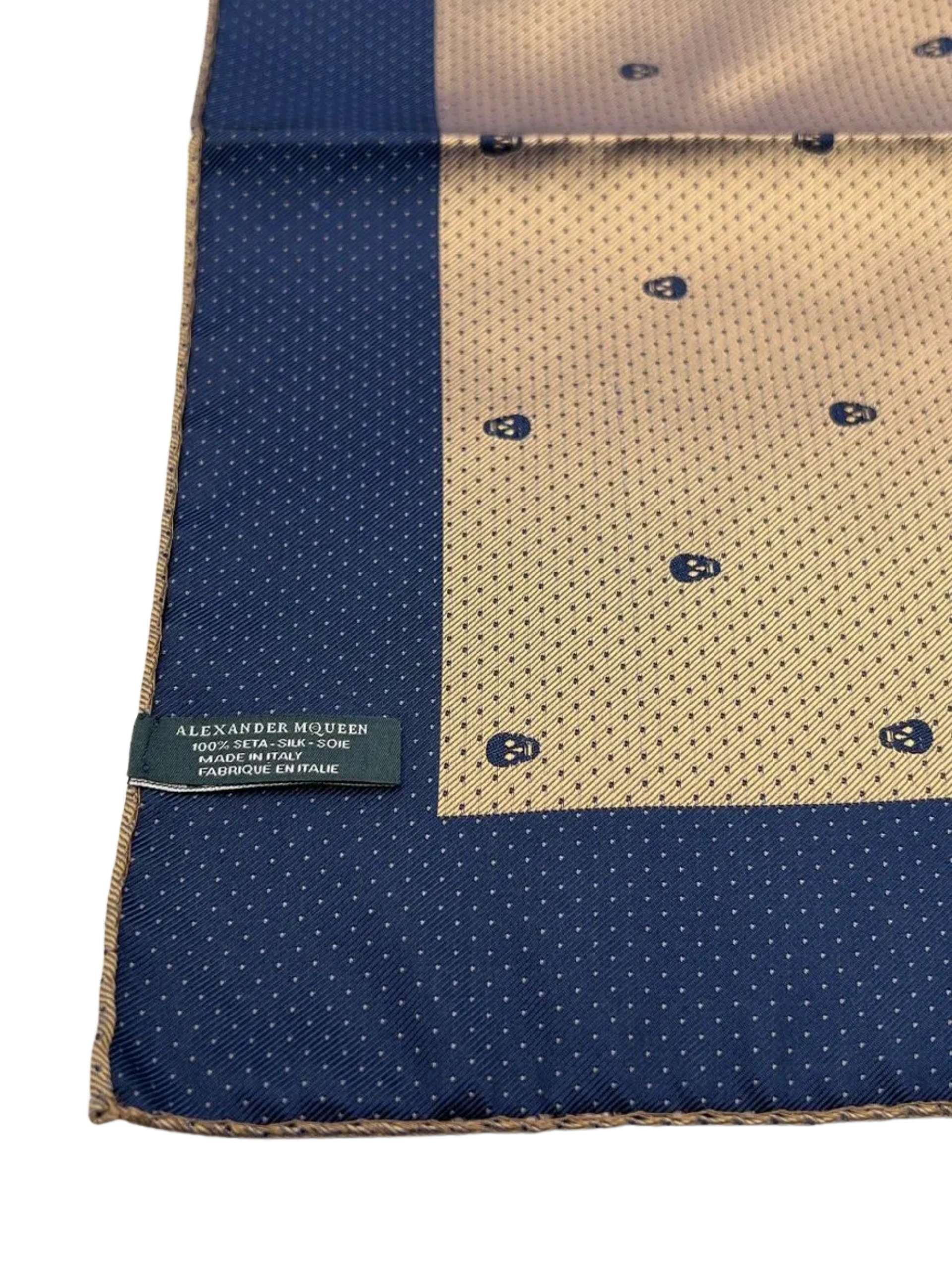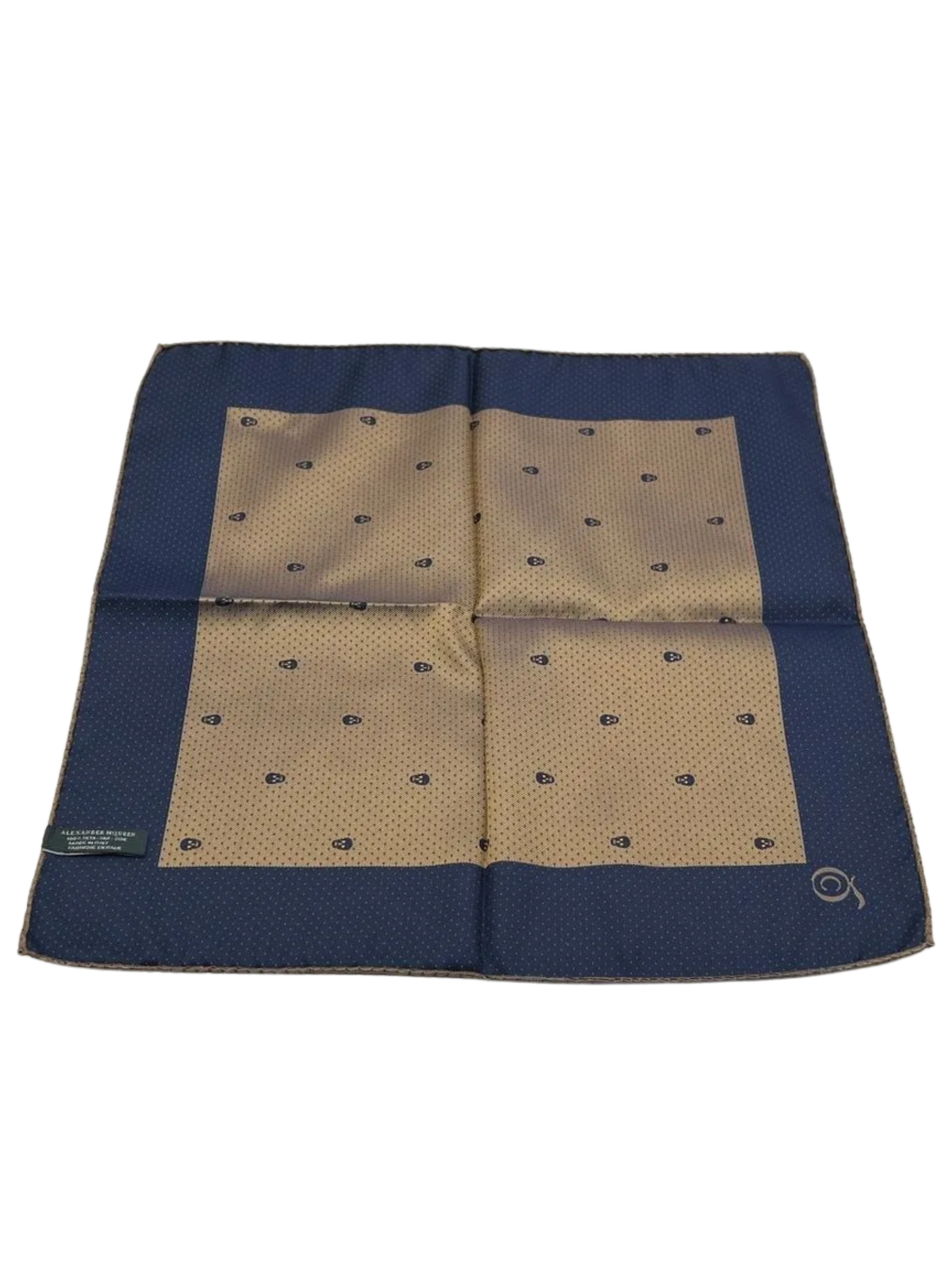 Alexandr McQueen Pocket Square, excellent condition, 13" x 13" Square, 100% Silk, Blue with a champagne color.