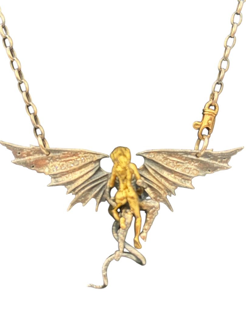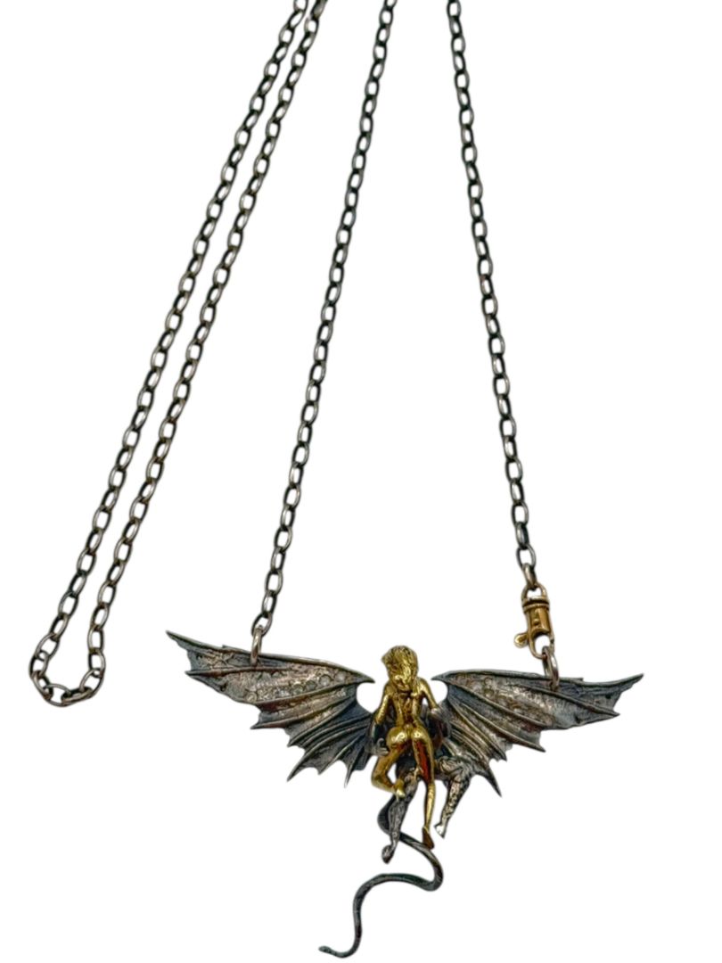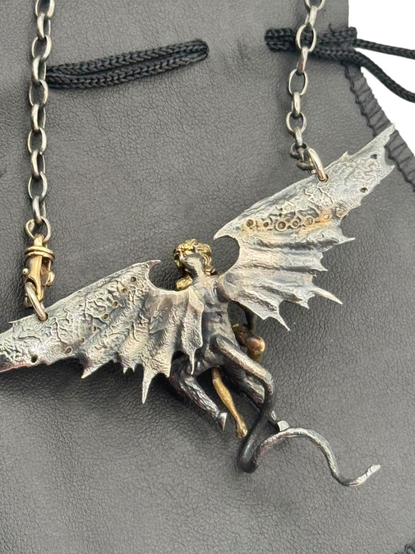 Alp Sagnak Angel & Devil Necklace with Spread Wings – 18K Gold, Oxidized Silver & Diamonds