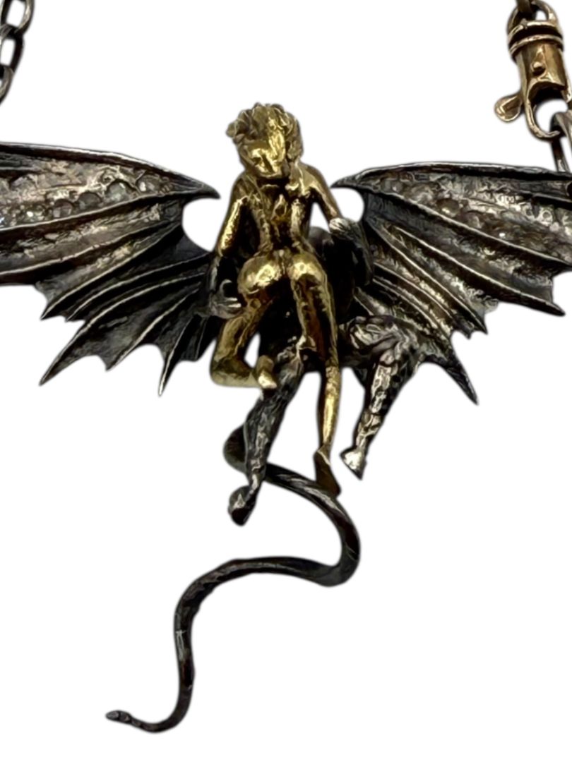 A striking and highly sculptural fine jewelry piece by Alp Sagnak, this dramatic Angel and Devil Necklace captures the duality of good and evil through intricate craftsmanship and symbolic design. The pendant features a beautifully detailed oxidized silver devil figure with outstretched wings set with sparkling diamonds, while an 18K gold angel figure rests above, creating a powerful visual contrast between light and shadow.