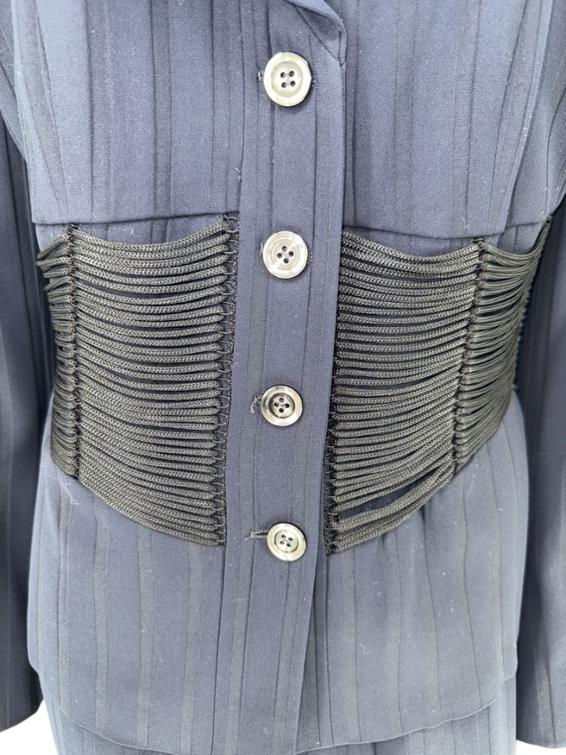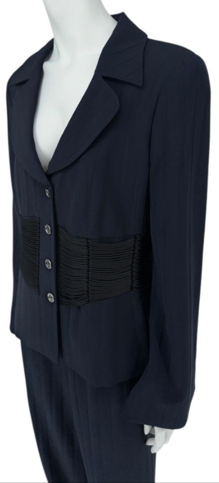 This structured navy pantsuit from Armani Collezioni combines classic tailoring with bold, modern detailing. Crafted in Italy, the suit features a subtle tonal pinstripe and a sculpted silhouette, anchored by a dramatic corset-style waist trim that adds architectural definition and feminine edge.