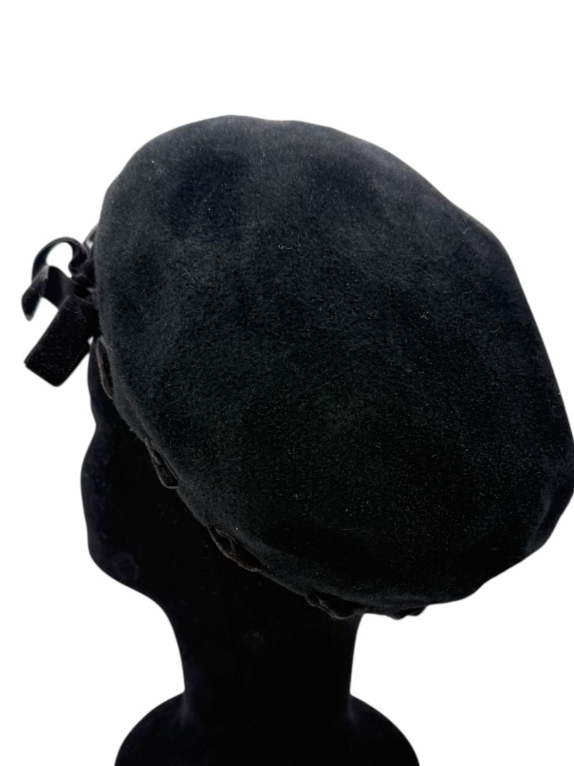 Tracy Watts Black Wool Beret with Velvet Ribbon Trim