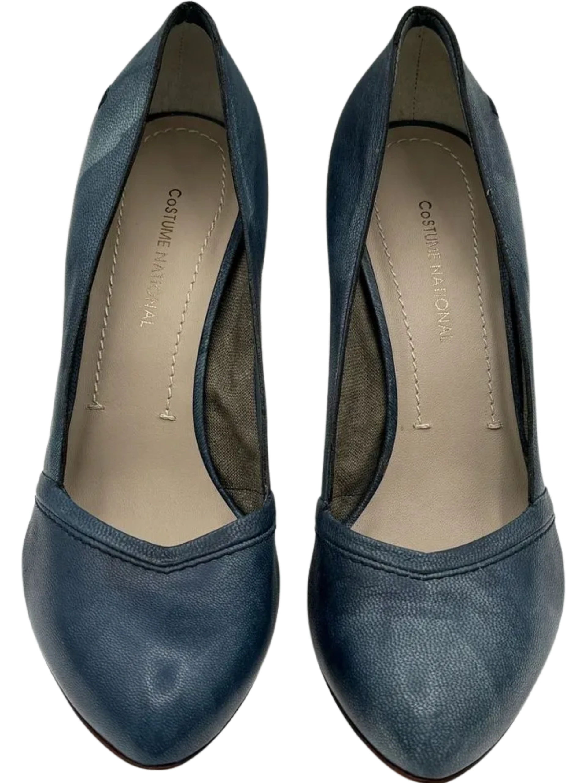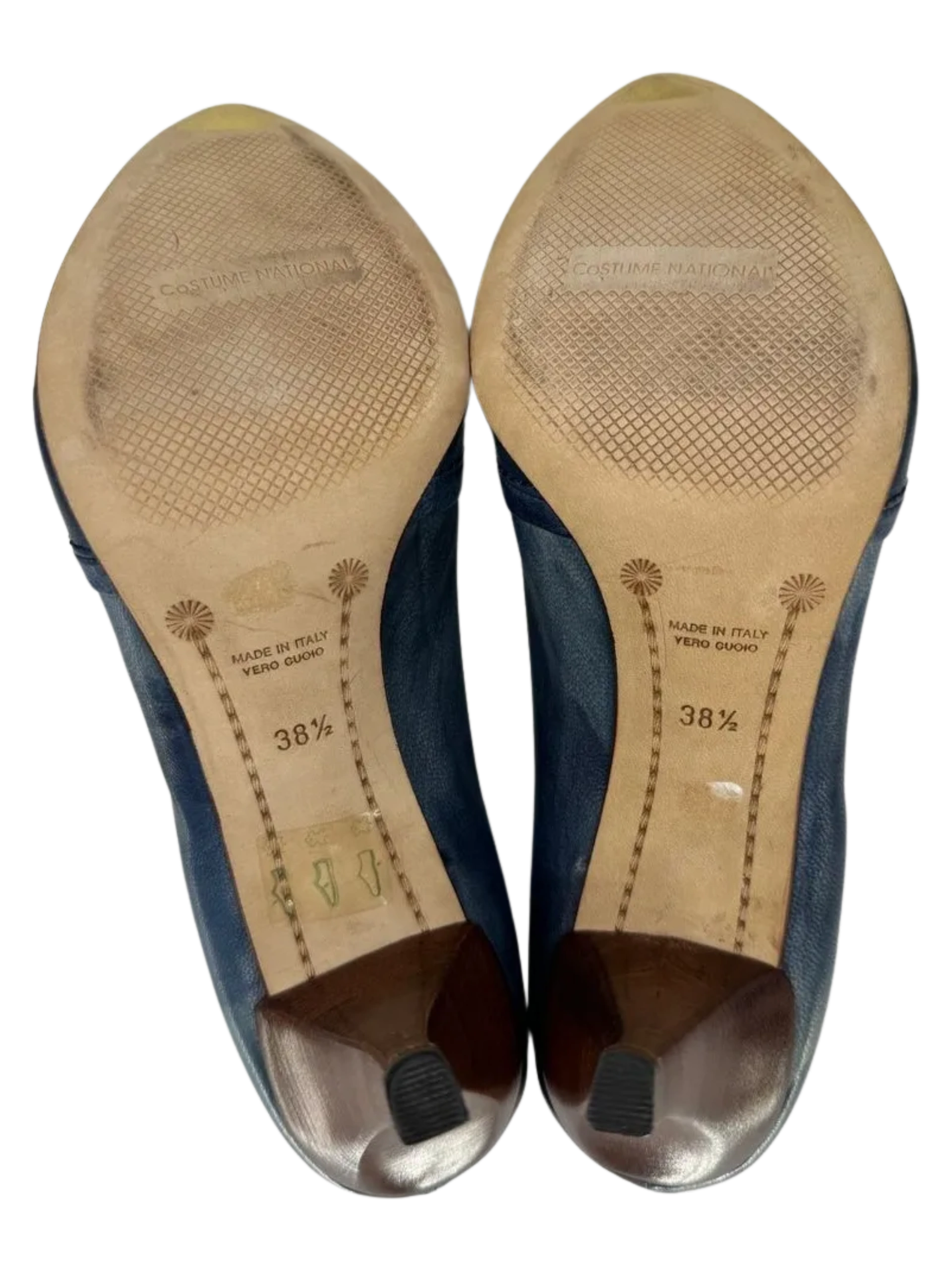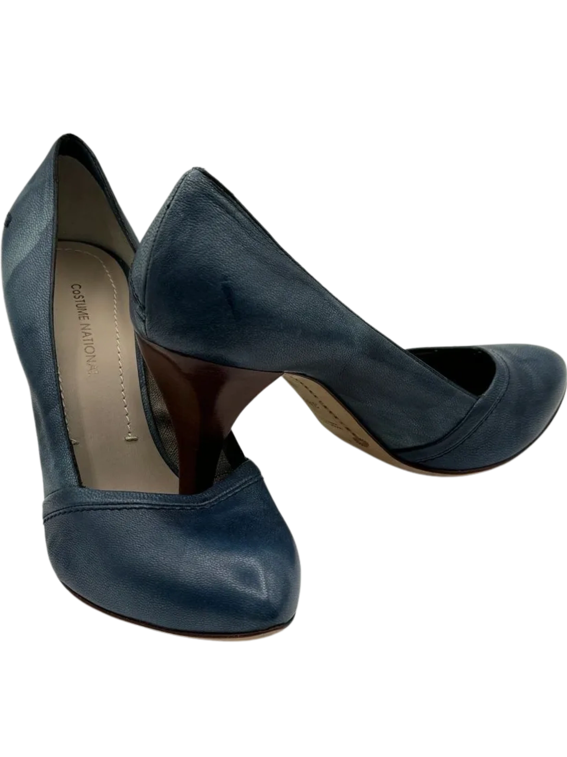 Brand New in box Denim Blue leather CoSTUME NATIONAL pumps, Wooden Heel, Made in Italy, Size 38.5, 3.25" Heel height, Comes with Dust bag and box. Shoes are in Excellent Condition and make a great neutral wardrobe staple.