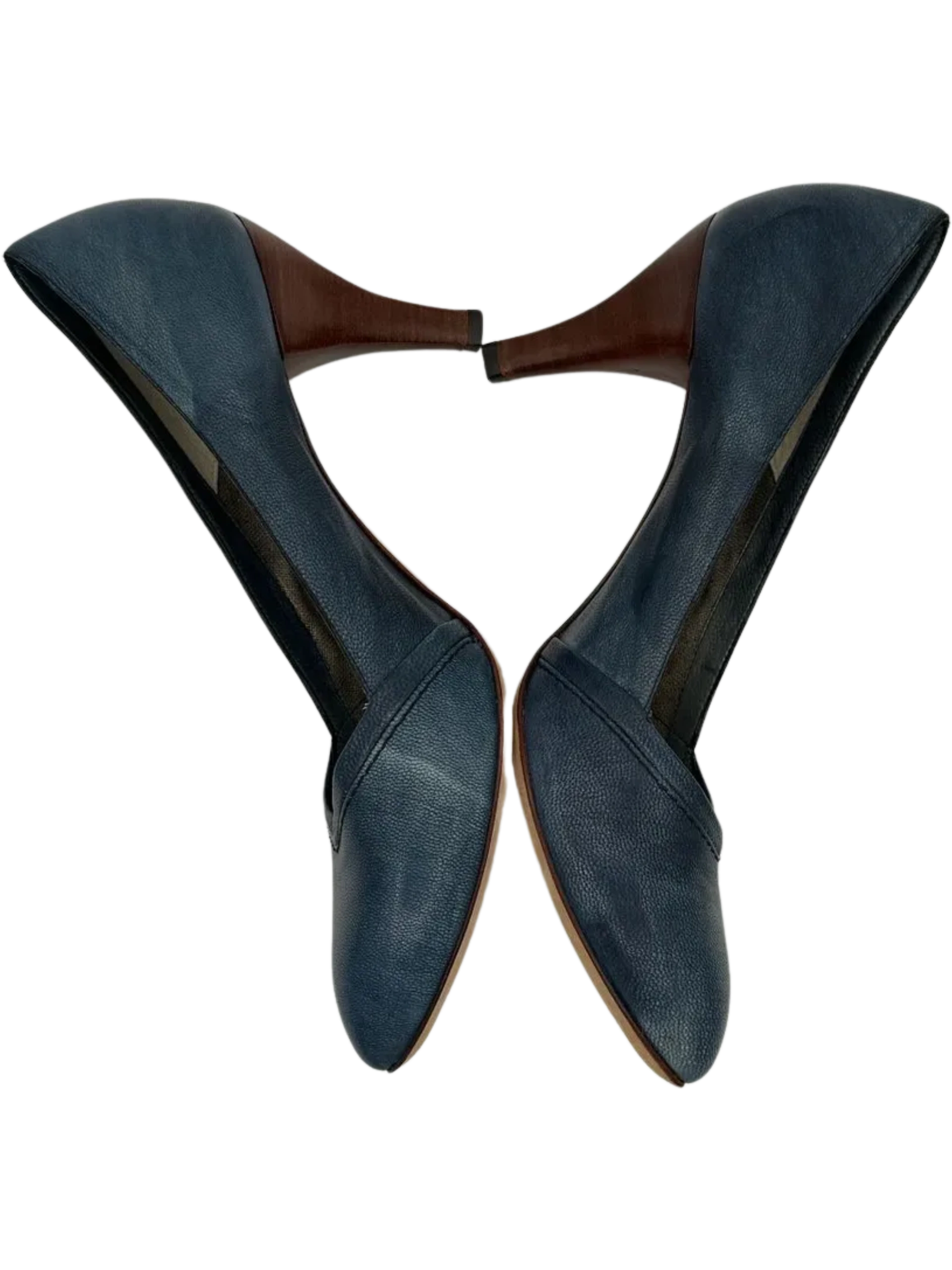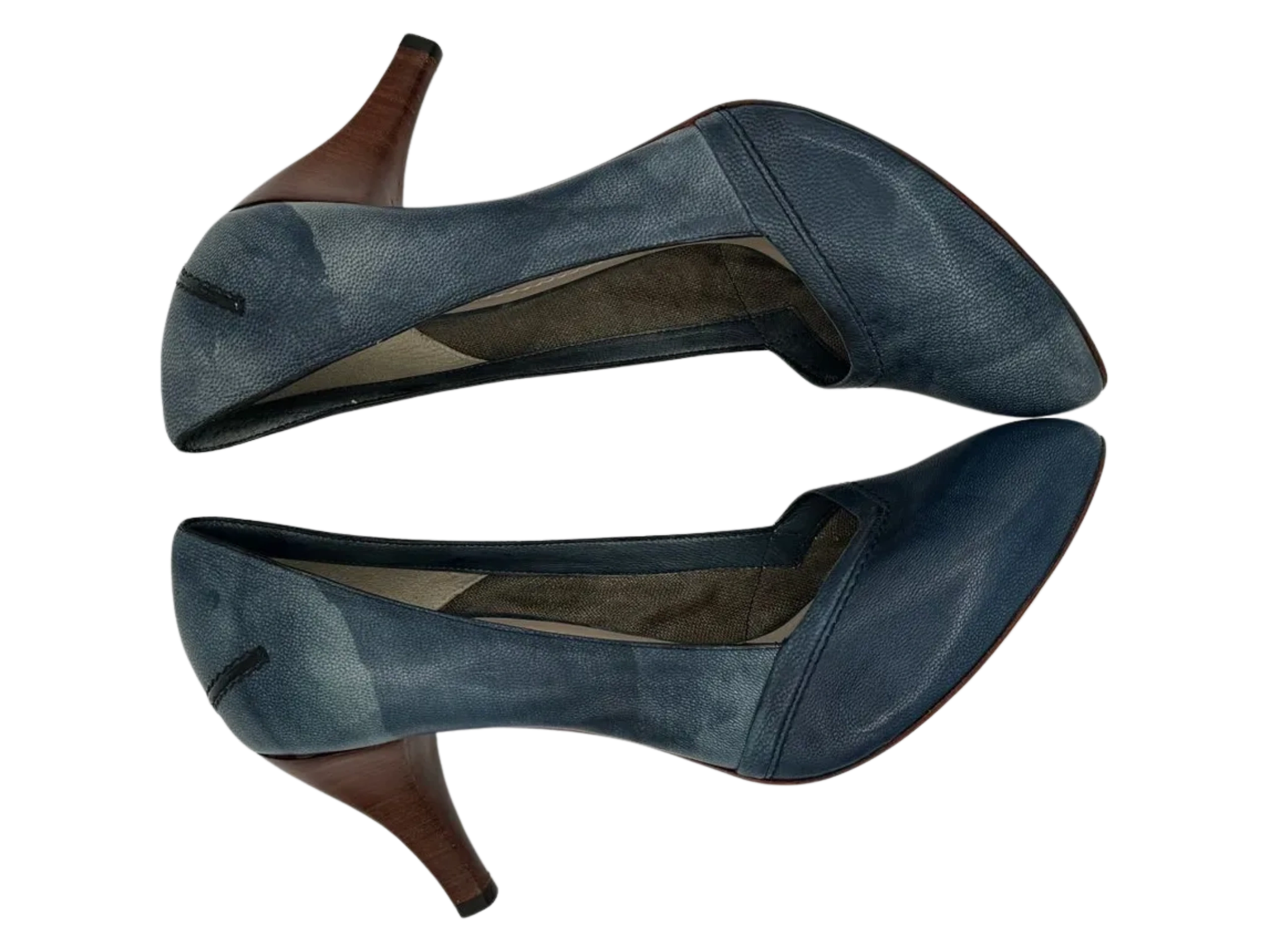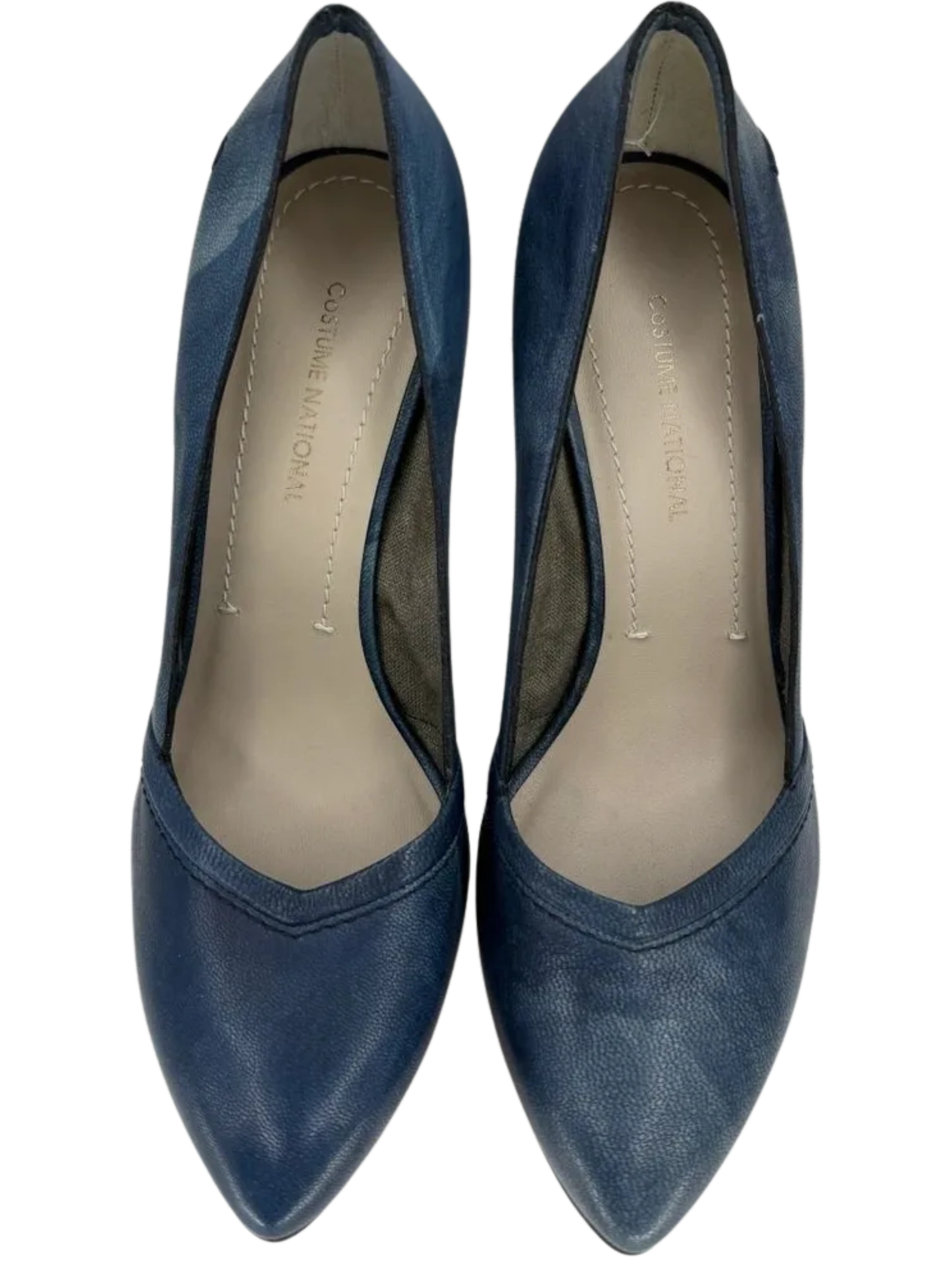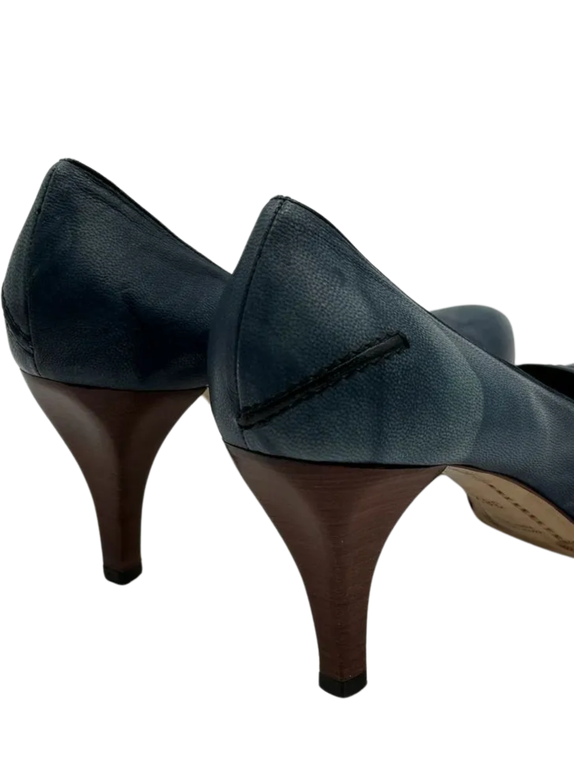 Brand New in box Denim Blue leather CoSTUME NATIONAL pumps, Wooden Heel, Made in Italy, Size 38.5, 3.25" Heel height, Comes with Dust bag and box. Shoes are in Excellent Condition and make a great neutral wardrobe staple.