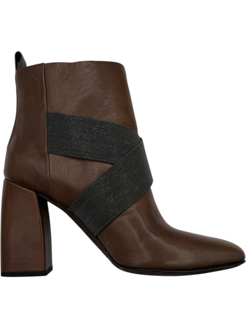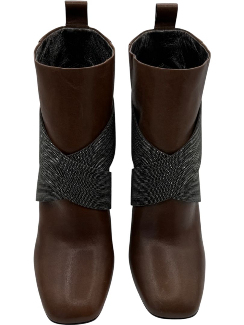 Brunello Cucinelli Brown Leather Ankle Boots with Criss-Cross Monili Straps – Size 39