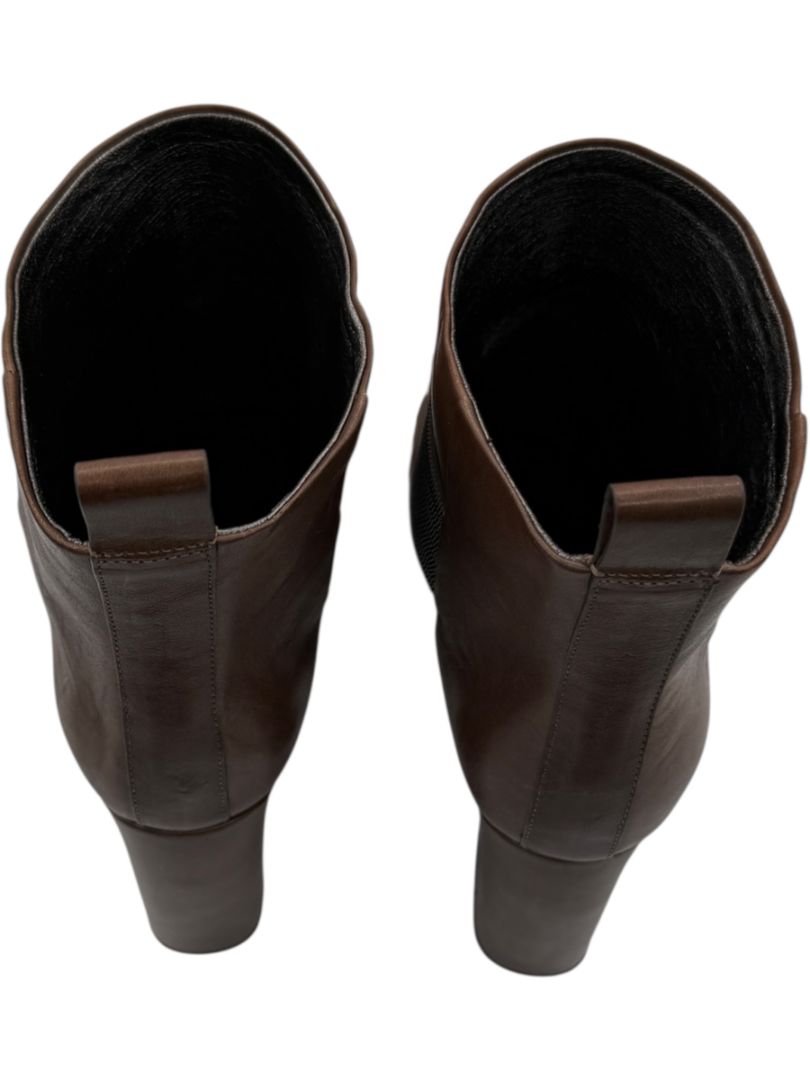Refined elegance meets quiet luxury in these Brunello Cucinelli ankle boots, crafted in smooth brown calfskin and adorned with the house's iconic Monili beading. The crossover elastic straps provide both a tailored silhouette and flexible comfort, while the structured block heel delivers a modern yet timeless edge. A subtle square toe and sleek pull-on tab complete the elevated Italian craftsmanship.