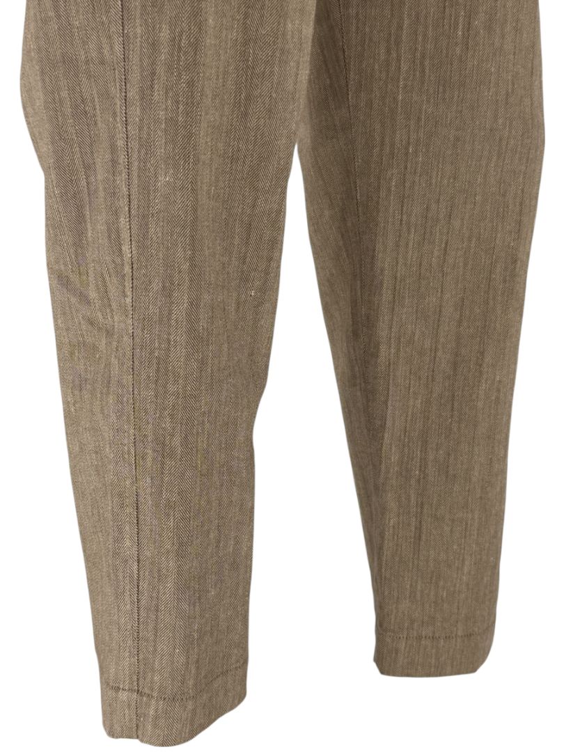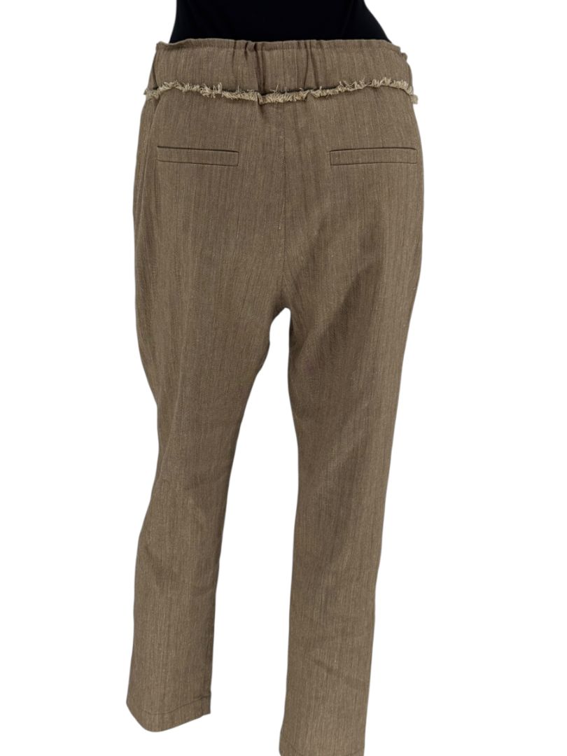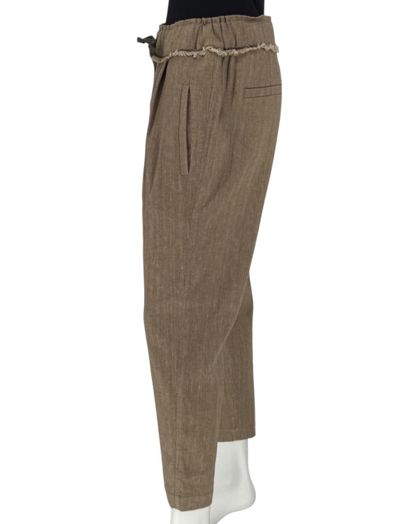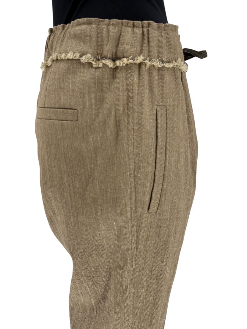 Relaxed yet refined, these Brunello Cucinelli trousers combine effortless comfort with understated luxury. Crafted in a taupe herringbone weave, they feature a high elasticized waistband with raw-edge trim detailing and a tonal drawstring tie. The tapered leg and subtle pleating offer a contemporary silhouette, while the back and side slit pockets add a tailored finish. Perfect for pairing with a crisp blouse or a lightweight knit for elevated everyday style.