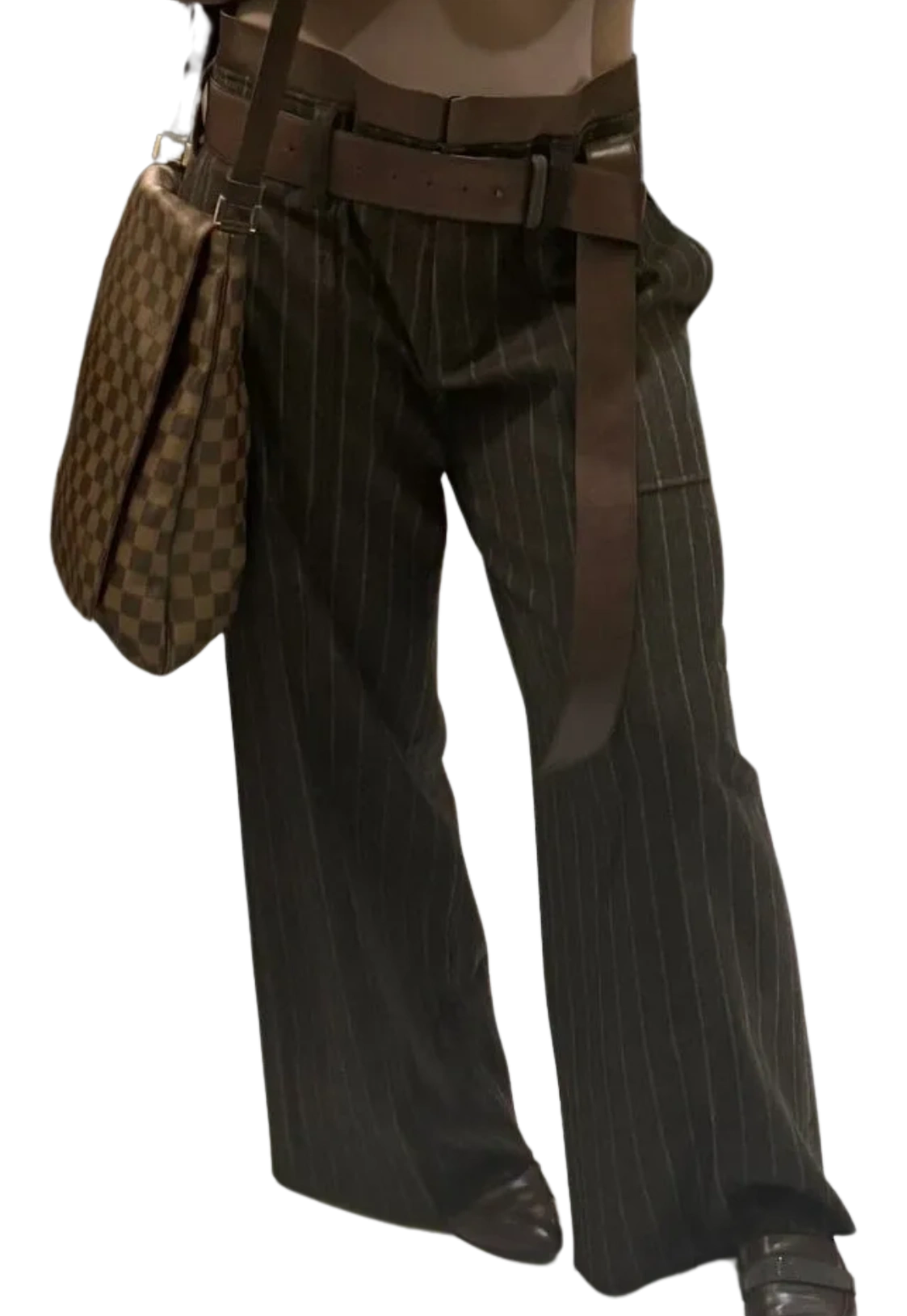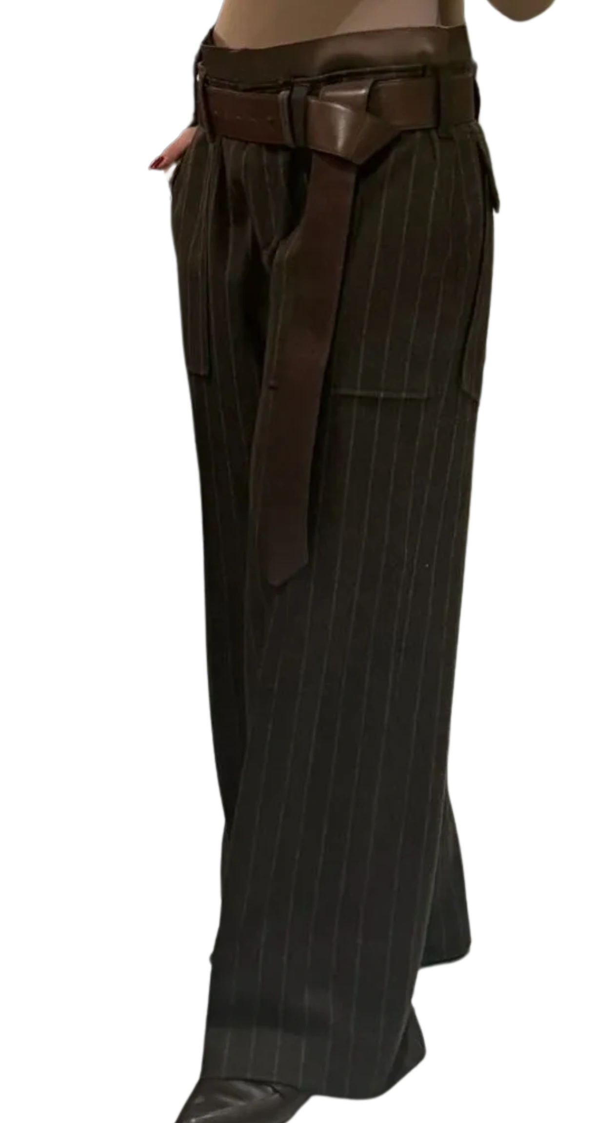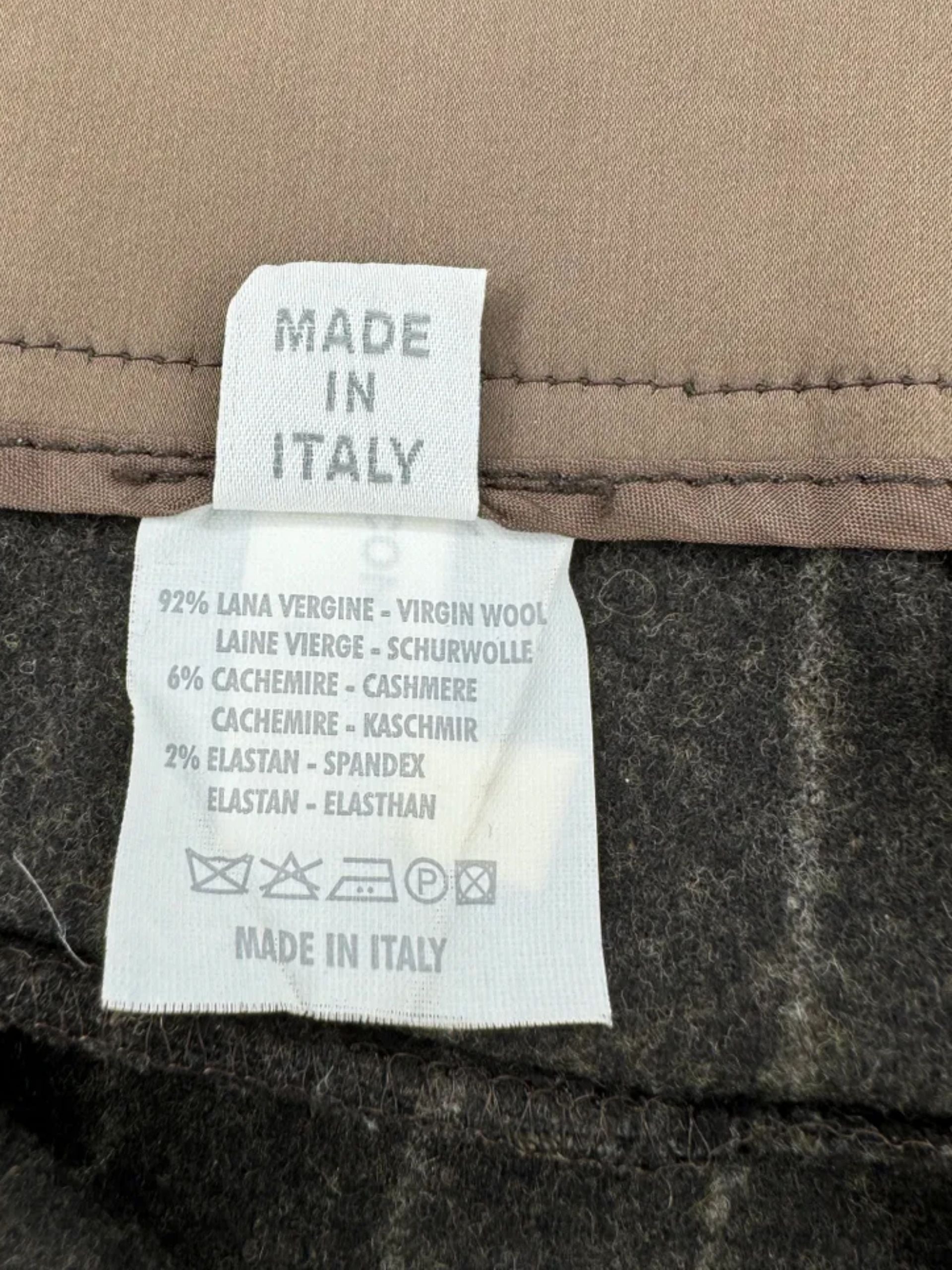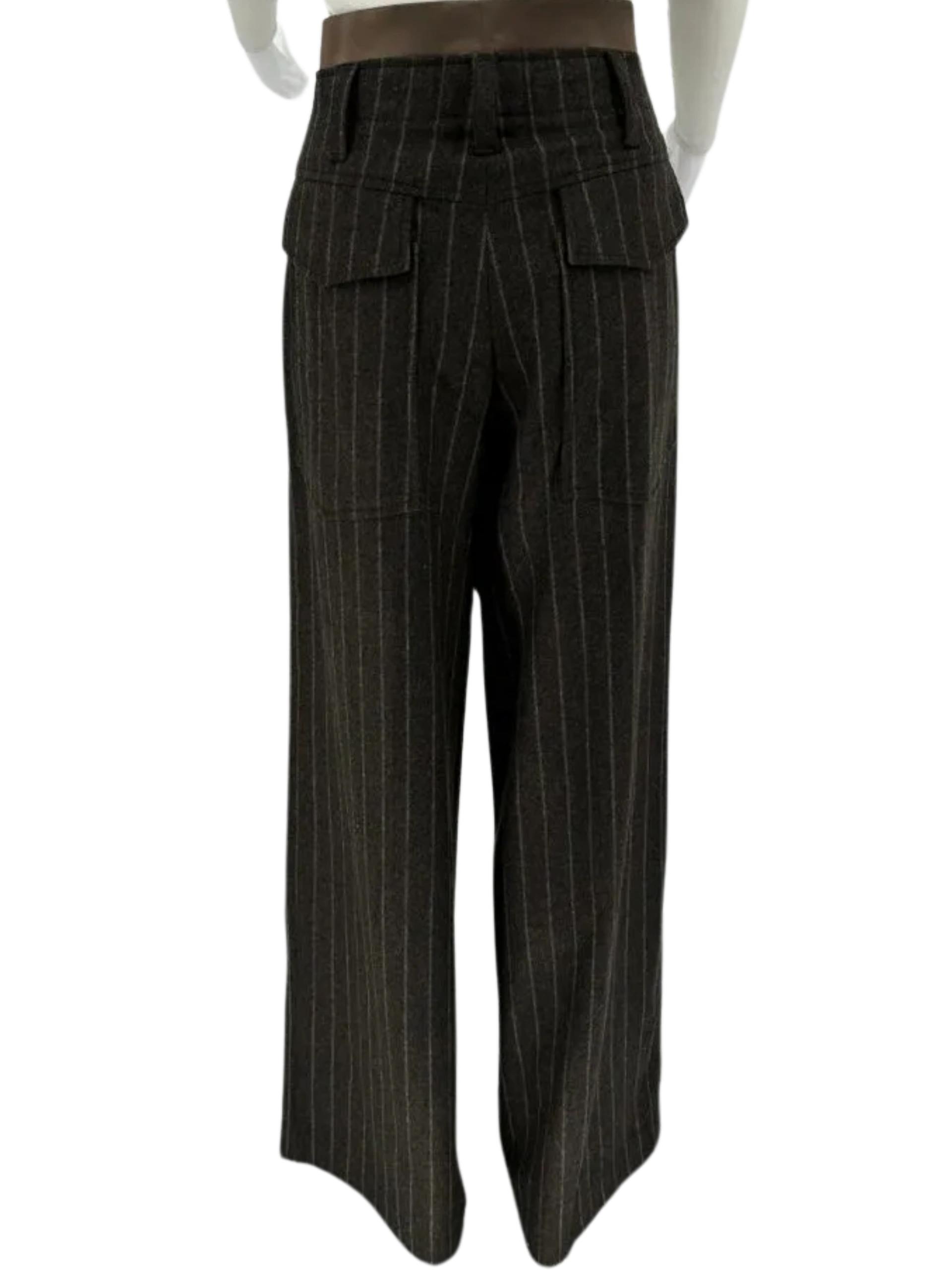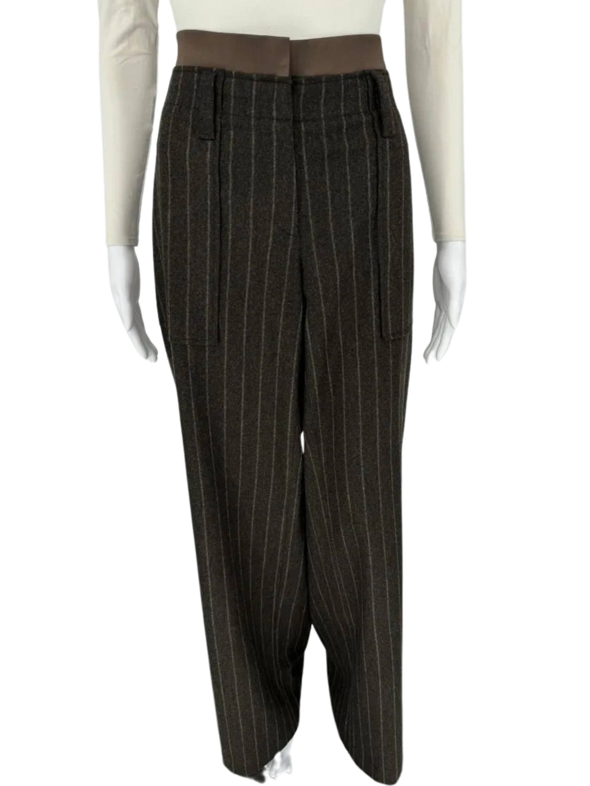 Cocoa colored pinstriped Brunello Cucinelli trousers. They are a wide and relaxed fit, made of 92% virgin wool, 6% Cashmere and 2% Elastane. Mid Rise, Front flit pockets, Zip and Button Closure, 2 rear pockets, wide belt loops, satin style trim at waist band. In excellent condition. Made in Italy. Size: 12 Measurements: Hip: 24" Waist: 17.5" Rise: 11" Inseam: 34.5" Length: 44.5" Leg opening: 12.5"