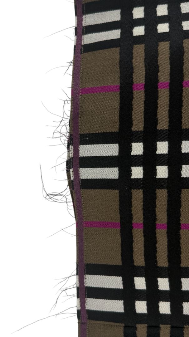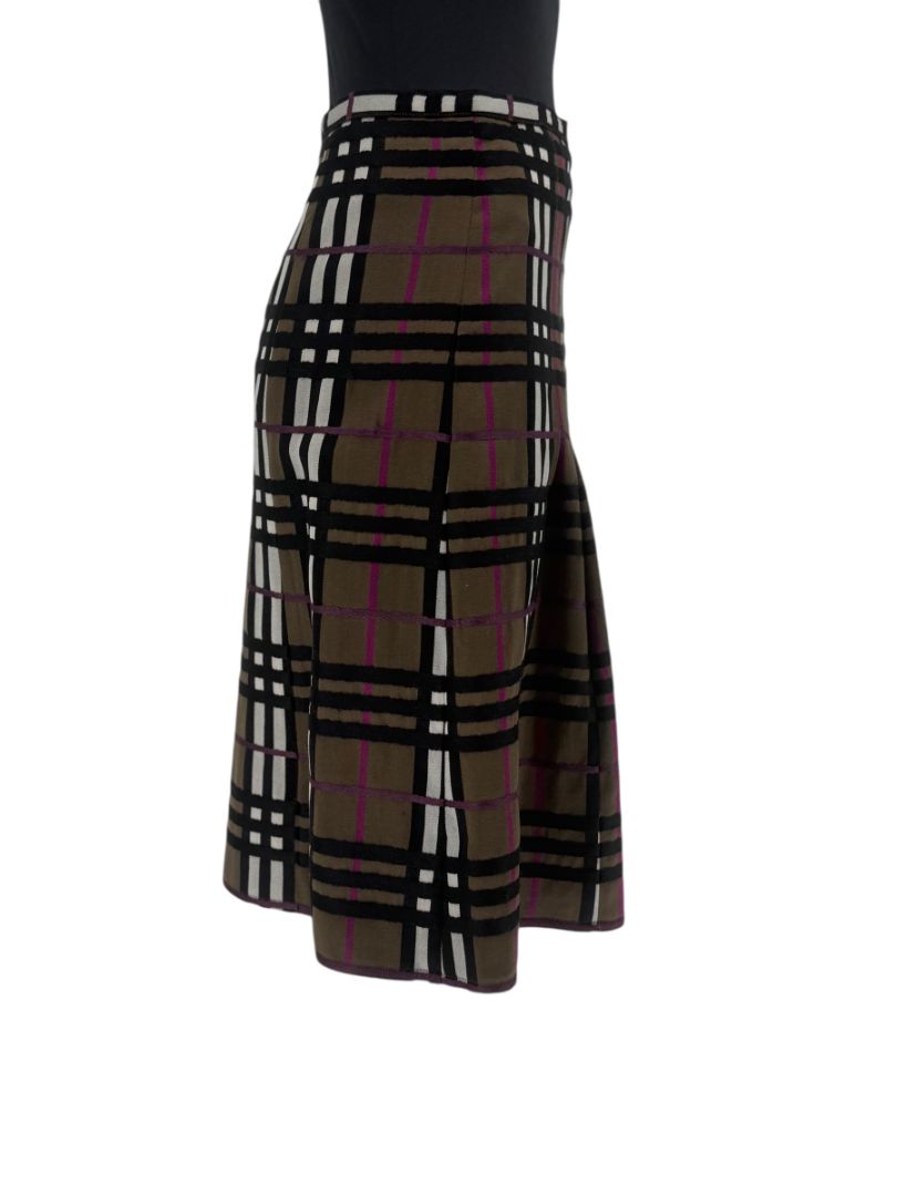 A classic silhouette with a modern edge. This Burberry London skirt features the brand’s iconic check pattern in earthy tones accented with deep magenta stripes. Crafted from 100% lambswool and fully lined in 100% silk for a smooth feel, it’s designed with a flattering A-line shape and subtle pleats that move beautifully with every step. Finished with a frayed hem and a concealed side zipper for a clean, tailored look. Made in Italy.