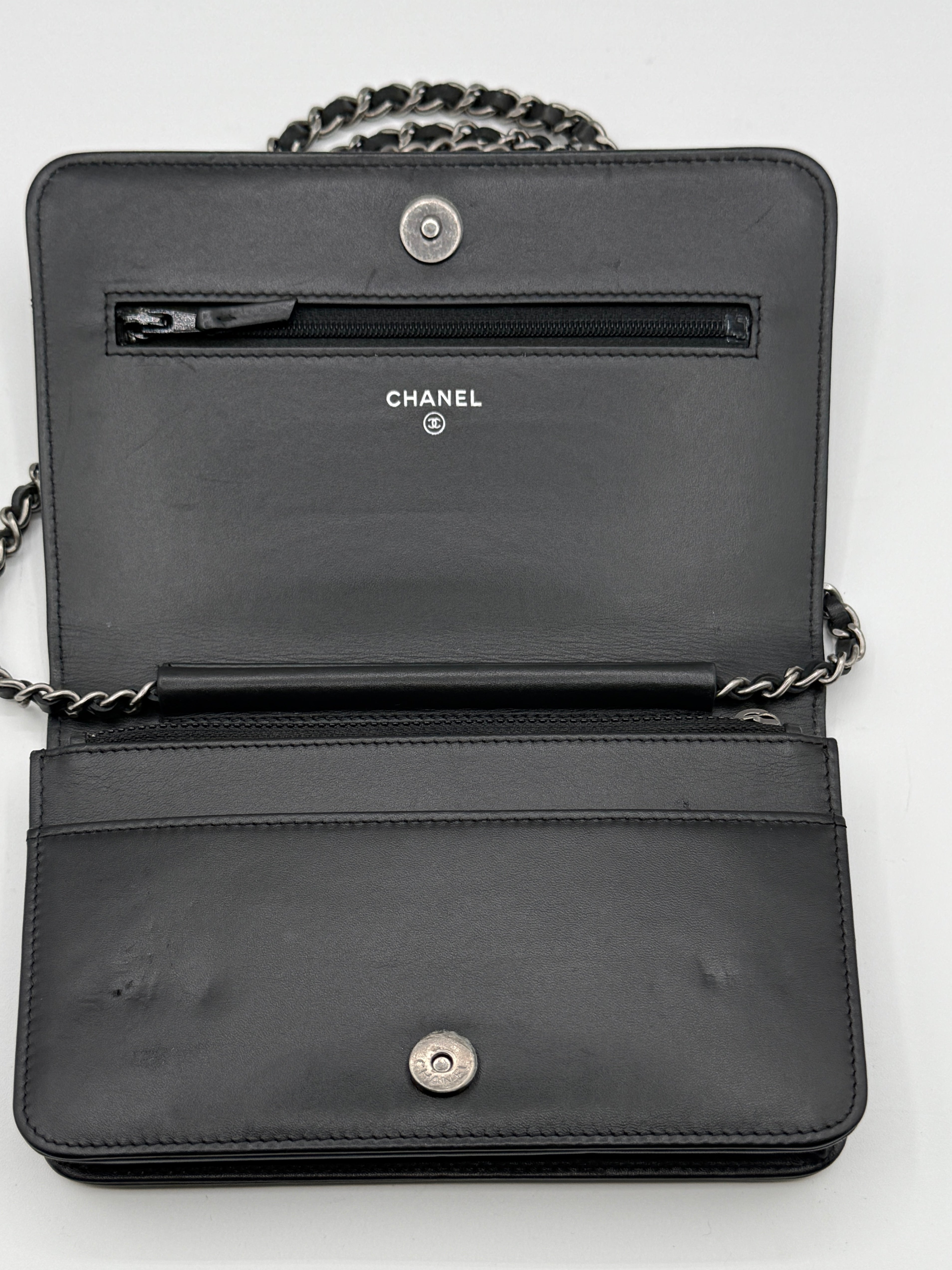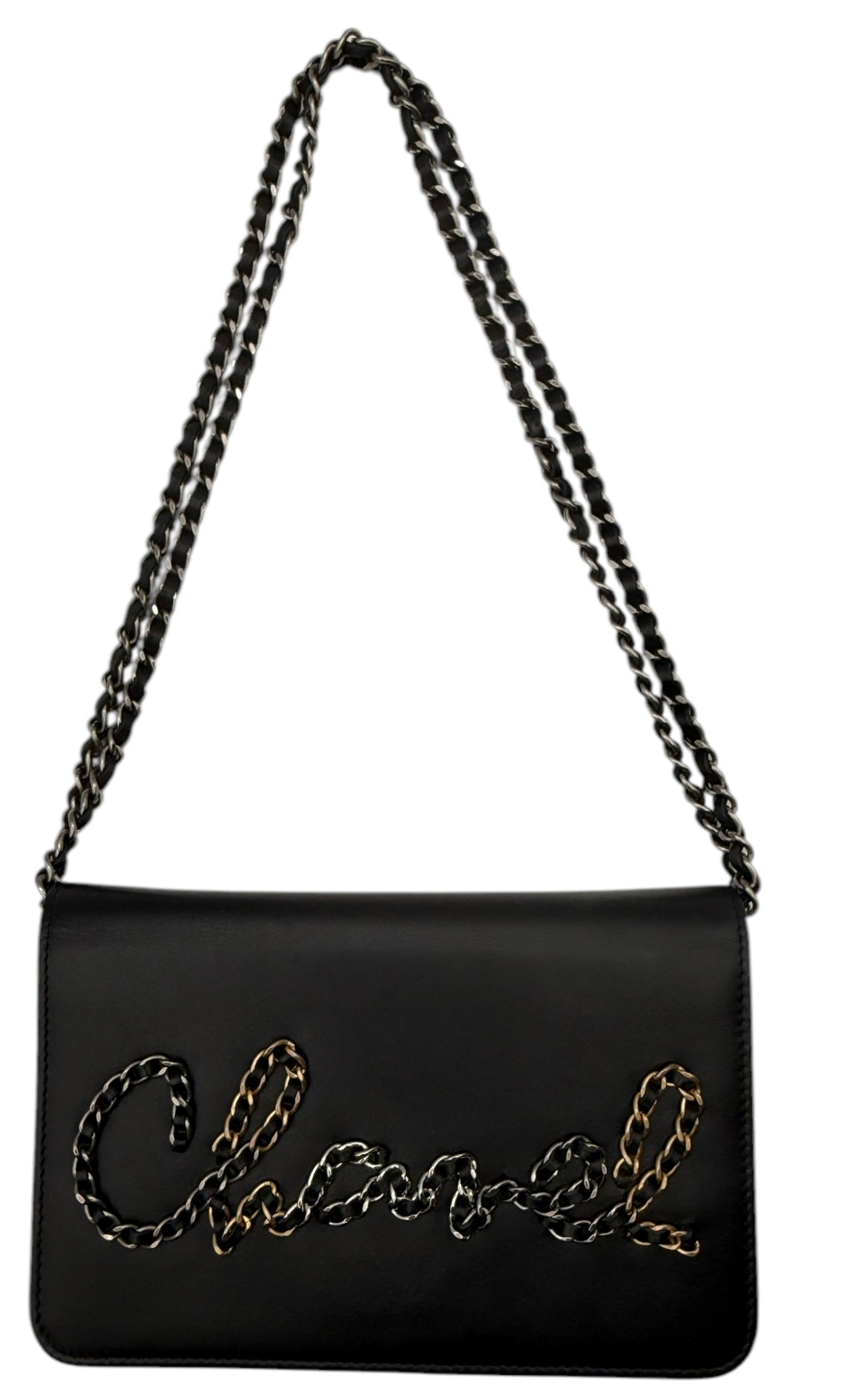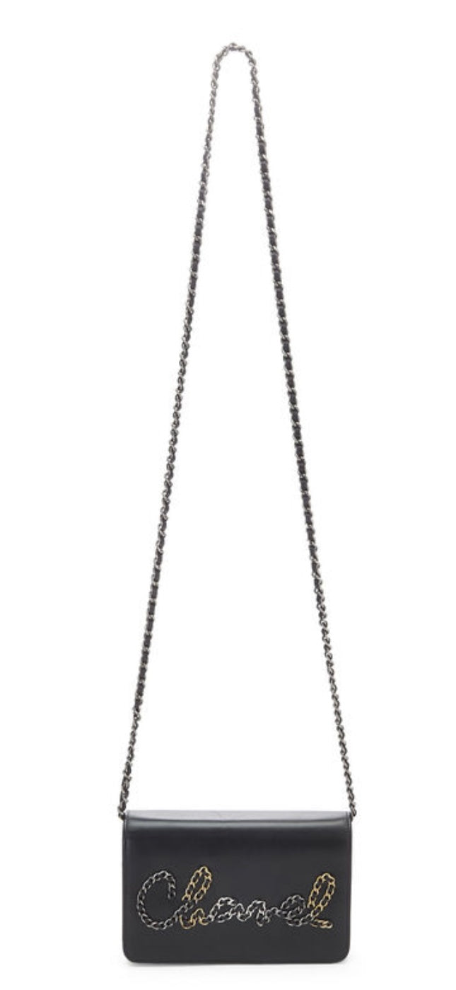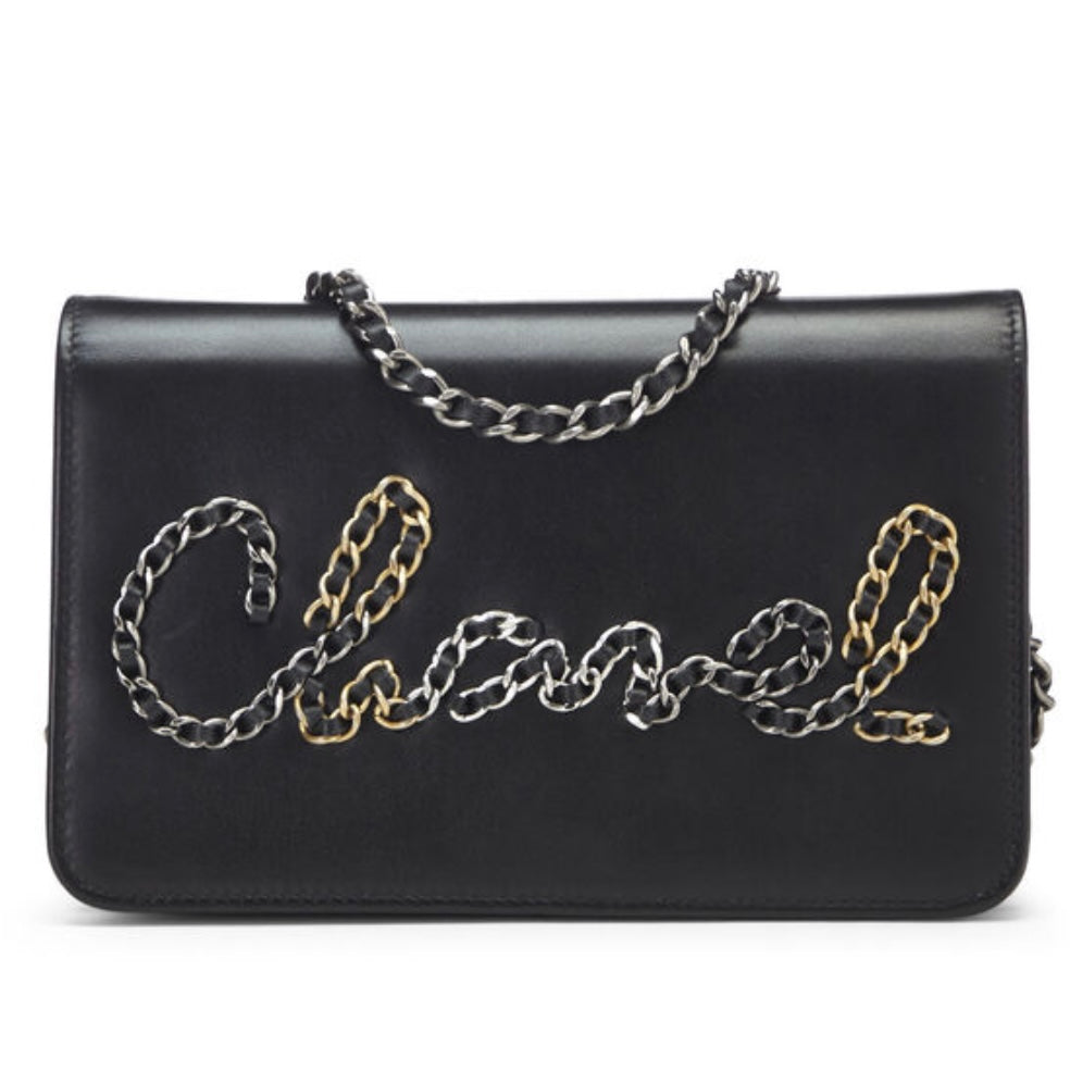 Iconic Chanel Wallet on Chain (WOC) featuring a smooth black calfskin exterior with a multi tone metal chain and leather logo on front flap. Chanel's convertible Wallet on Chain bag features a drop-in strap for use as a clutch or crossbody, while the interior features various pockets and compartments to function as a wallet.