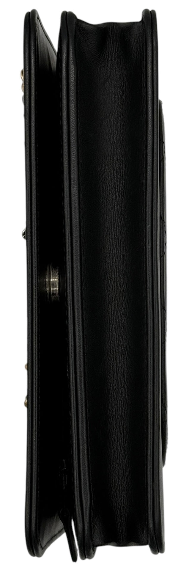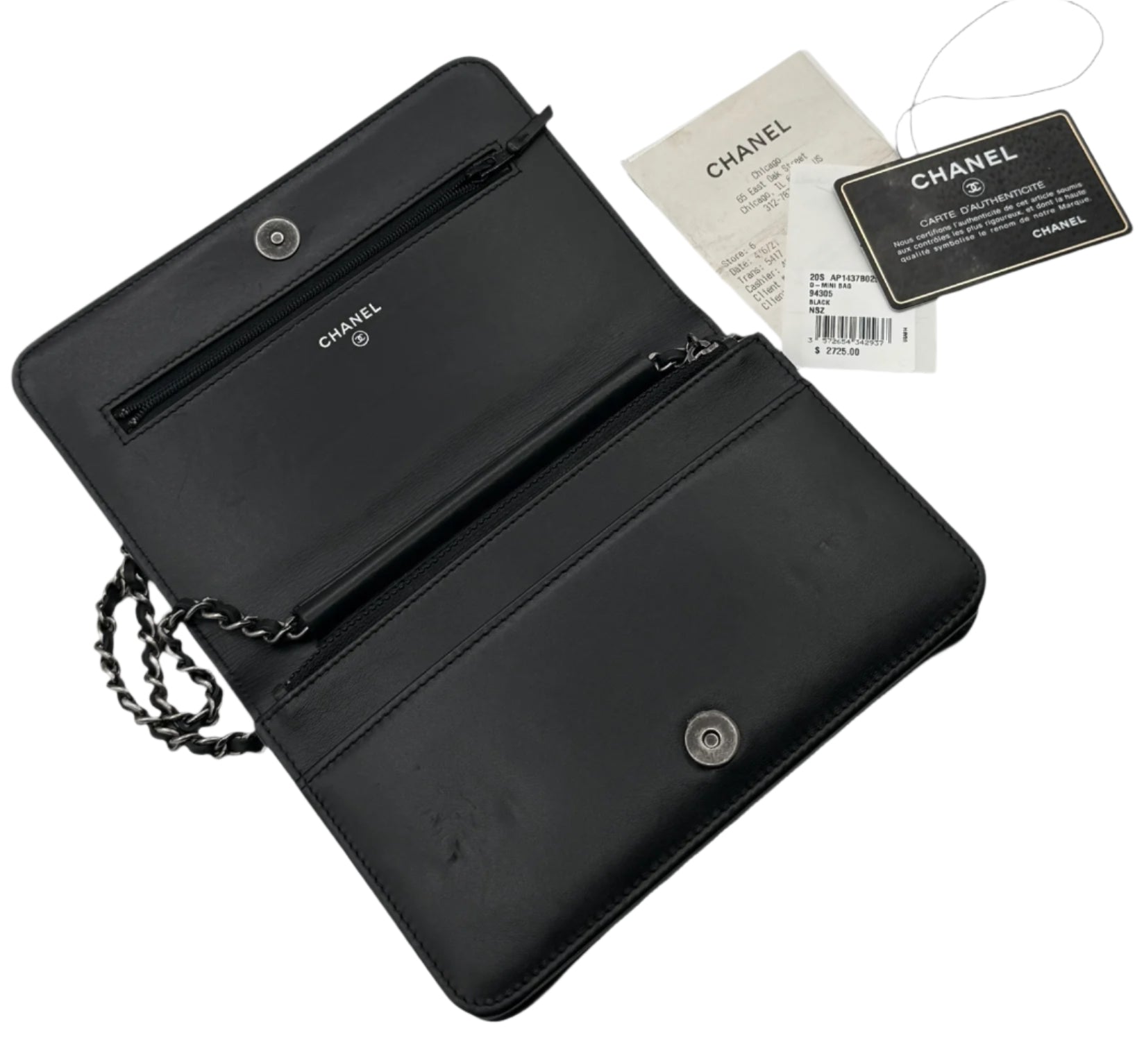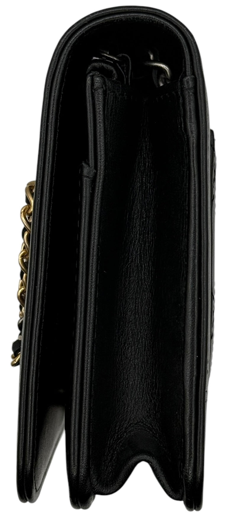 Iconic Chanel Wallet on Chain (WOC) featuring a smooth black calfskin exterior with a multi tone metal chain and leather logo on front flap. Chanel's convertible Wallet on Chain bag features a drop-in strap for use as a clutch or crossbody, while the interior features various pockets and compartments to function as a wallet.
