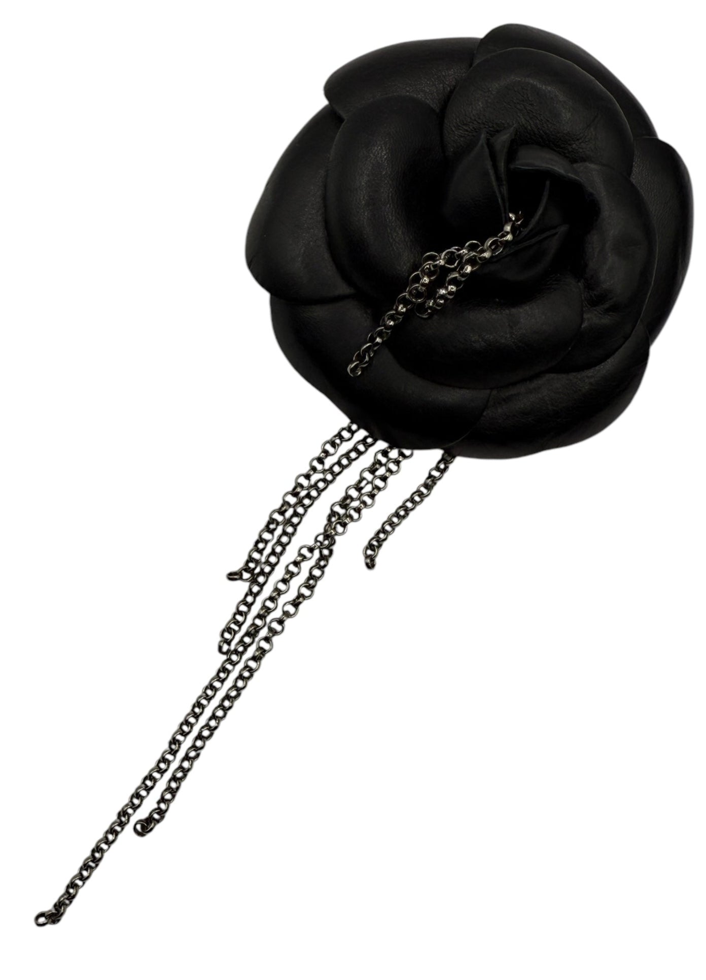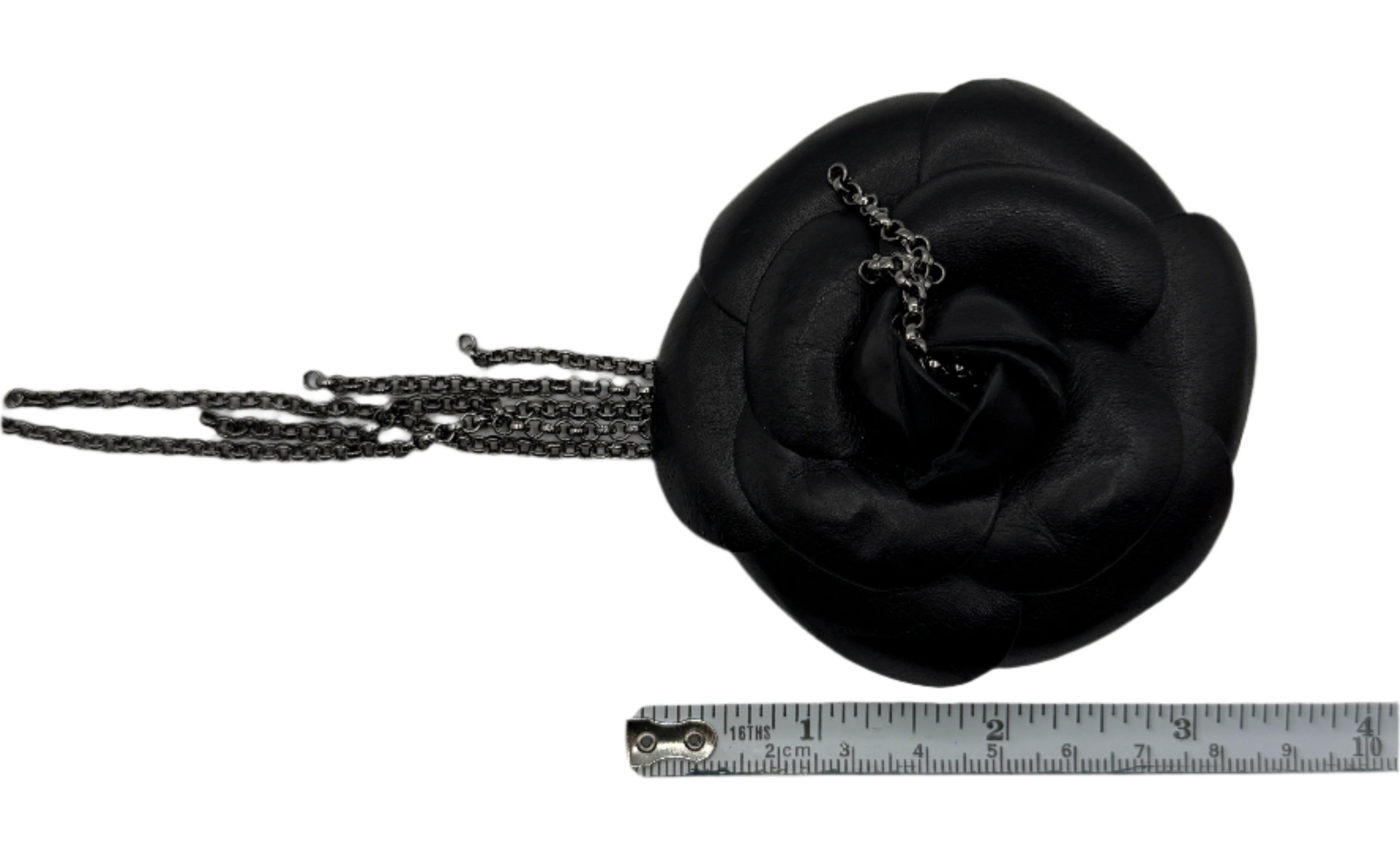 Chanel Black Leather Camellia Chain Fringe Brooch/Pin