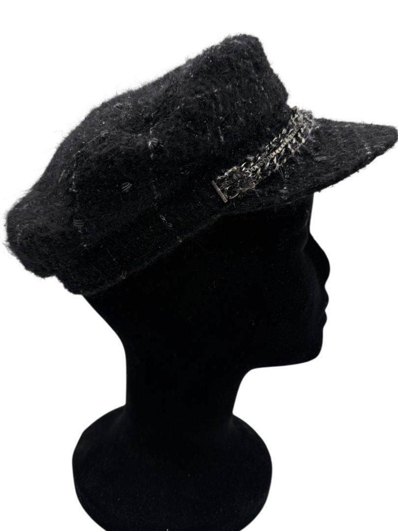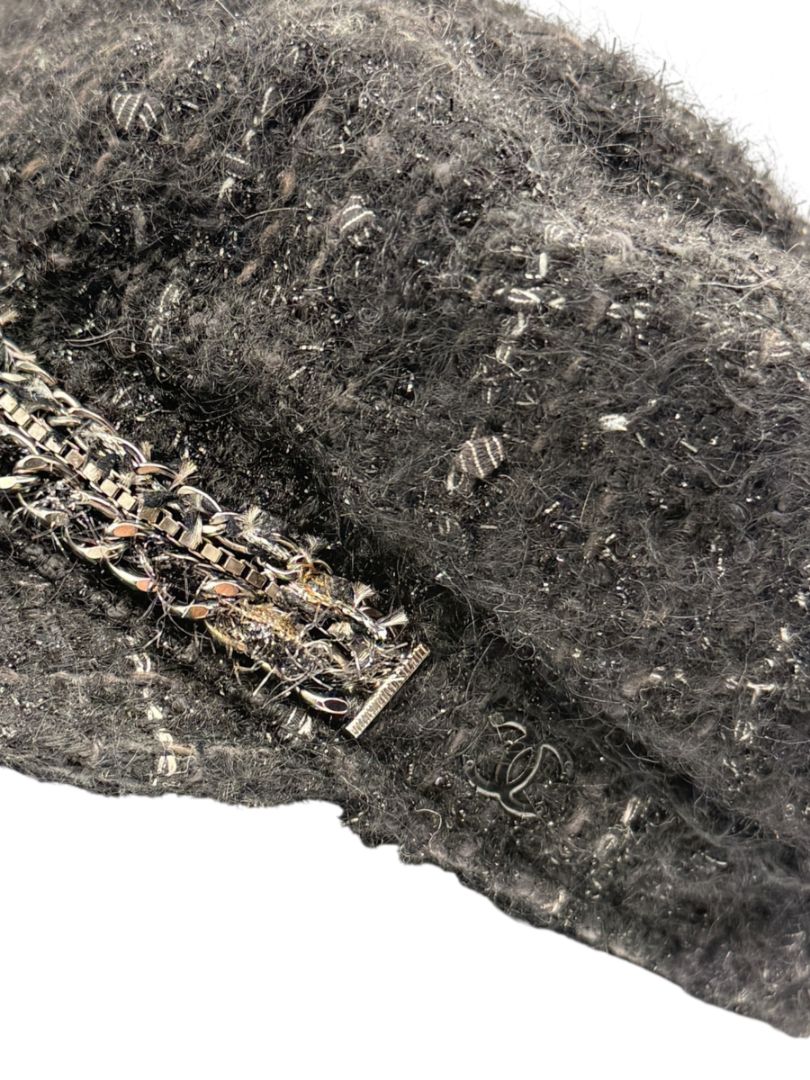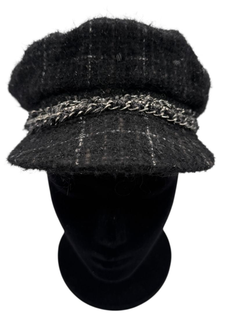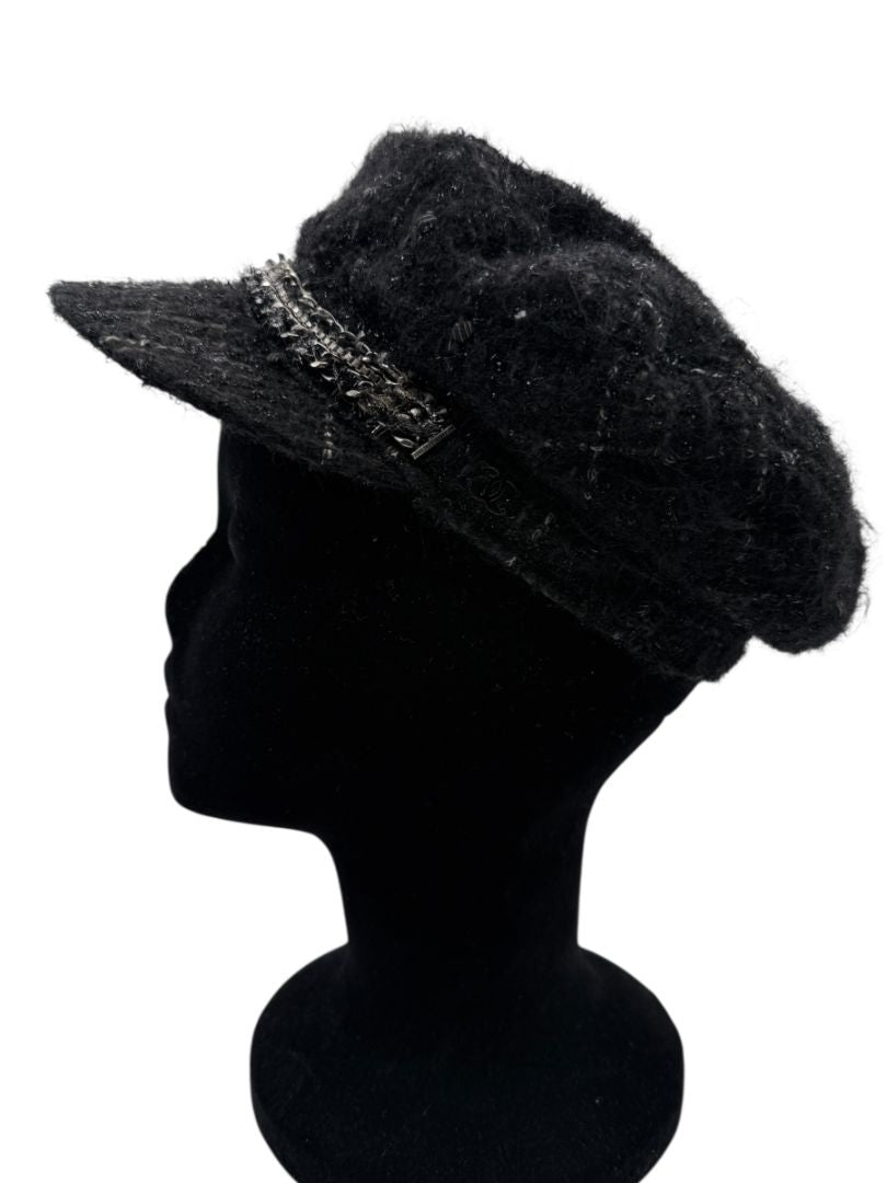 CHANEL Black Tweed Newsboy Cap with Signature Chain Trim – Very Good Pre-Owned Condition