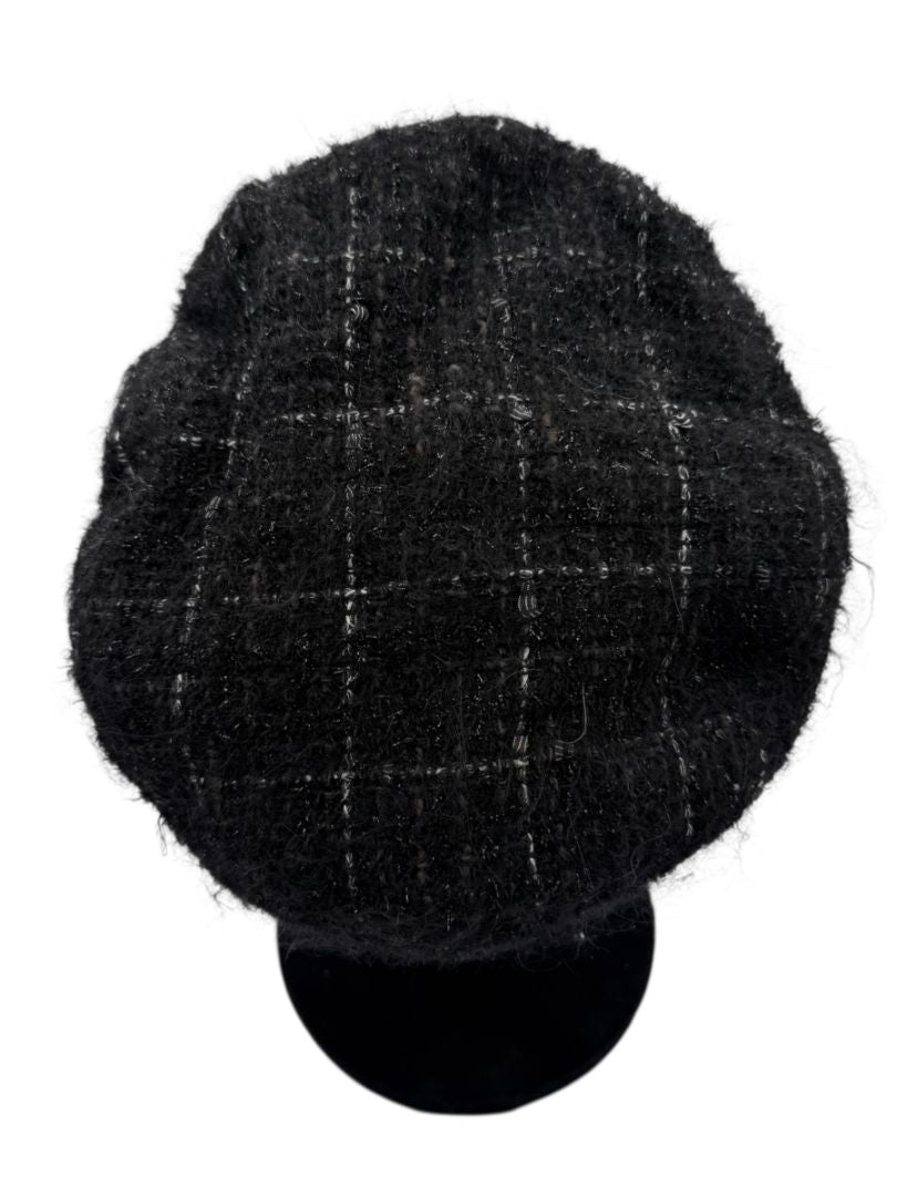 This stunning CHANEL tweed newsboy cap embodies the maison’s timeless sophistication, crafted from luxurious black tweed interwoven with tonal and metallic threads for subtle shimmer and texture. The silhouette is classic Chanel—soft, structured, and effortlessly chic—featuring the house’s iconic matte black CC logo discreetly placed near the brim.