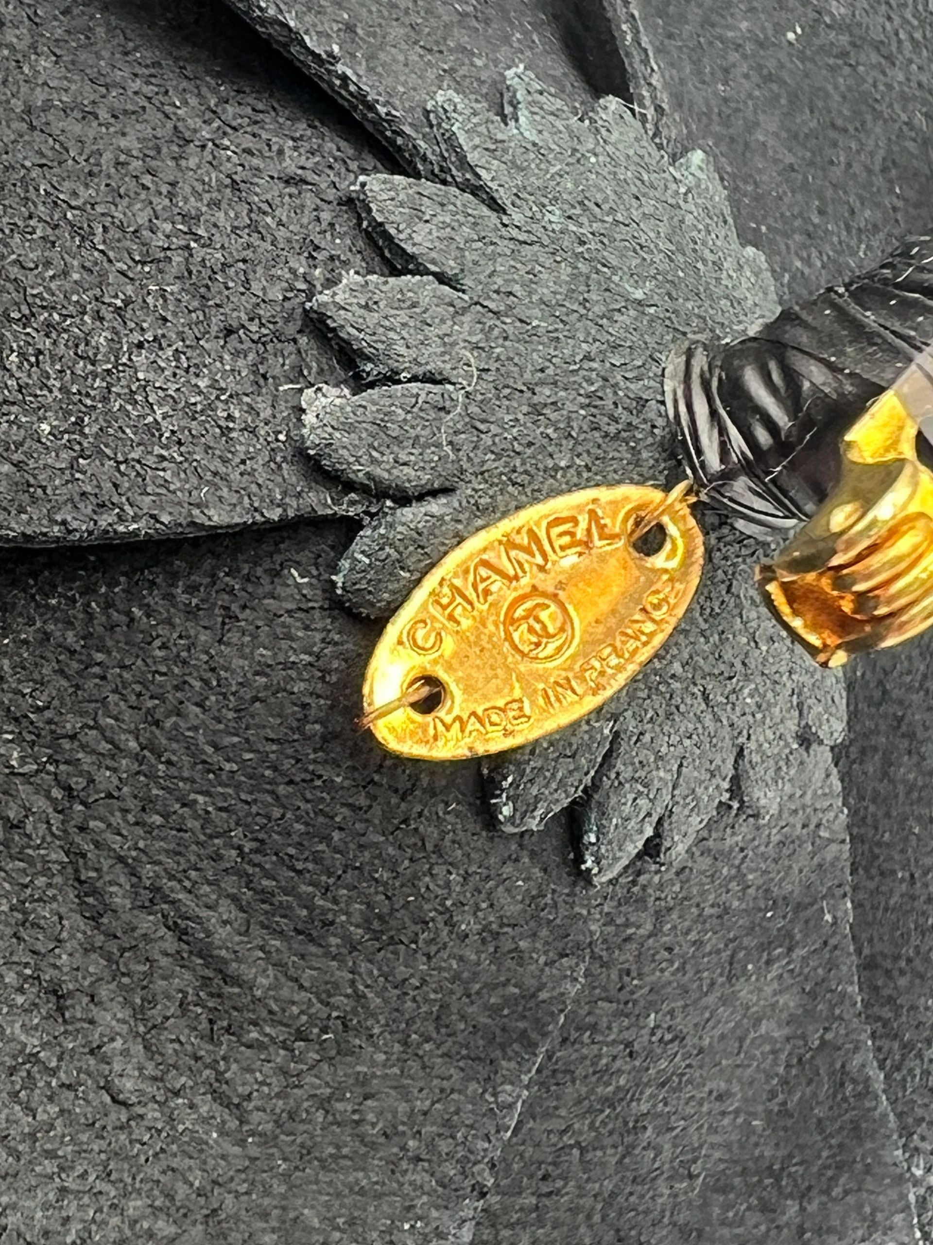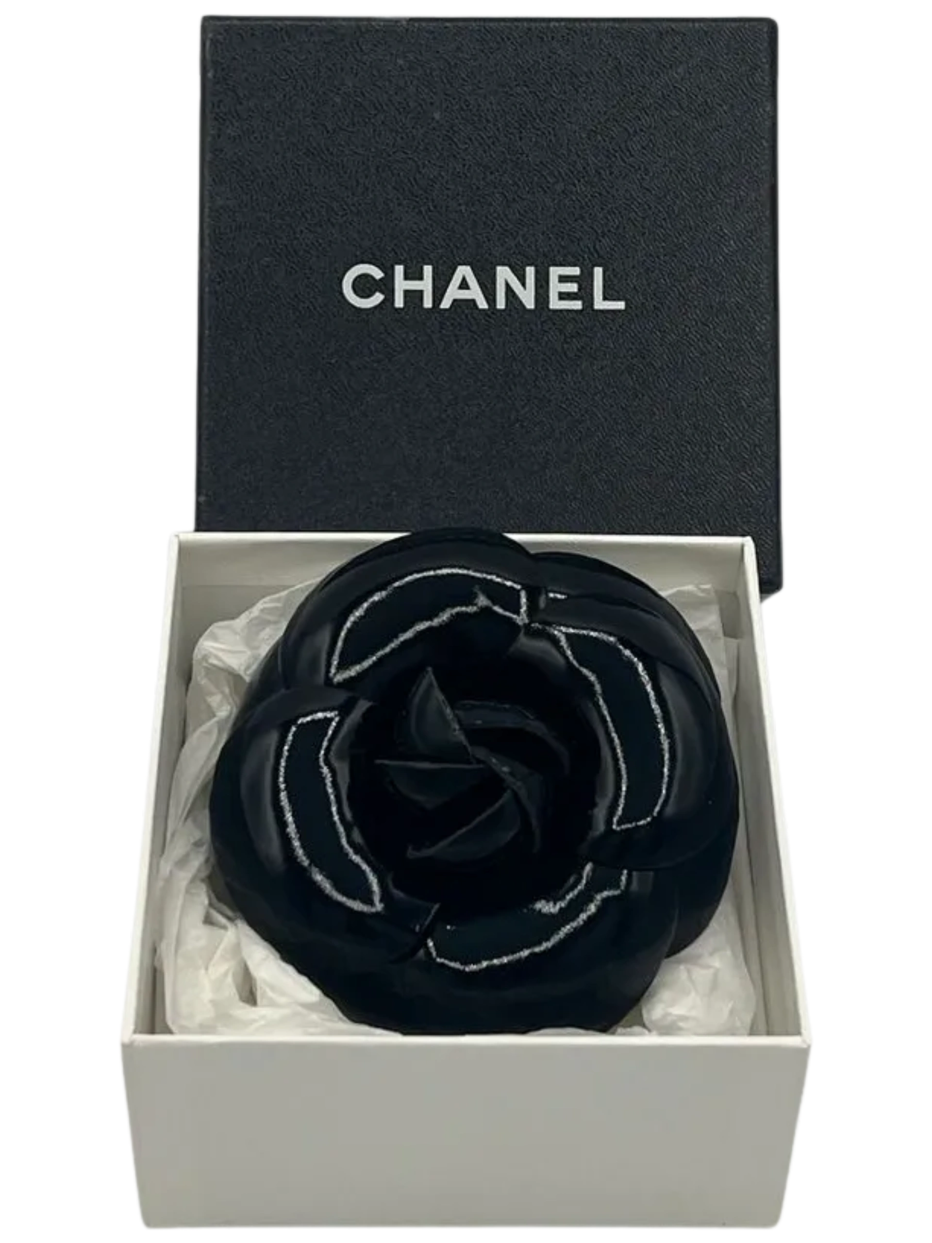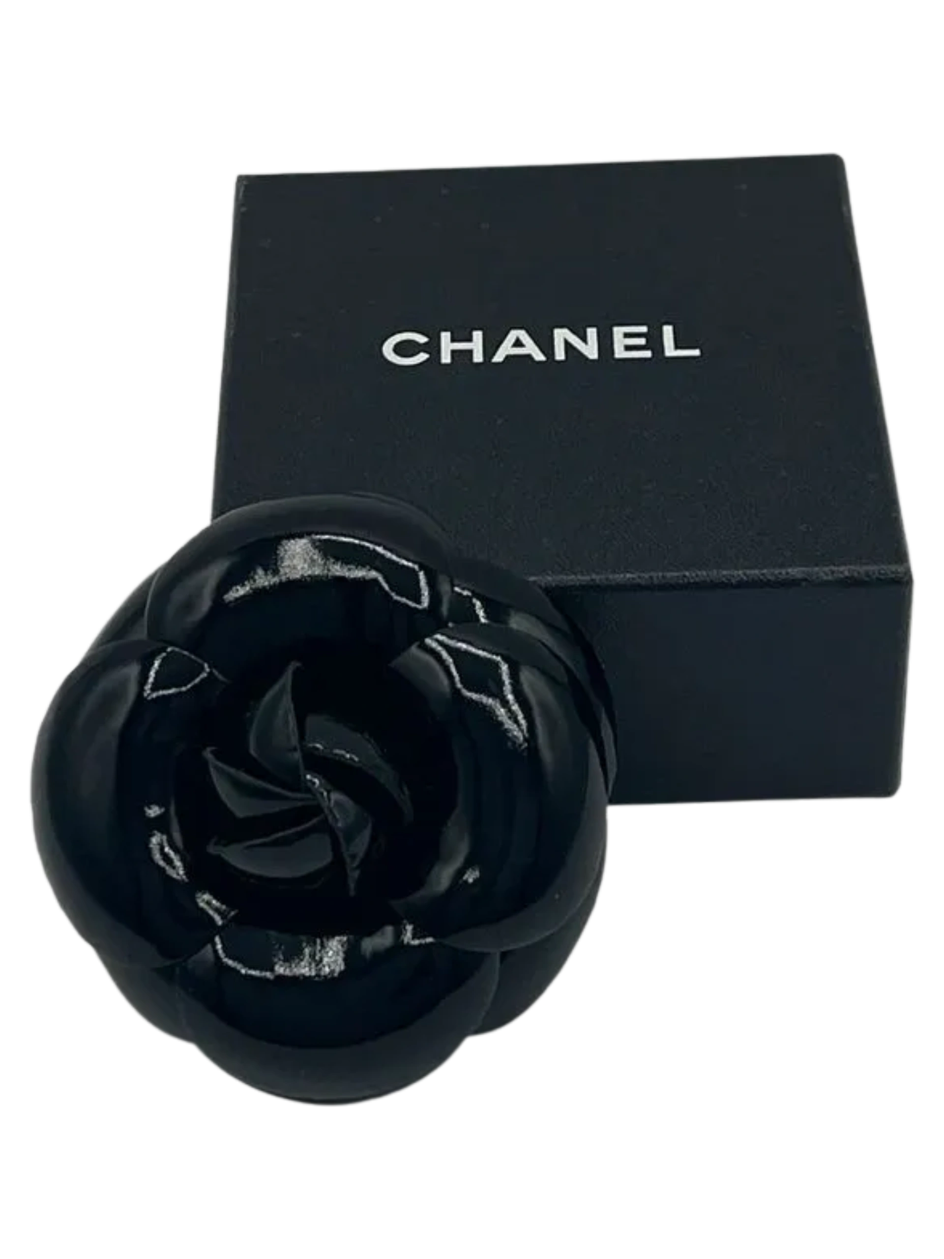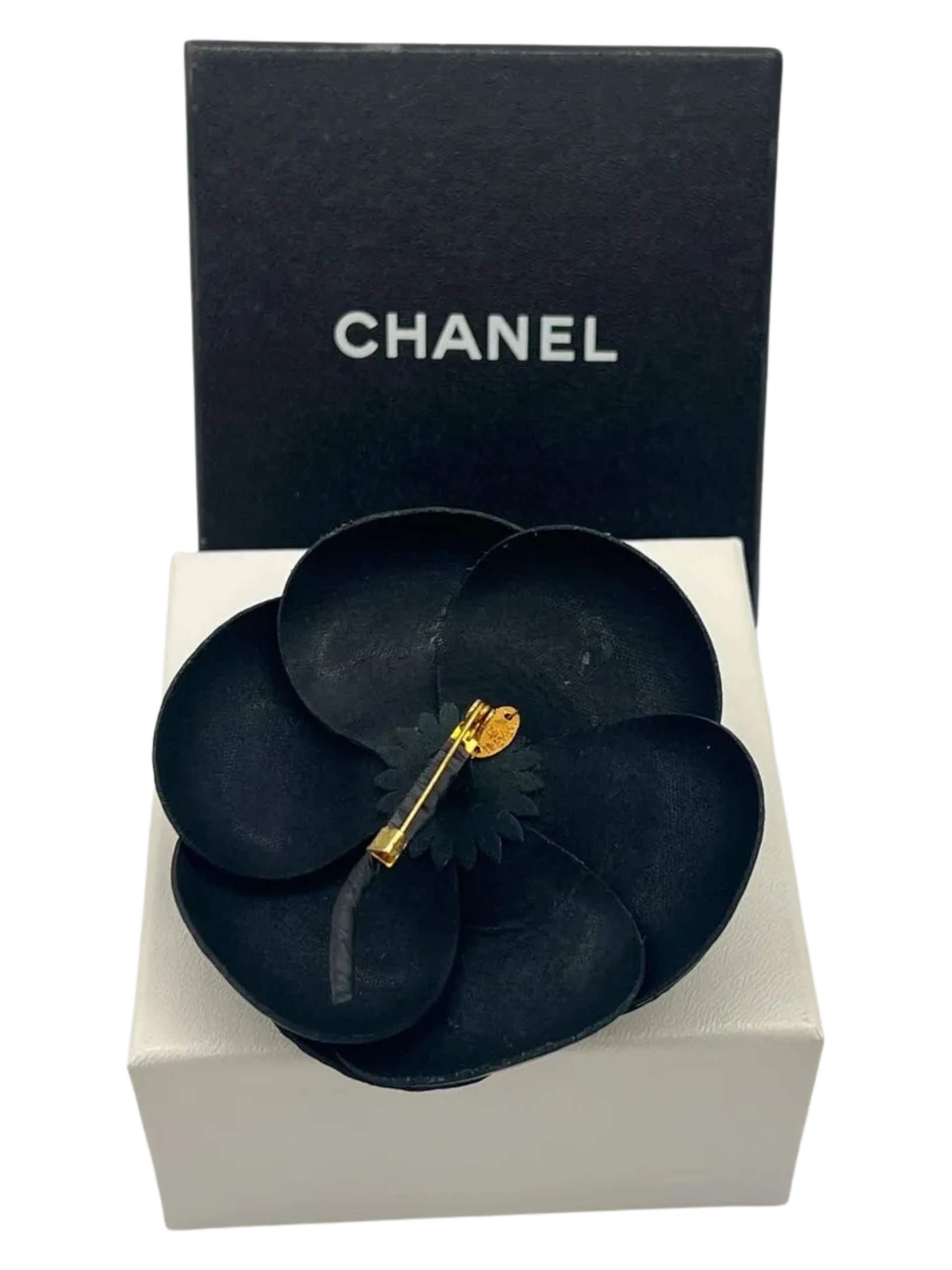 Vintage 90's Chanel Camellia Flower Pin Brooch in Black vinyl. safety pin closure. "CHANEL - CC - Made in France" oval tab on the back, Excellent condition, Very gently used, Light wear on box exterior. A classic Chanel piece! Details: Diameter: 4 Inches Height: 2 Inches Material: Black Vinyl Brooch Type: Pin/fastener and wrapped stem