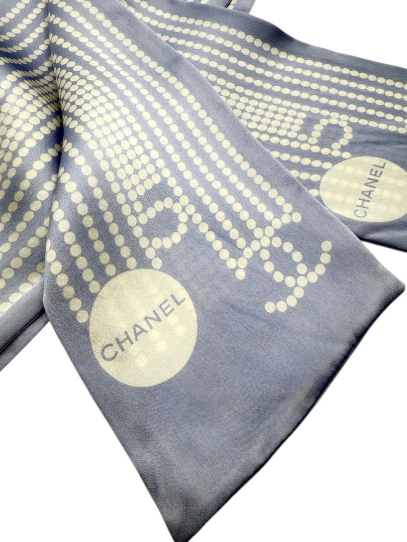 Rendered in a soft periwinkle-blue tone with contrasting white dot detailing, the design is both delicate and visually striking. At each end, circular medallions subtly display the “CHANEL” name, adding a polished signature touch without overwhelming the composition. The elongated silhouette makes this scarf exceptionally versatile—ideal for styling around the neck, draped loosely, tied at the waist, or wrapped around a handbag handle for a chic accent.