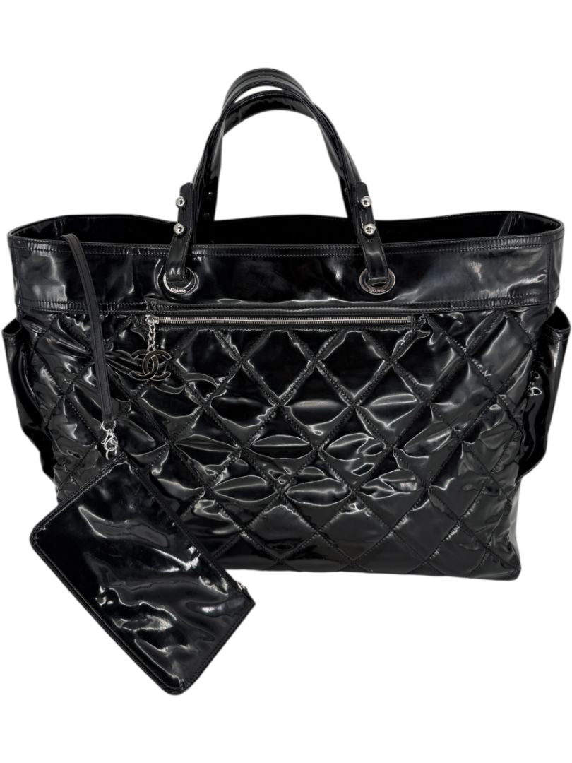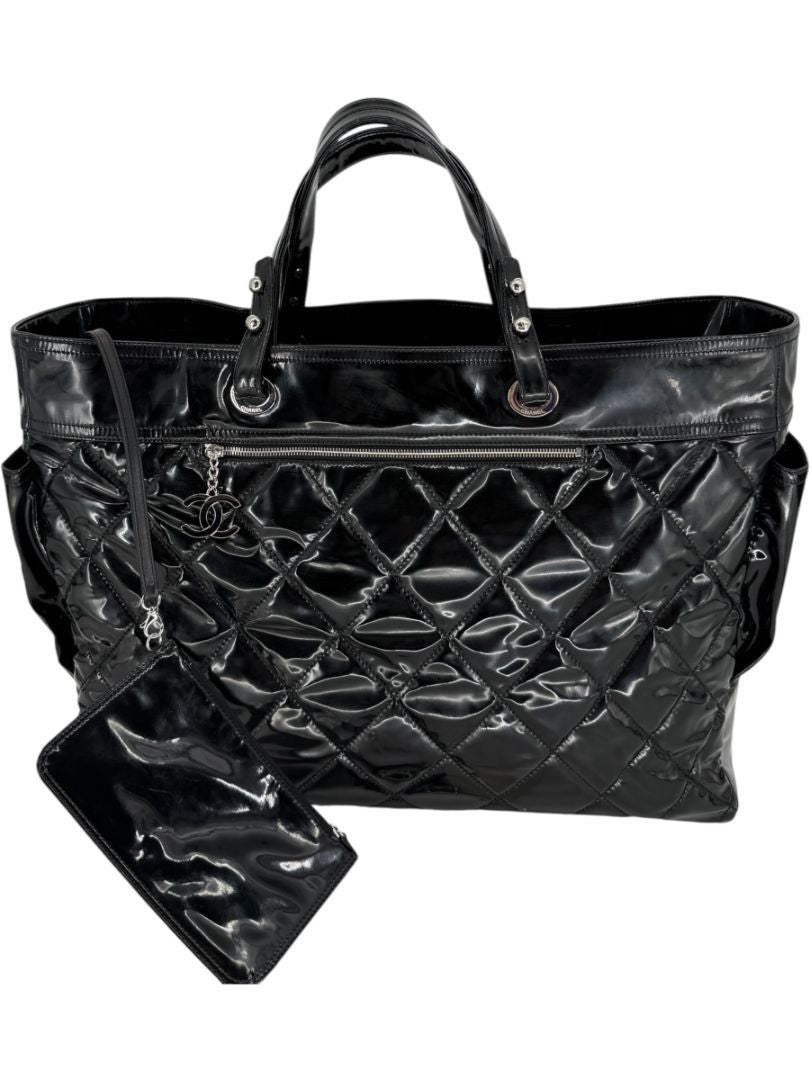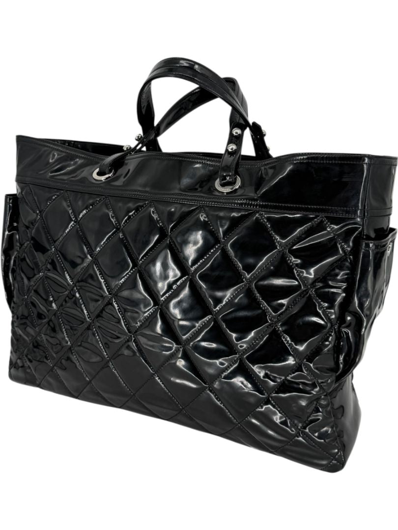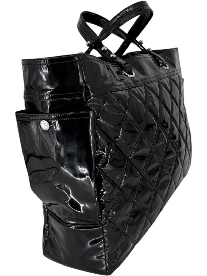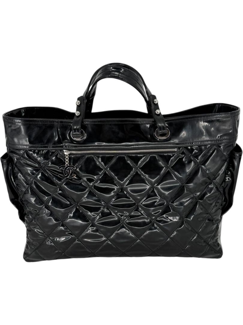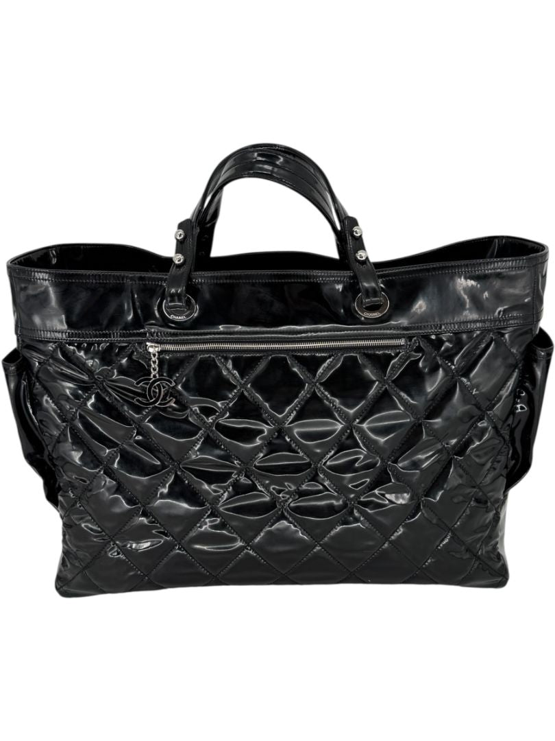 Crafted from glossy quilted black vinyl, this XL Chanel Paris-Biarritz tote delivers major impact with its bold silhouette, luxe patent finish, and unmistakable CC charm. Roomy enough for everyday essentials, weekend getaways, or fashion-forward moms, this iconic tote balances practical functionality with timeless Chanel elegance.
