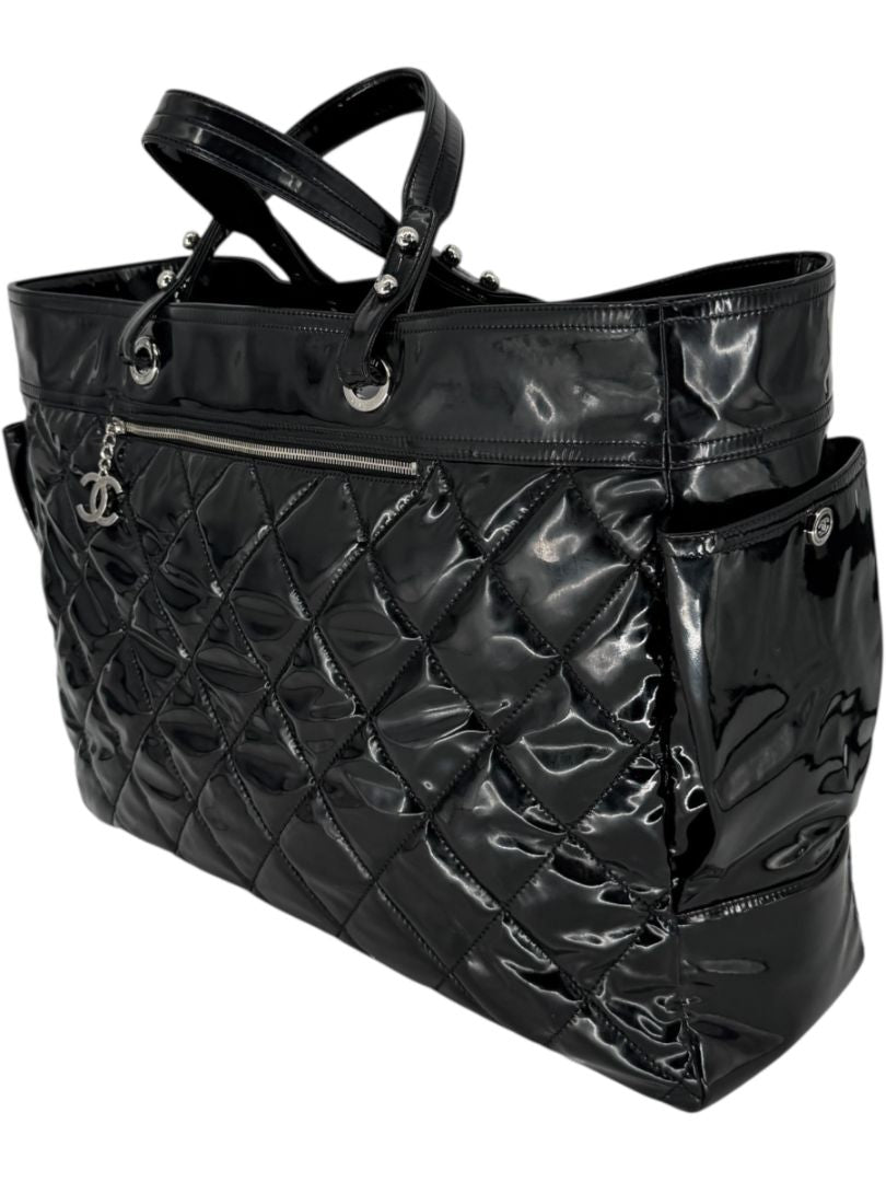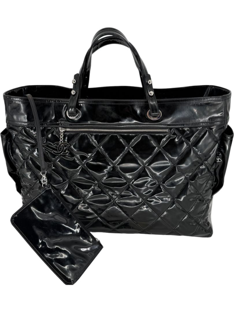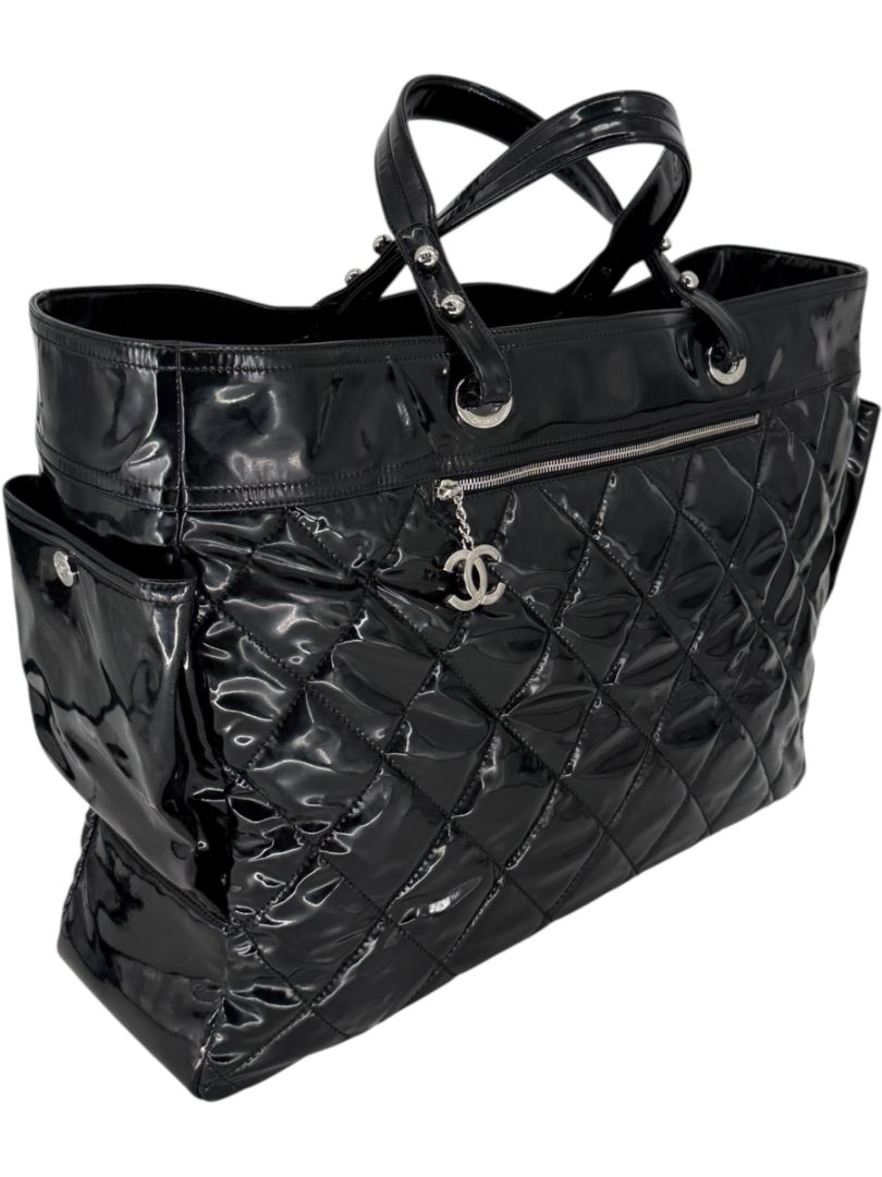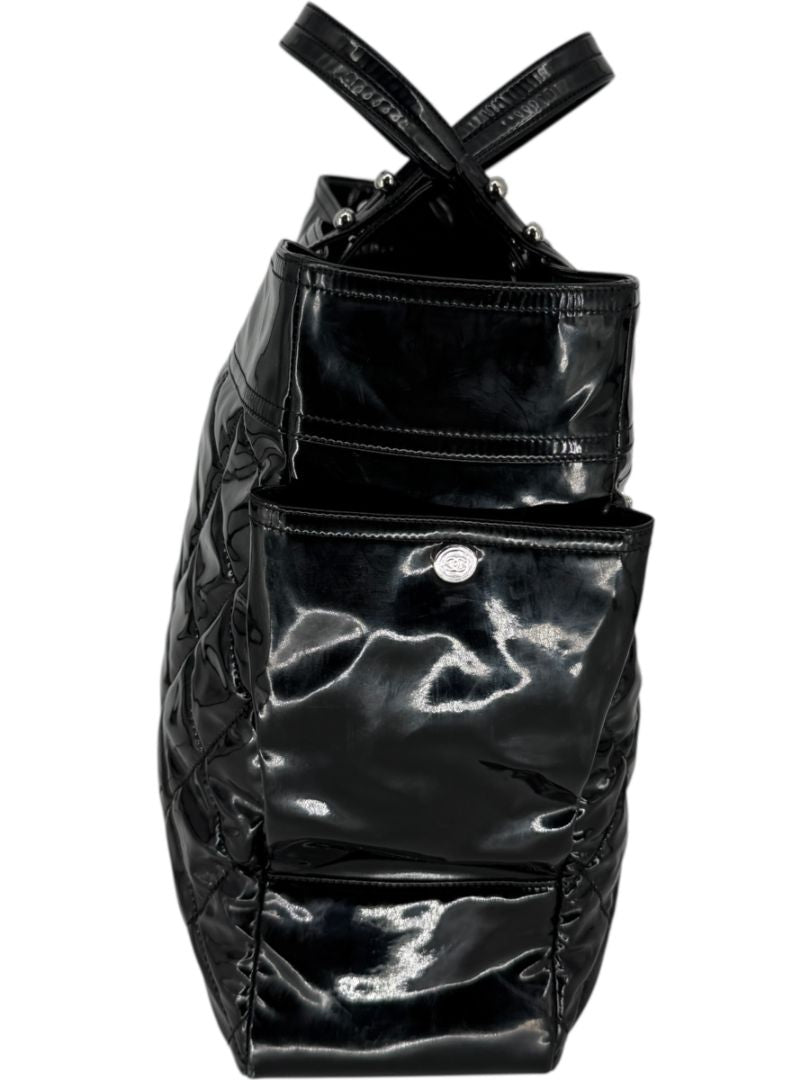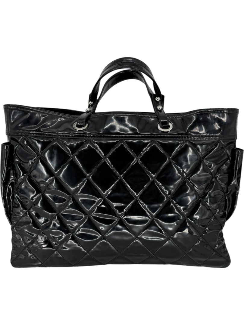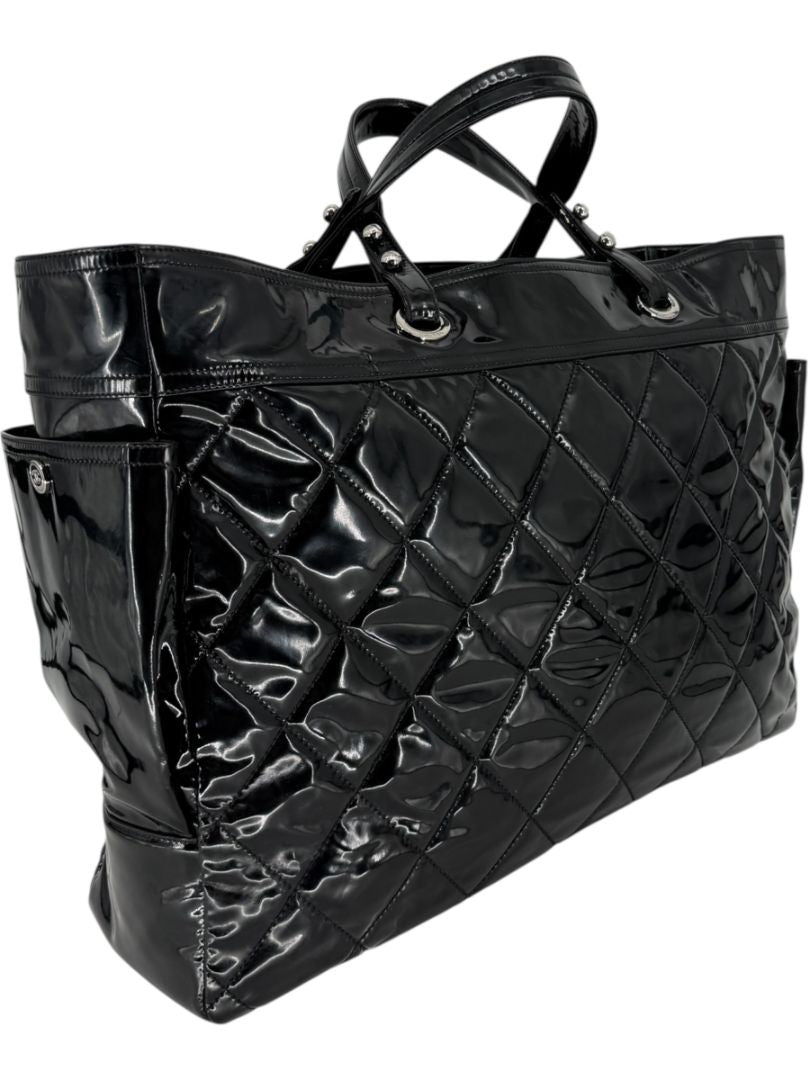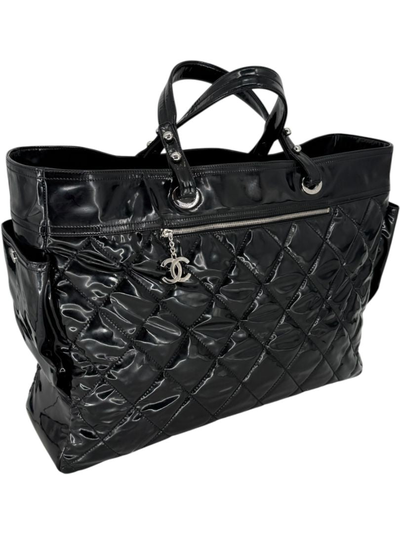 Crafted from glossy quilted black vinyl, this XL Chanel Paris-Biarritz tote delivers major impact with its bold silhouette, luxe patent finish, and unmistakable CC charm. Roomy enough for everyday essentials, weekend getaways, or fashion-forward moms, this iconic tote balances practical functionality with timeless Chanel elegance.