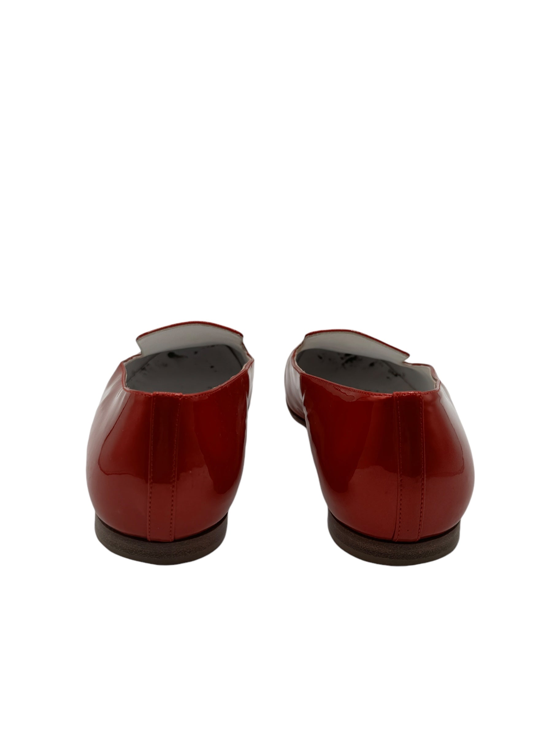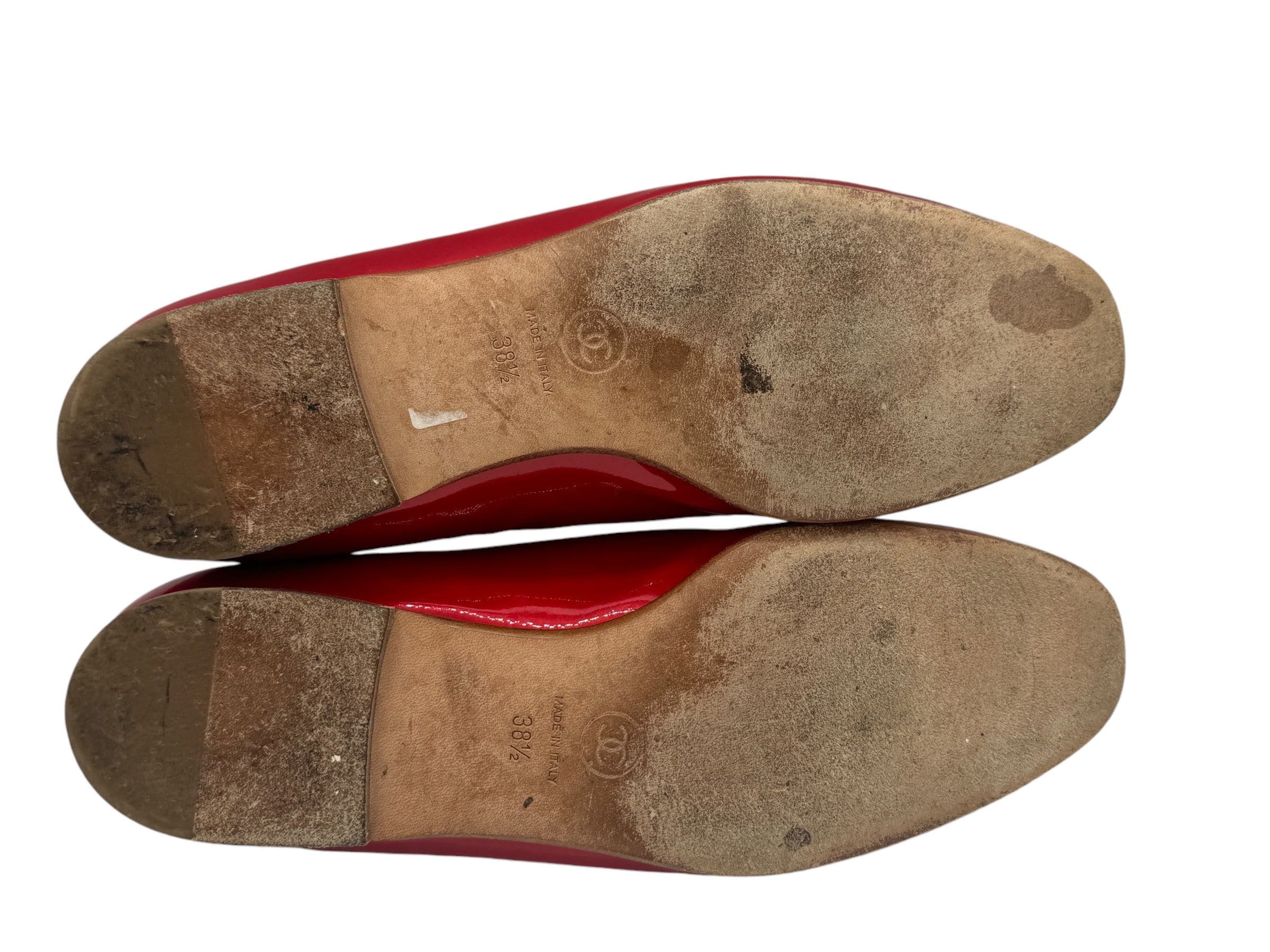 If you're on the lookout for a statement pair of shoes, you can opt for these smart Chanel shoes. These red patent leather, slip-on loafers have a striking red hue and the CC logo on the uppers for the most luxurious finish. Size 39.5. Condition is good, creasing on the top and wear on soles.