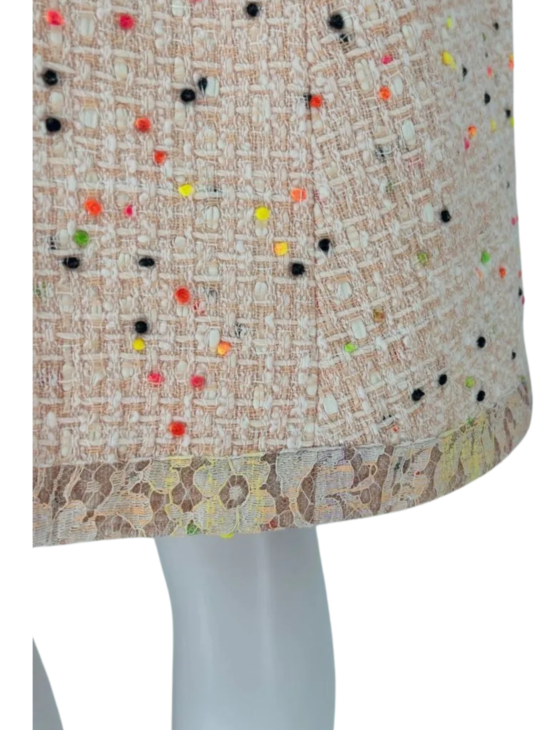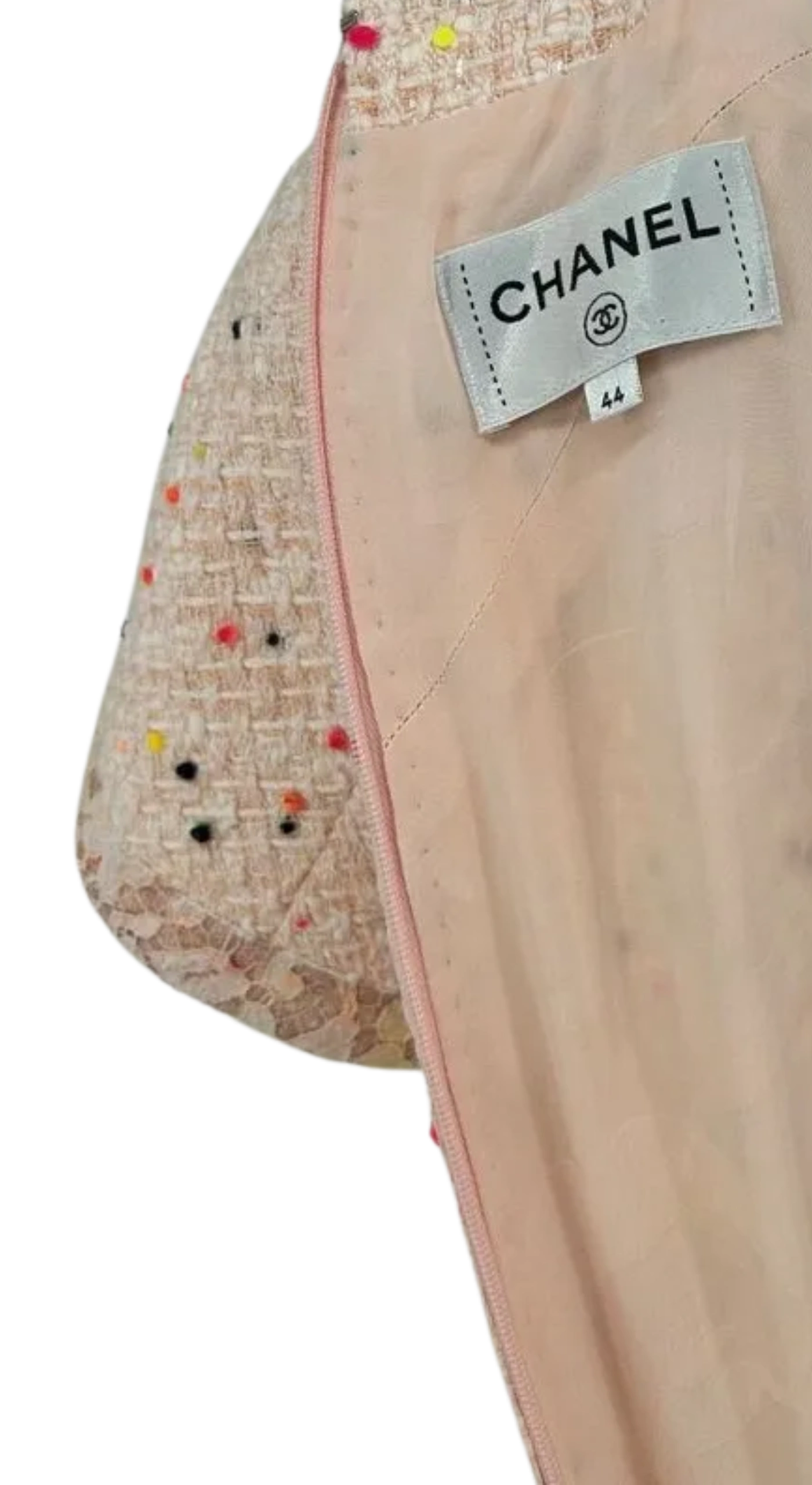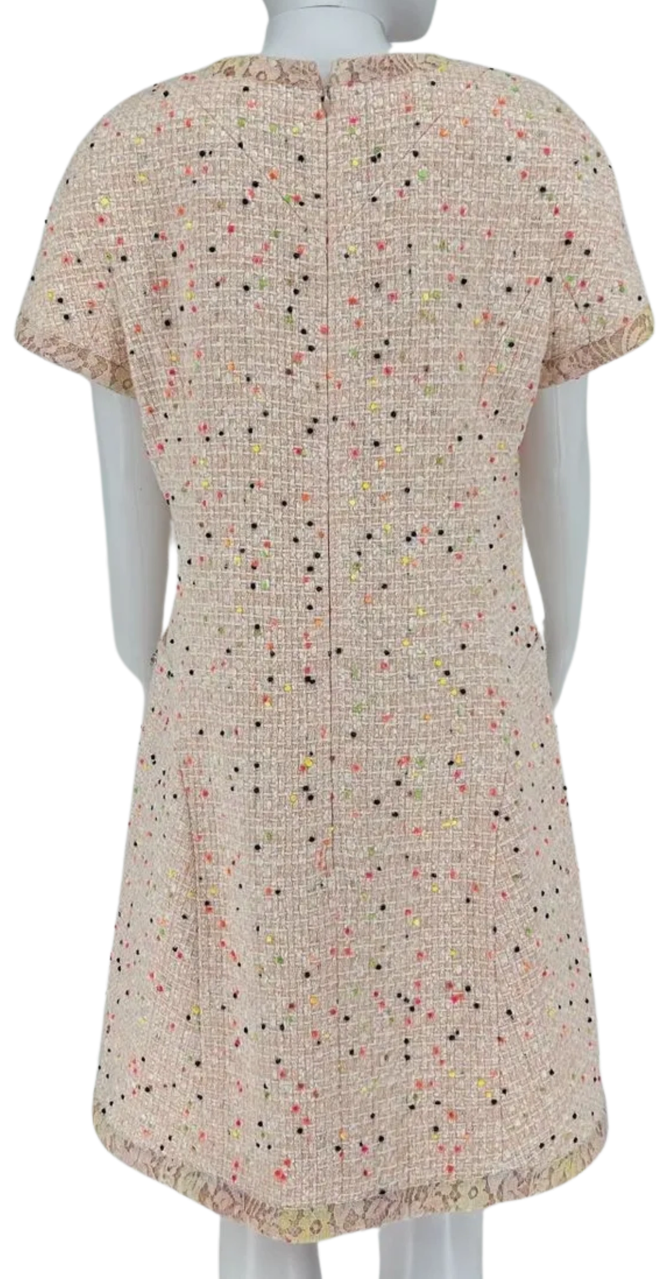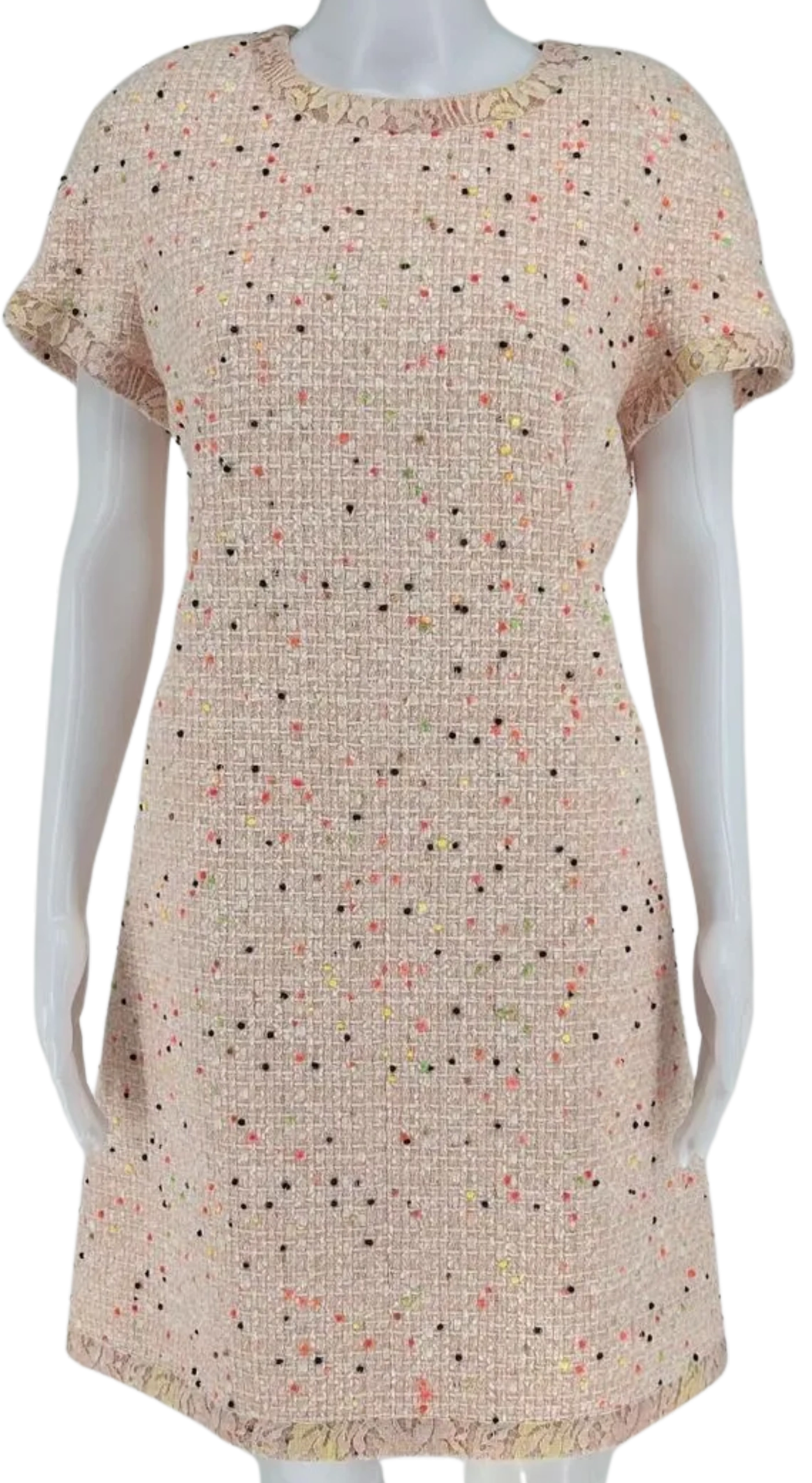 Runway Chanel SS 2019 Pink/Coral Pompom Tweed Dress - This wonderful dress has a classic Chanel sheath cut, with a round neckline and cap sleeves. The neckline, hem and sleeves have a lace overlay border/trim. Darting at bust that leads in the two hip pockets, one that has a pink crystal and acrylic emblem sewn on the left pocket. There is one big center concealed zipper. The dress is in Excellent condition - New Like. 100% silk lining with classic Chanel Camellia pattern. Made in France.