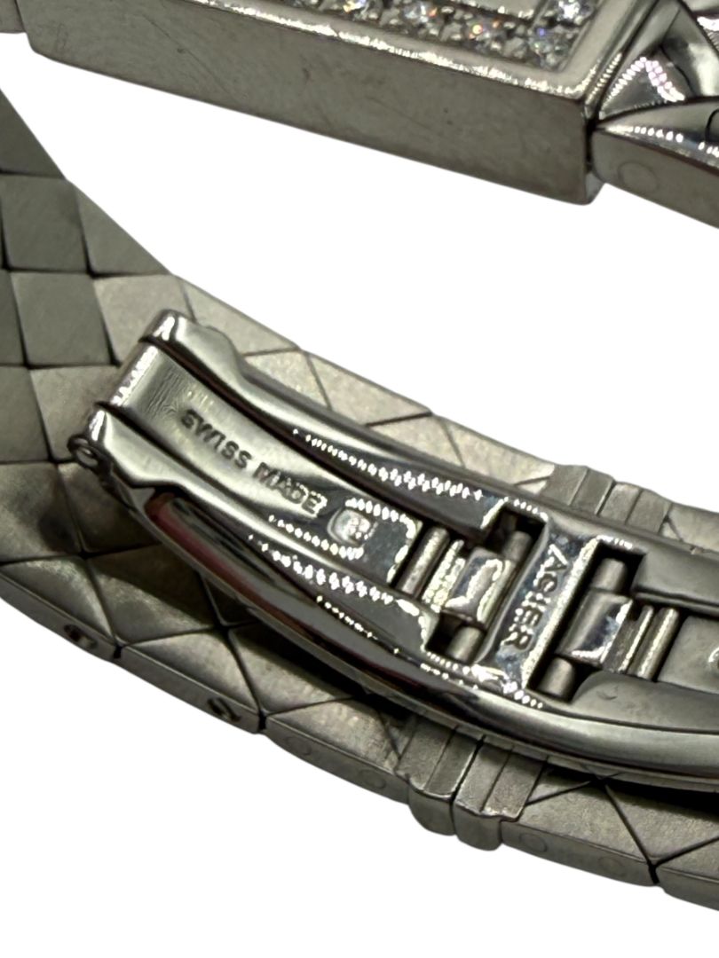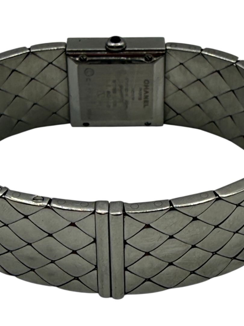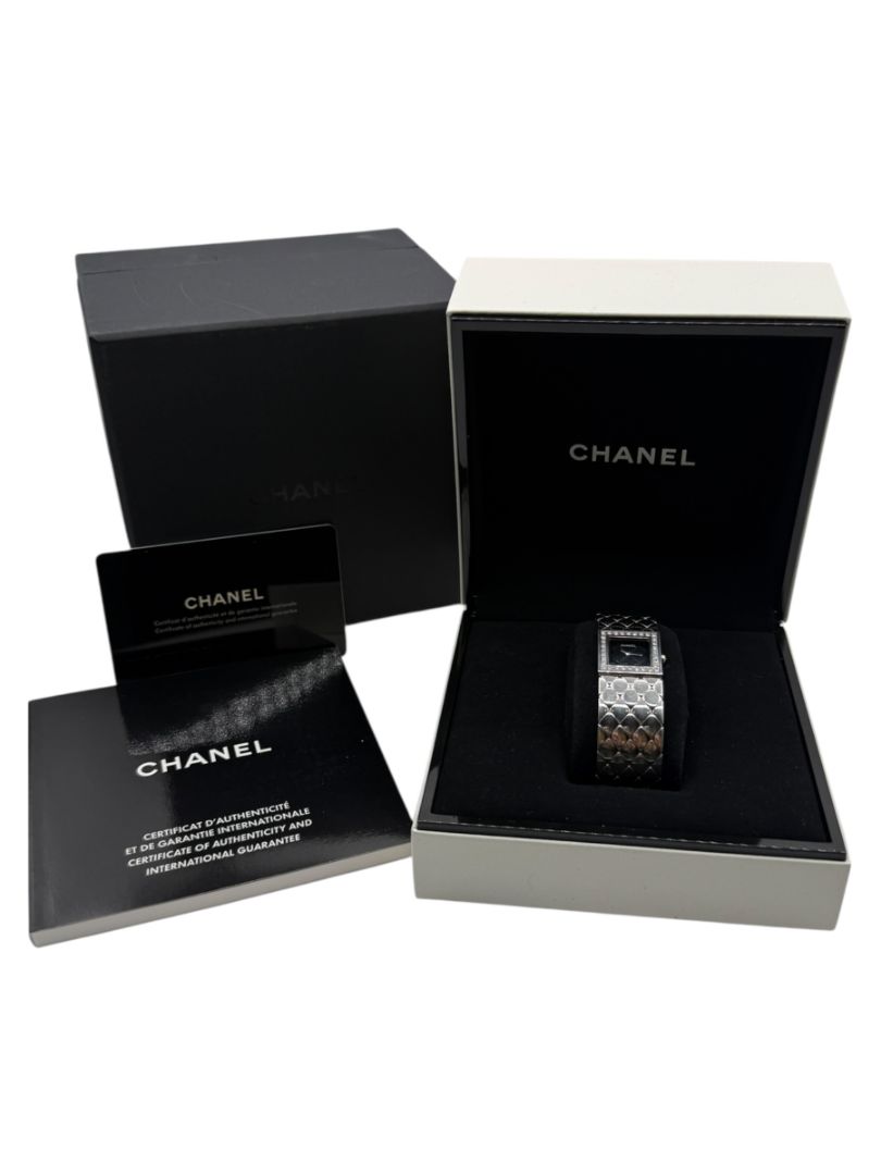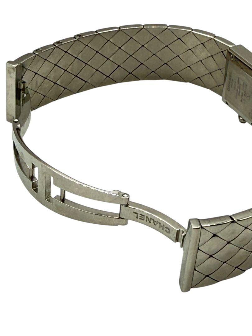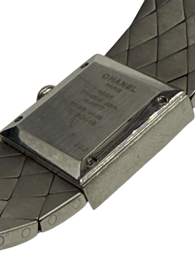 An iconic 1993 Chanel timepiece featuring the house’s signature matelassé (quilted) motif rendered in polished stainless steel. The petite 19mm square case is framed by a diamond-set bezel that adds refined brilliance against a sleek black dial. Finished with a black cabochon crown and a flexible quilted steel bracelet, this piece beautifully merges Chanel’s handbag heritage with Swiss watchmaking precision. Elegant, architectural, and distinctly Chanel.