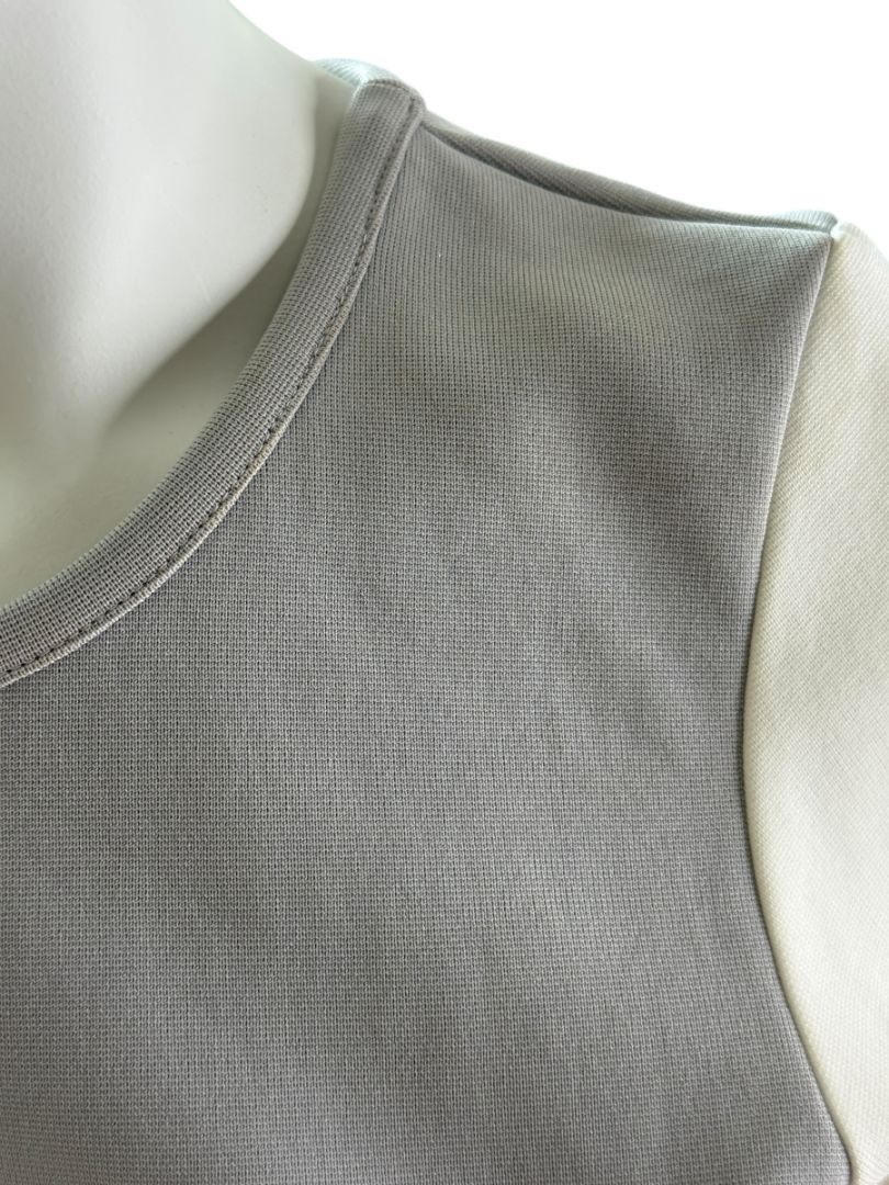 From the Chanel Identification collection, this sporty-chic short sleeve tee combines minimalist lines with standout branding. Crafted in a structured polyamide knit, it features a paneled construction in soft dove grey and cream, finished with a bold CC logo patch at the back.