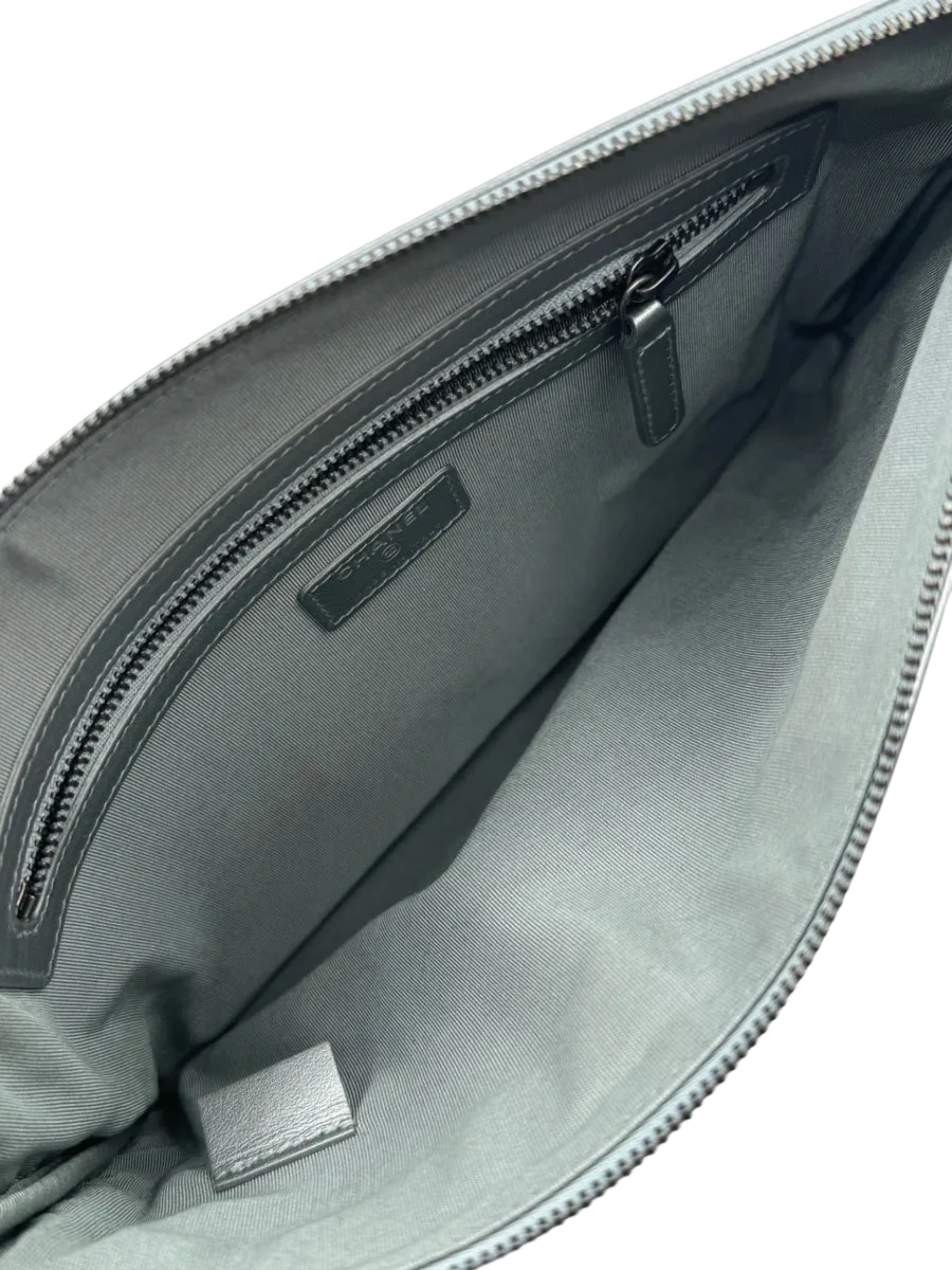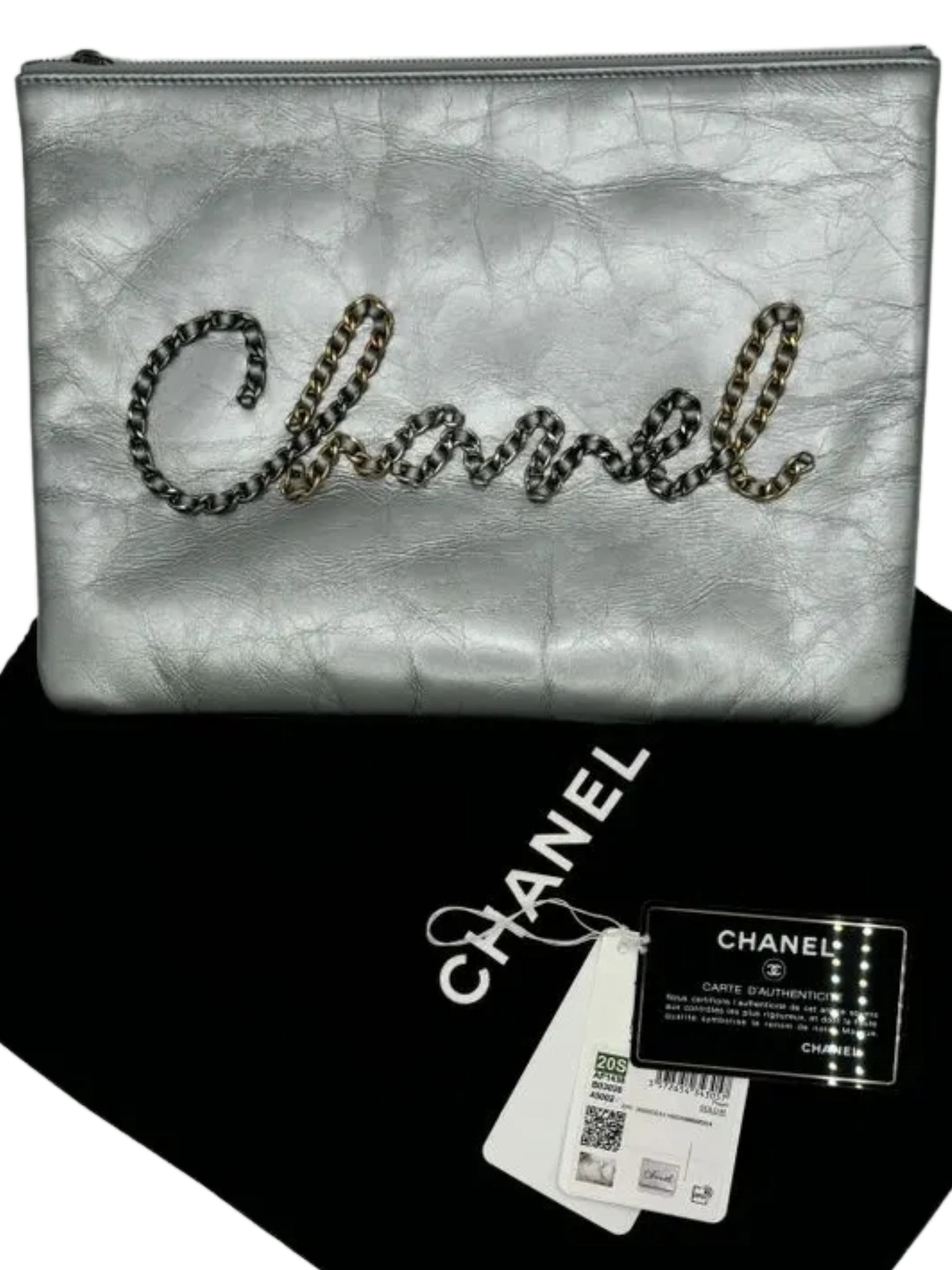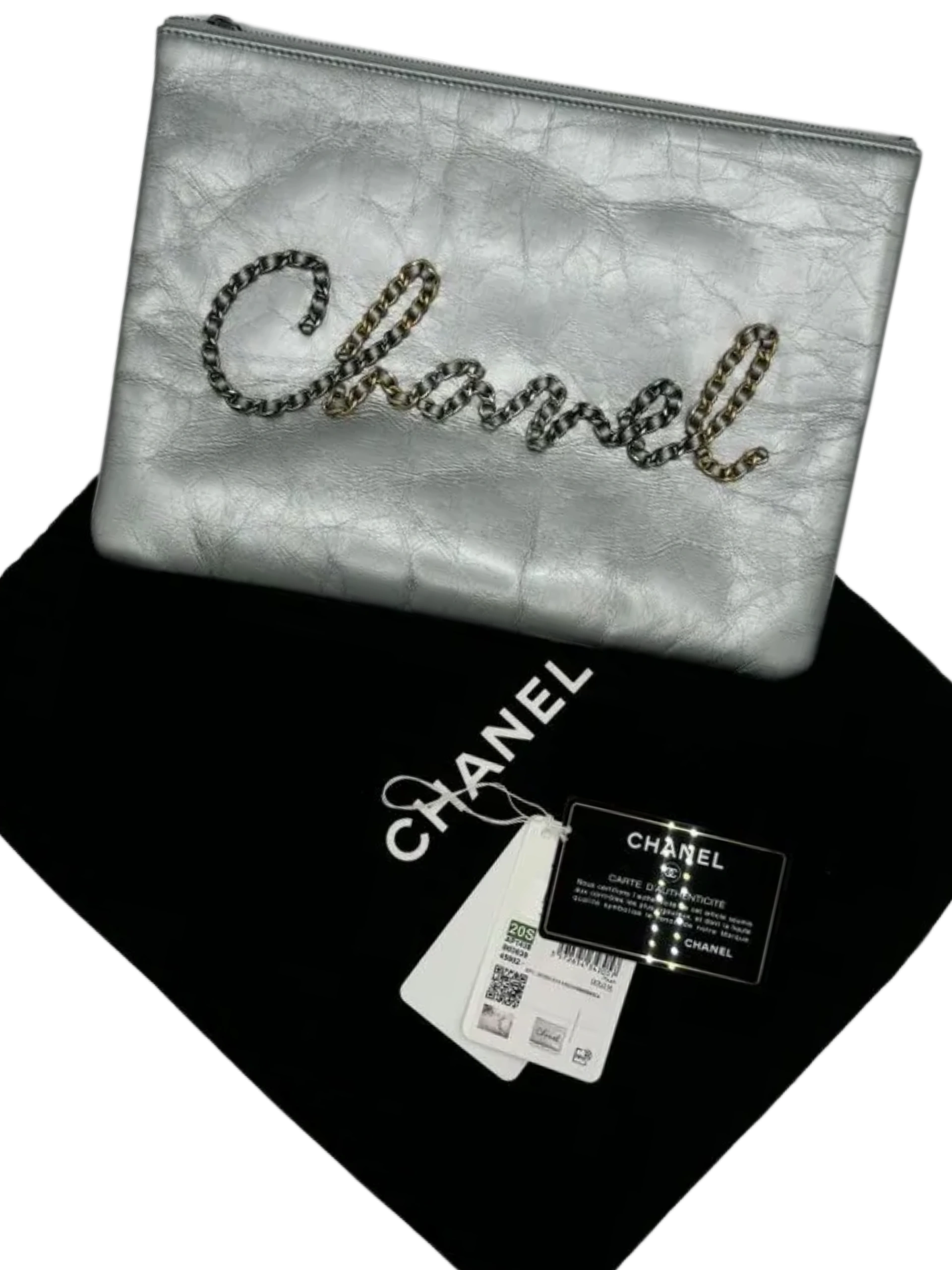 Chanel Written In Chain Metallic Crumpled Calfskin Signature Pouch Silver