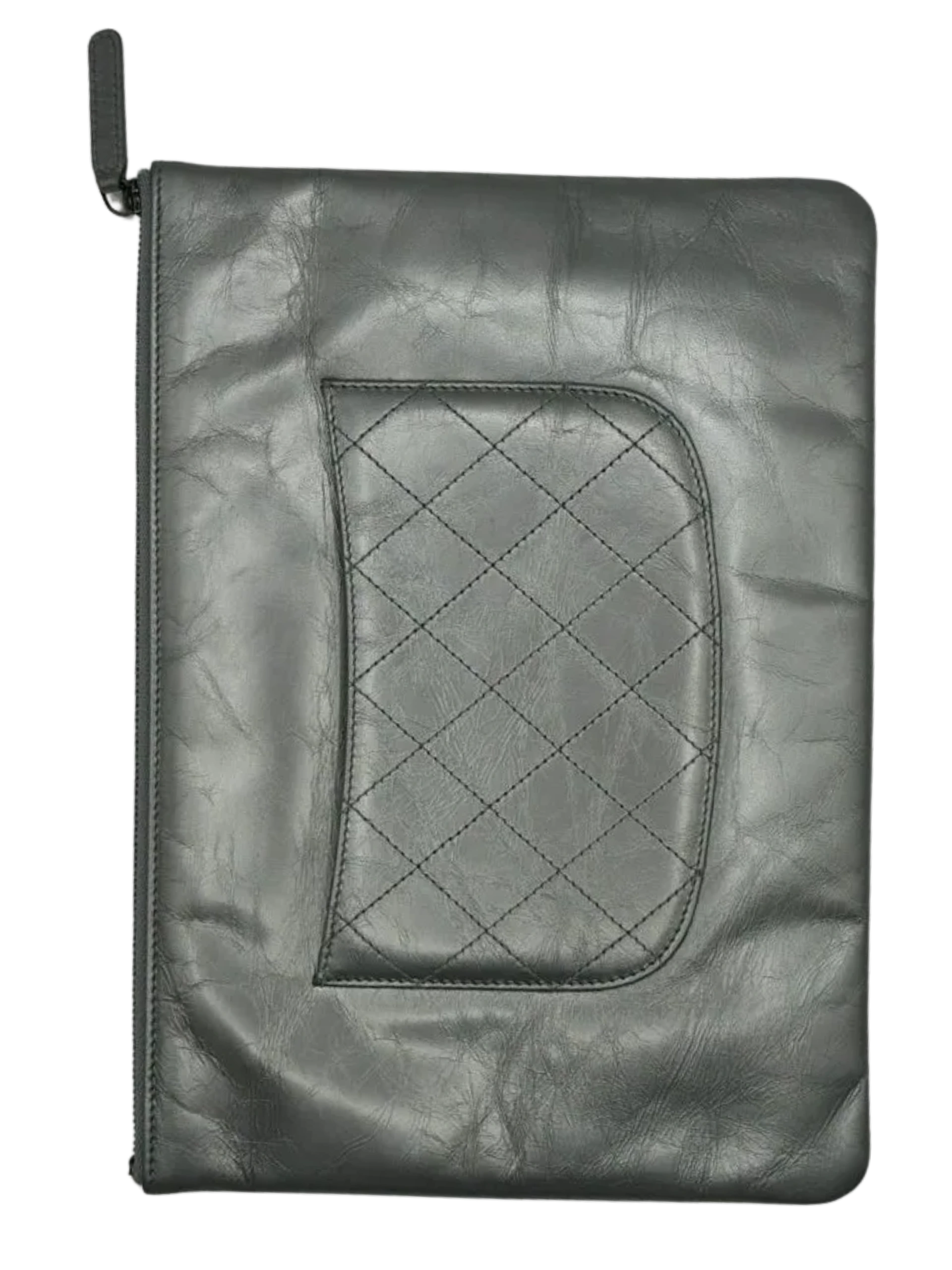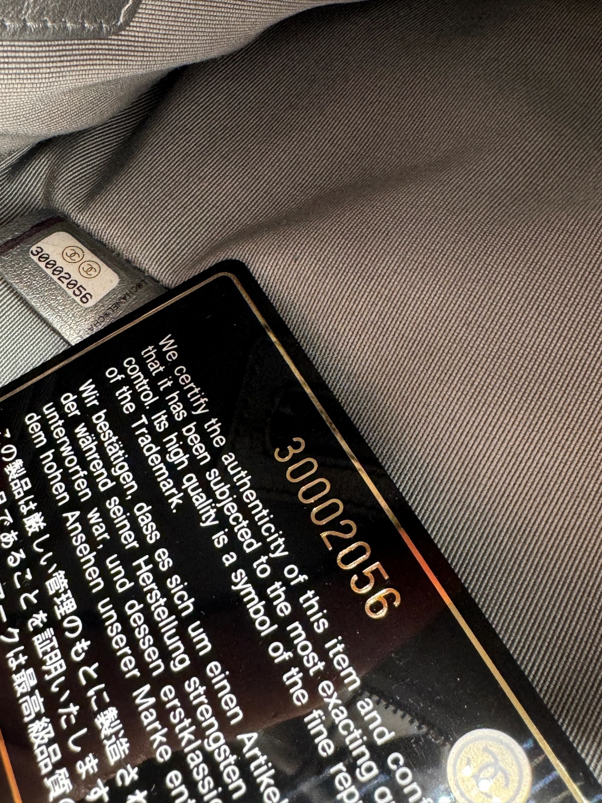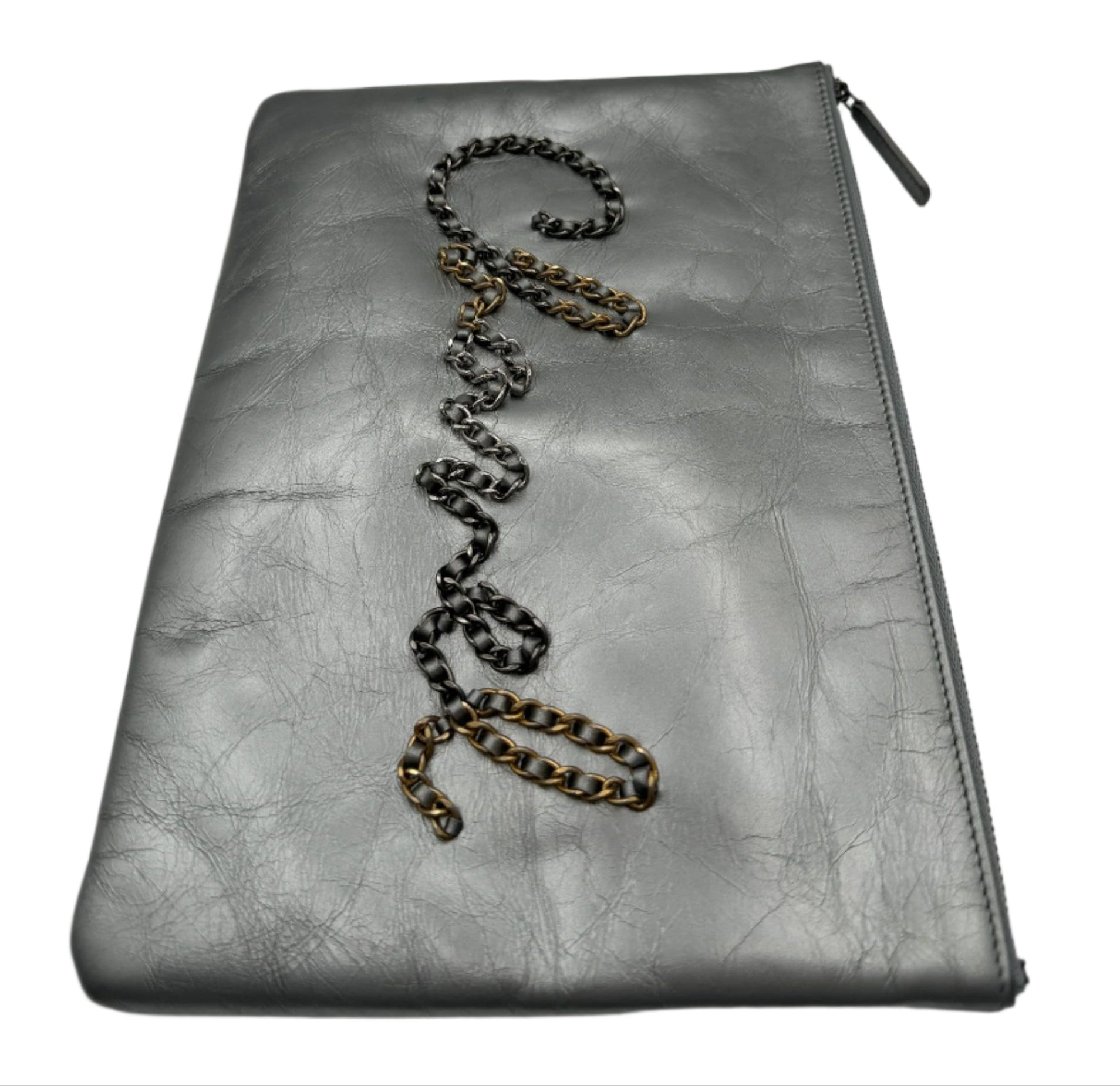 This stylish case is crafted of luxurious metallic leather in silver with an overlay of Chanel lettering with chain detail. The bag features a polished dark silver top zipper that opens to a fabric interior. This pochette is practical with the timeless style only from Chanel!