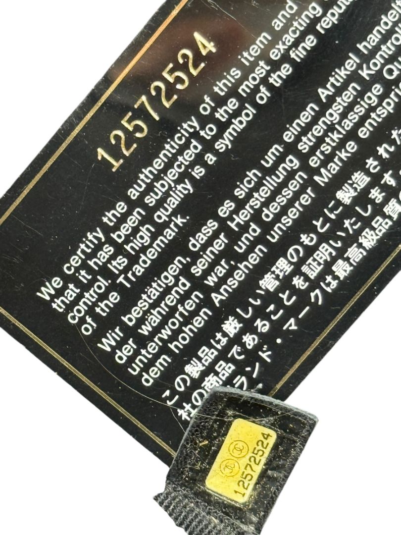 Crafted in durable black coated canvas with leather trim and handles, the bag features a striking gray architectural print inspired by Hadid’s futuristic design language. The reverse showcases Karl Lagerfeld’s signature, further cementing its collectible status. The original leather Chanel lanyard remains attached to the handle, adding to its authenticity and completeness.