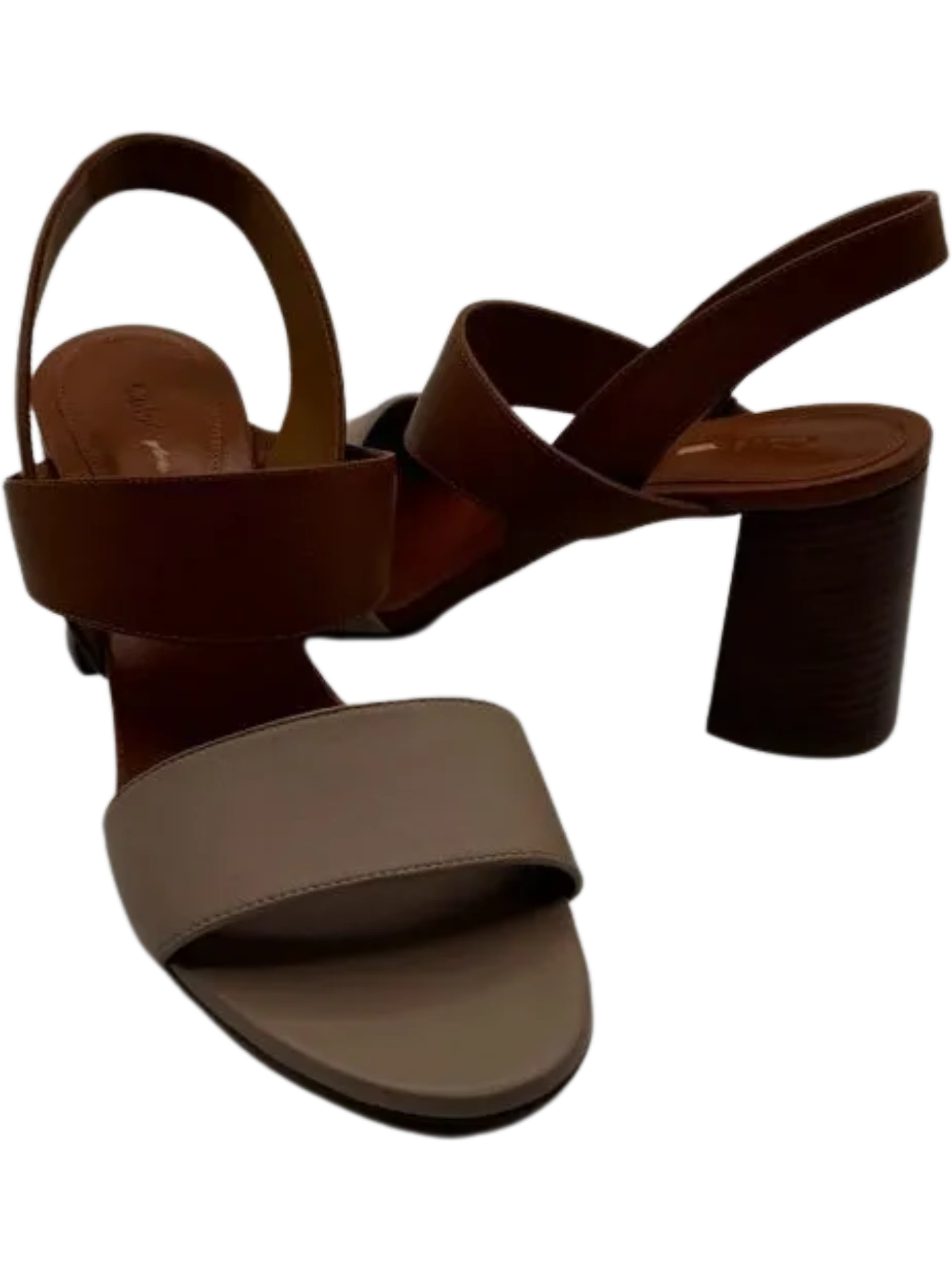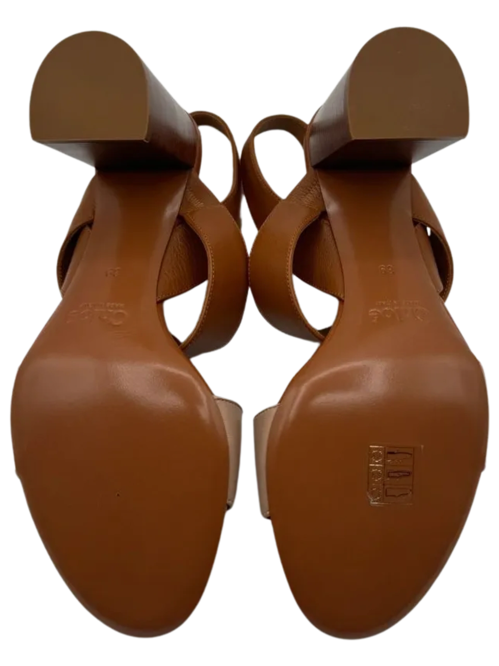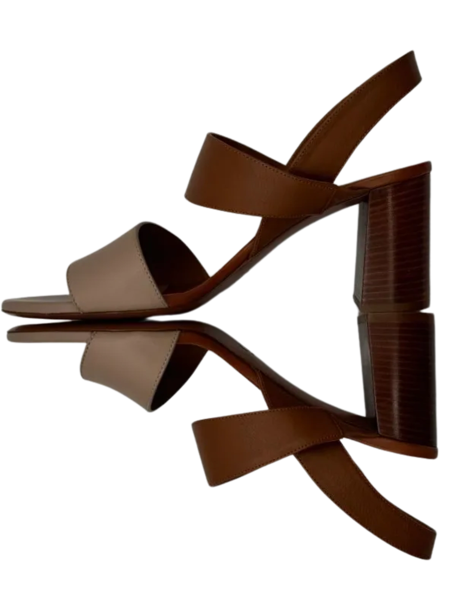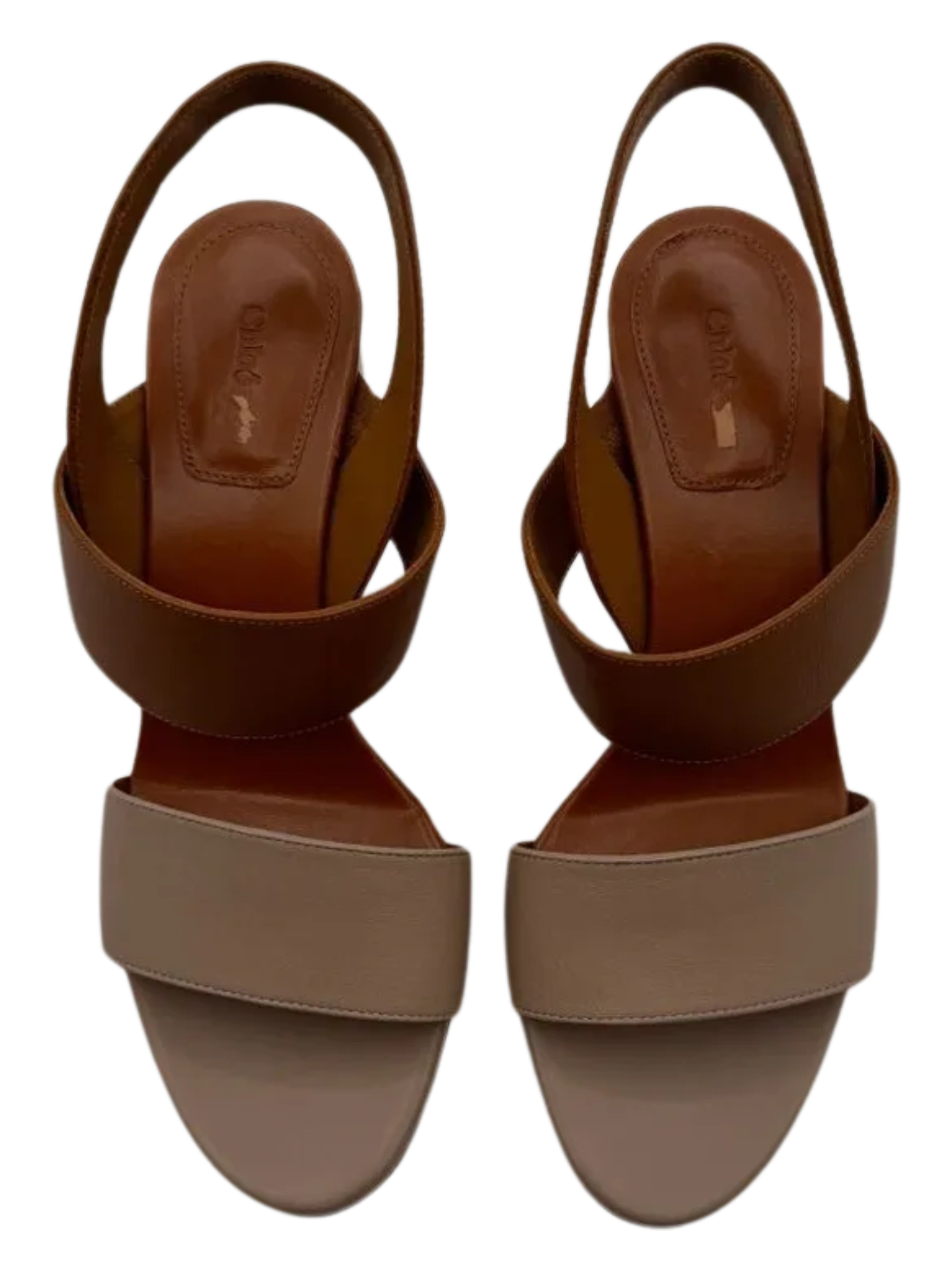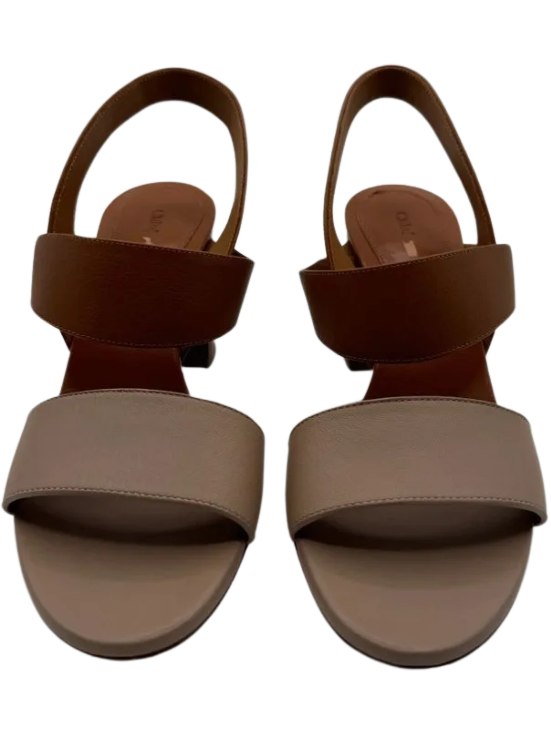 Add to your collection this authentic pair of Chloe Mia Two Tone Block Heel Sandals Size 9 | 39 crafted from supple camel and nude calfskin leather. Featuring a leather ankle strap, a round open toe-line and a chunky wooden block heel. S