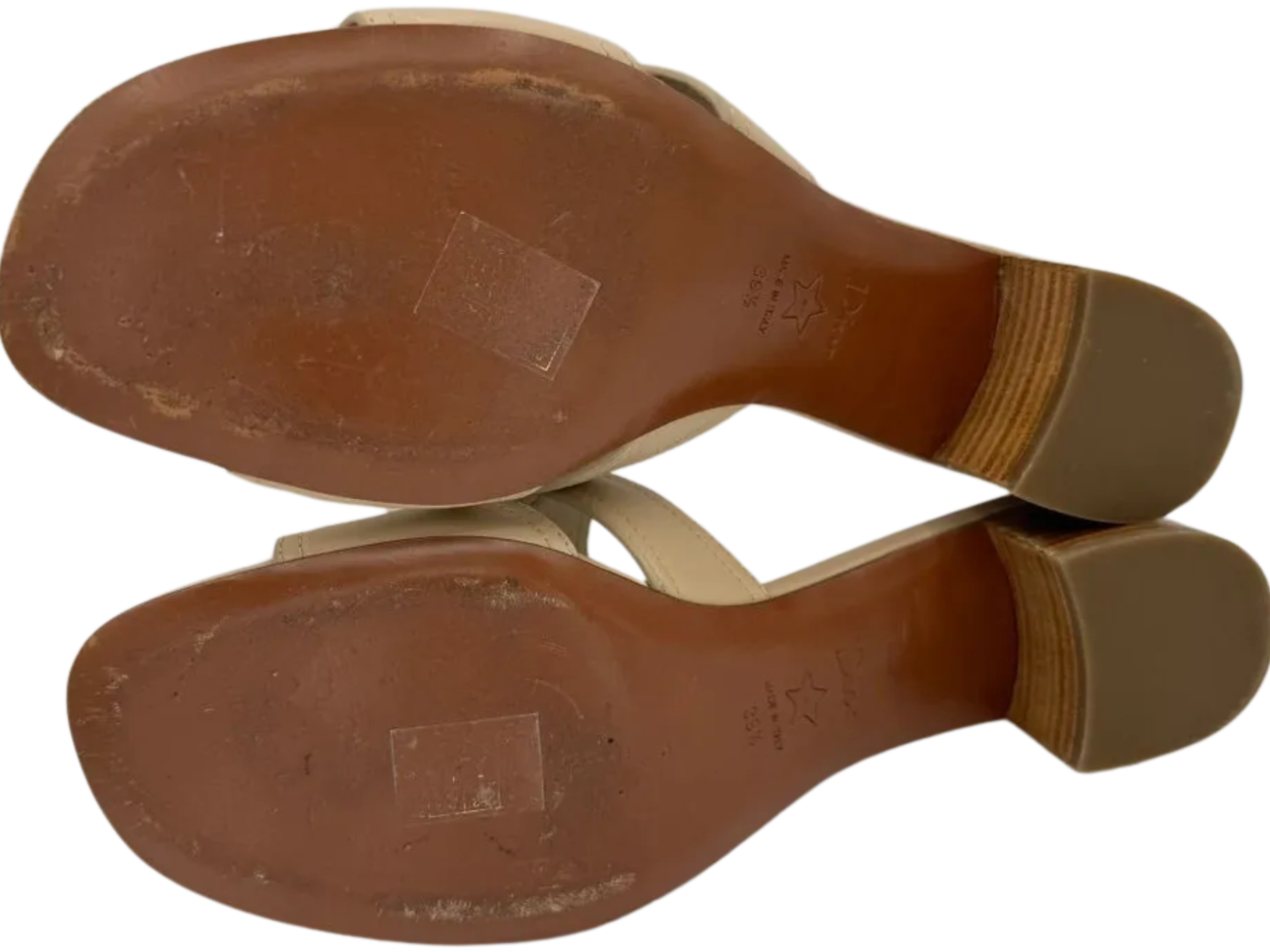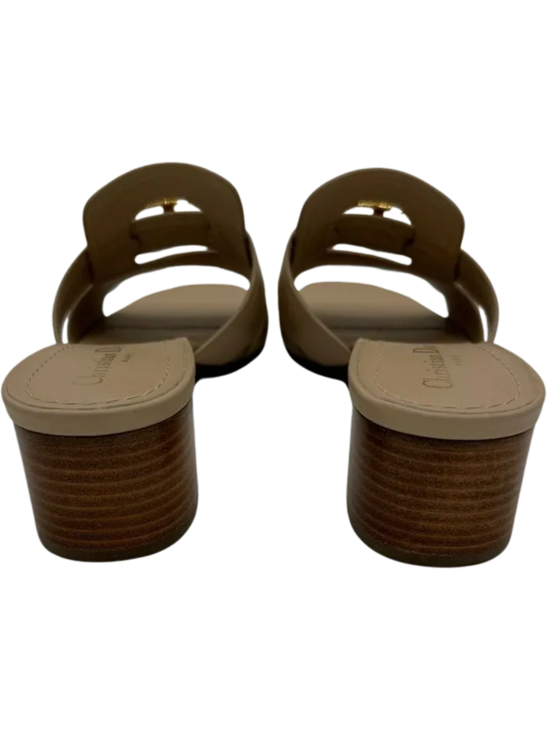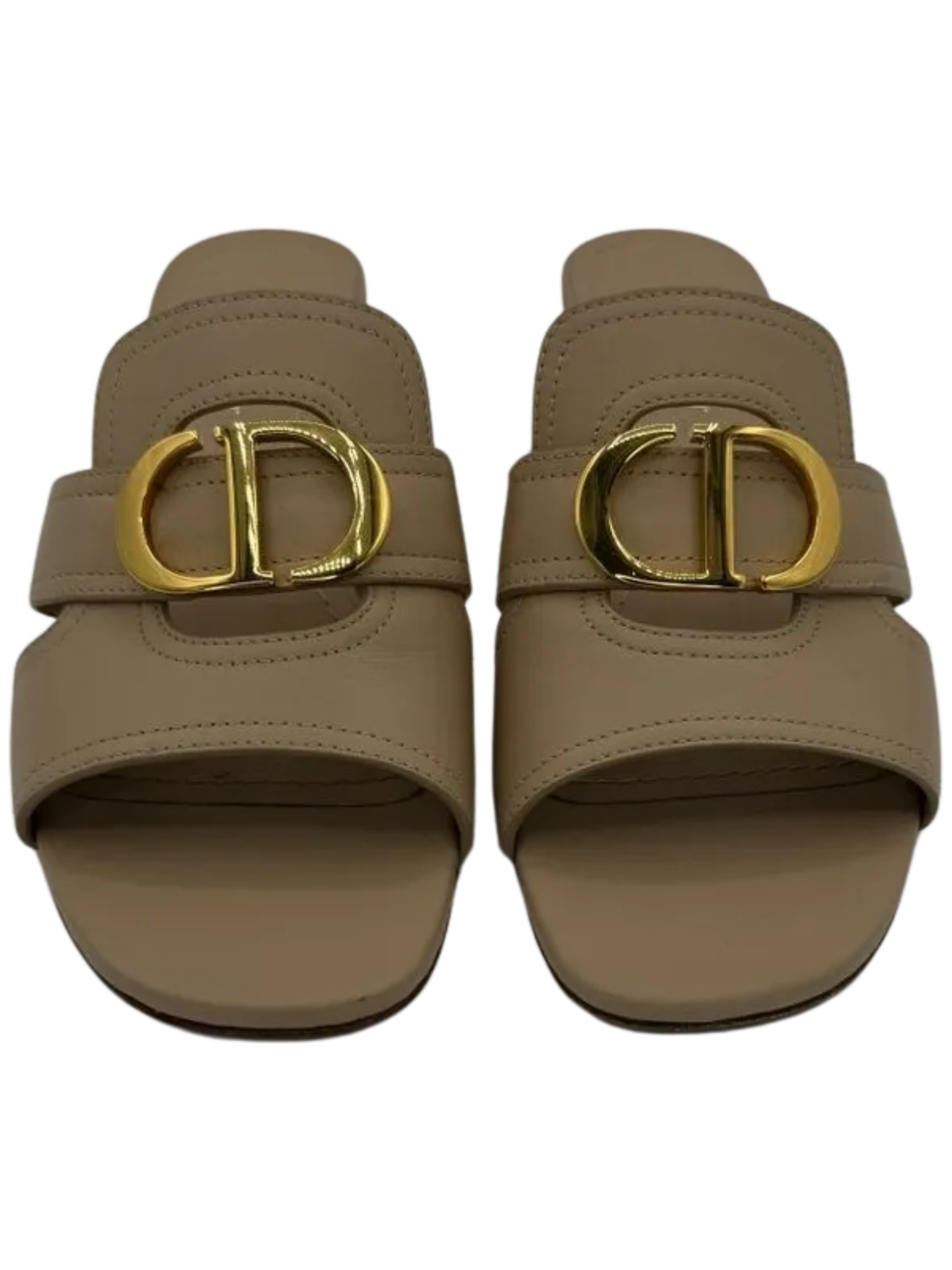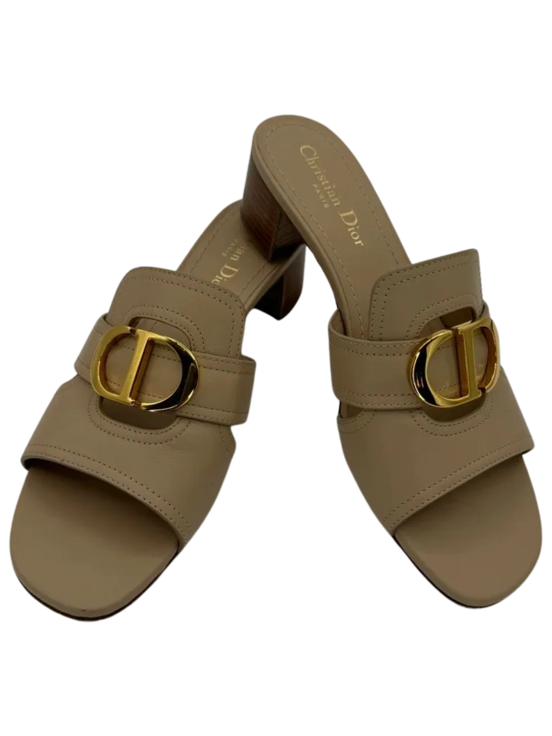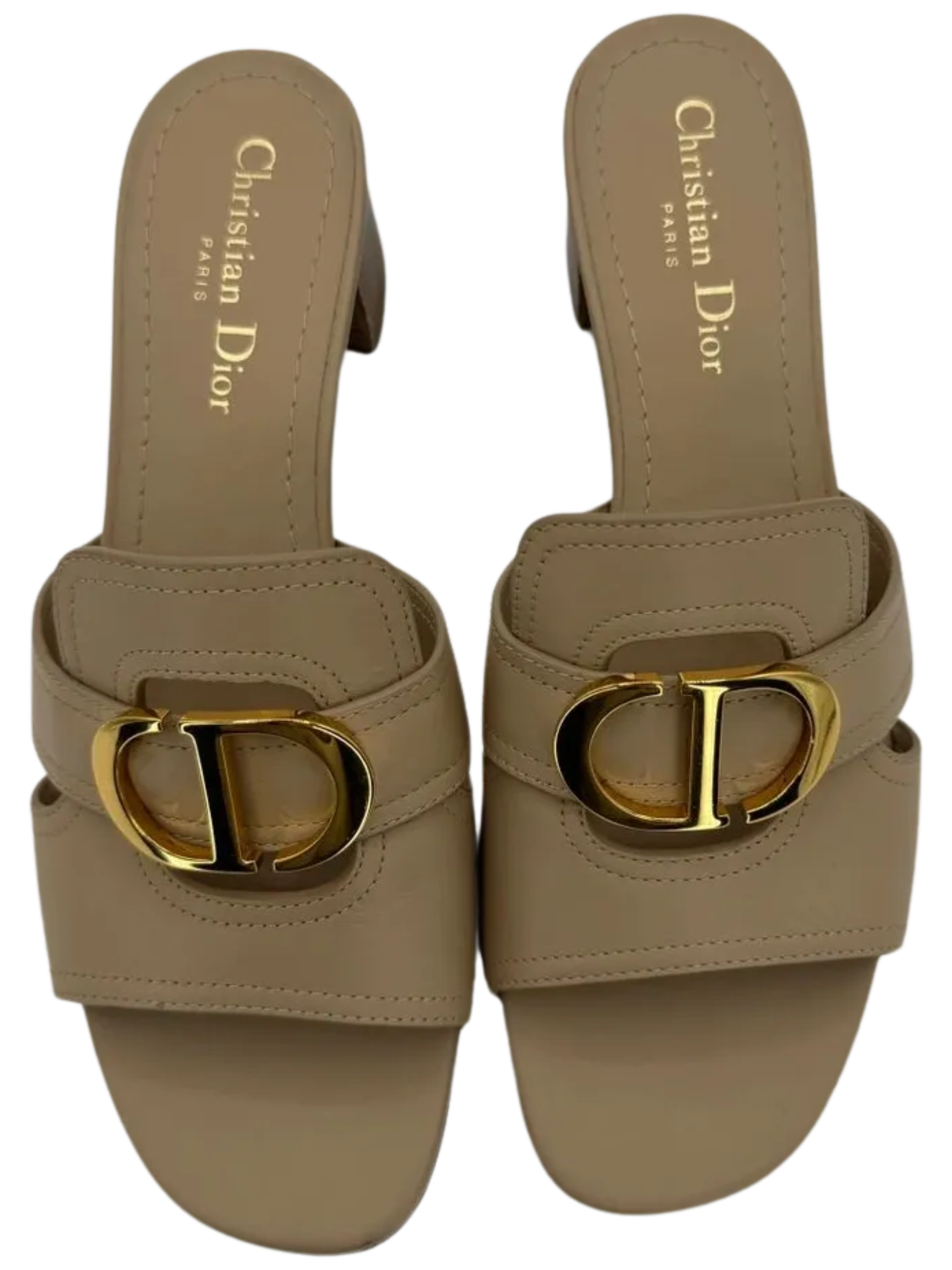 The 30 Montaigne heeled slide is an essential Dior wardrobe piece. The gold-finish metal 'CD' signature highlights the silhouette and contrasts with the nude calfskin, while the heel ensures an elegant look with a comfortable feel. The timeless and elegant lines complete any attire with ease. Leather sole embossed with star, Christian Dior's lucky symbol, Made in Italy, 4 cm / 1.5 inches block heel. Condition is Great - Only light wear on soles