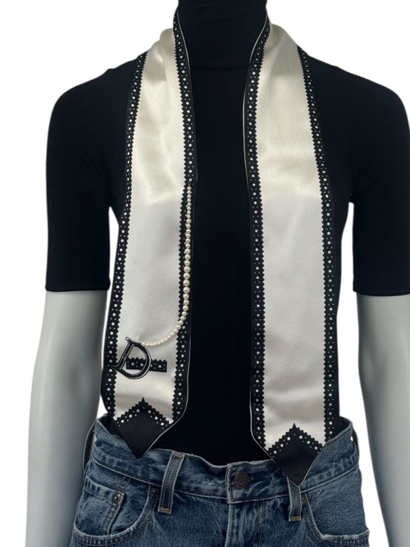 An iconic and elegant Christian Dior silk scarf rendered in a refined ivory base with striking black graphic borders and signature Dior “D” motif detailing. Crafted from luminous silk with a soft, fluid drape, this piece is elevated by an attached strand of faux pearls that cascades gracefully across the front—an unmistakably Dior touch that blends classic femininity with modern statement styling.