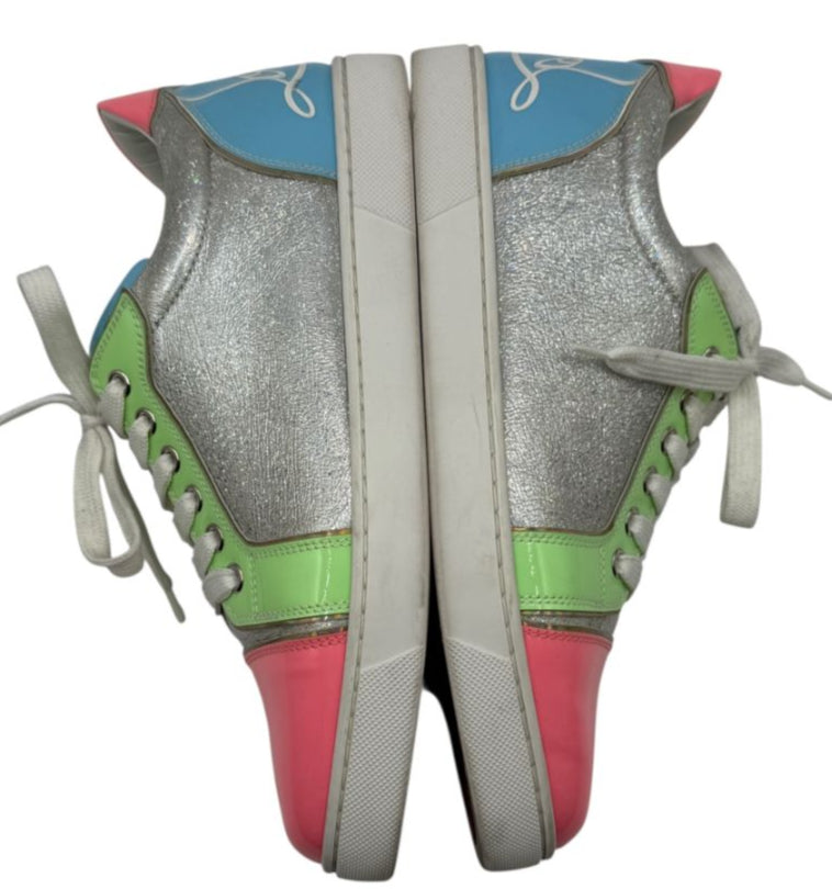 Bring playful sophistication to your sneaker rotation with these Christian Louboutin Vieira Fun Low-Tops, a bold colorblock design that captures the label’s irreverent spirit. Crafted in Italy from a mix of glossy patent leathers and glittered calf leather, this pair fuses bubblegum pink, tropical green, splash blue, and silver tones for a statement-making finish.