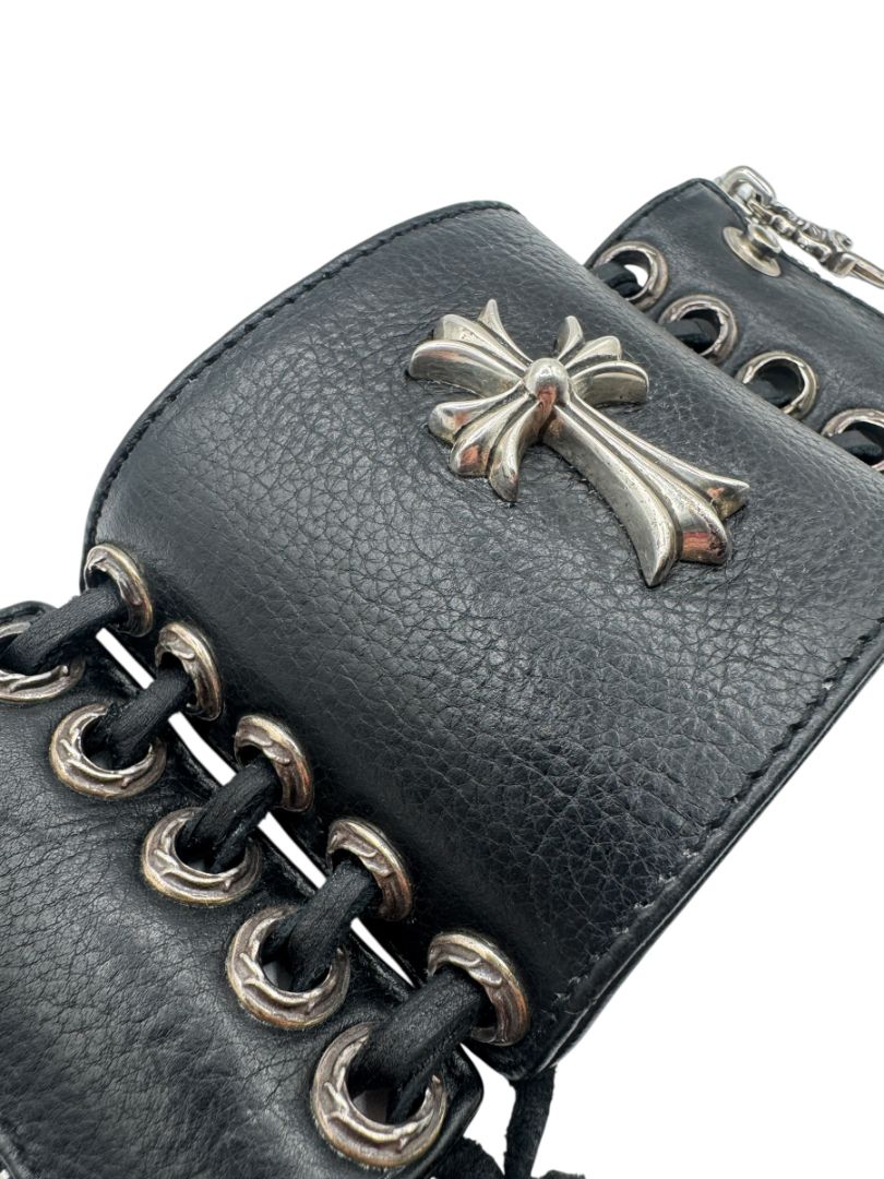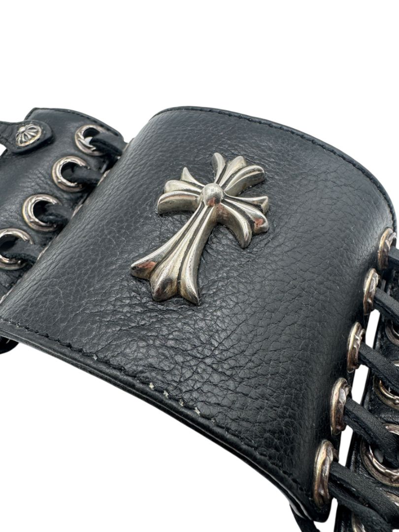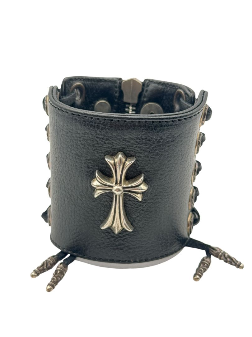 Vintage Chrome Hearts leather and sterling cuffs from the 1990s are highly sought after due to their heavy silver content, handcrafted leather construction, and limited production compared to modern pieces. The combination of cross motif, dagger hardware, and lace-up design makes this a particularly desirable example.
