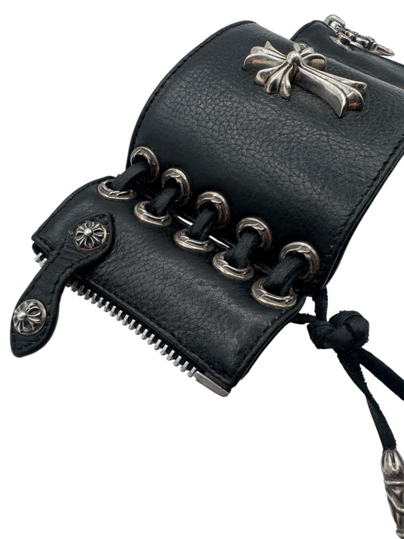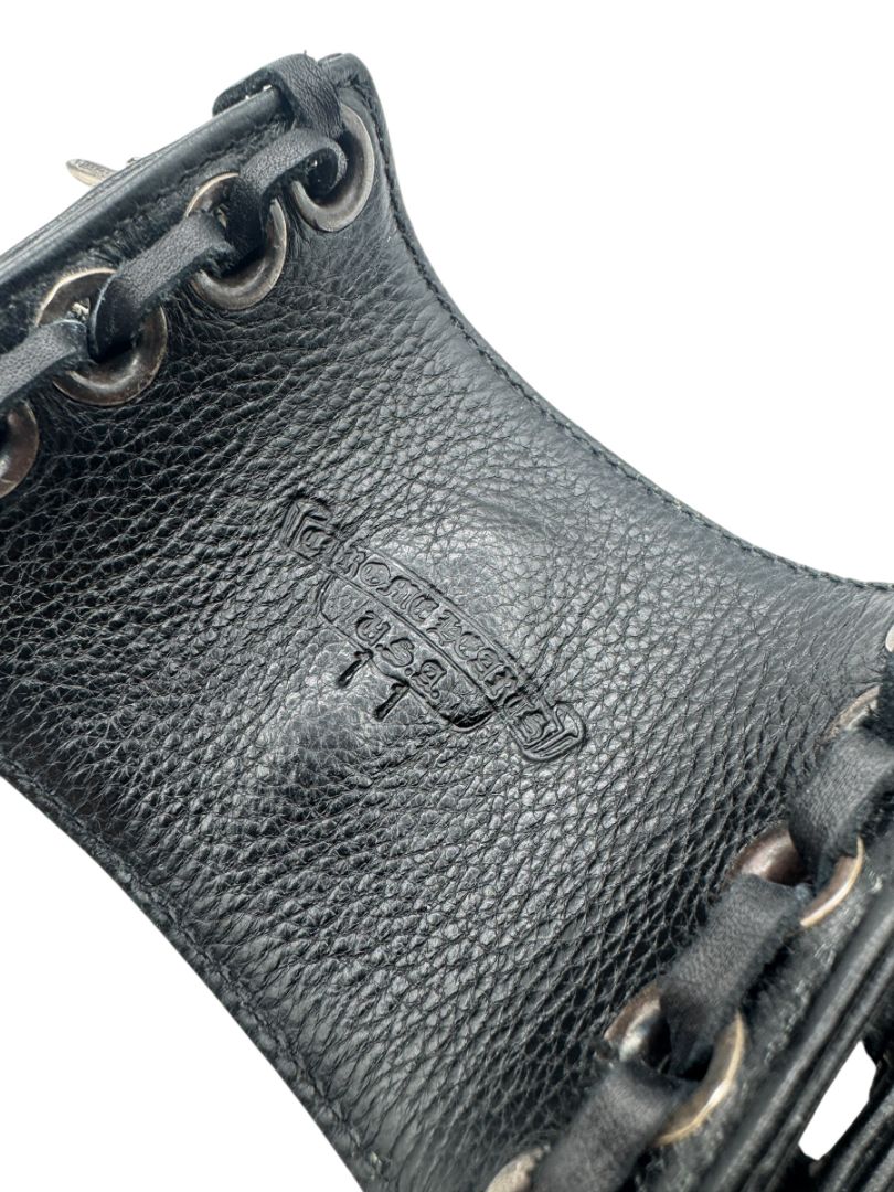A true statement accessory that blurs the line between jewelry and leatherwork, this cuff can be styled as a bold standalone piece or layered with other Chrome Hearts jewelry for a dramatic look. Rare vintage examples like this are increasingly difficult to find, making it a standout addition for collectors and enthusiasts of the brand.