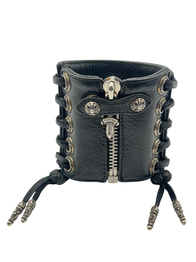 A striking and highly collectible Chrome Hearts leather cuff bracelet from the 1990s, showcasing the brand’s unmistakable gothic aesthetic and masterful combination of sterling silver and handcrafted leather. This substantial cuff is crafted from thick, supple black leather and features a dramatic lace-up design threaded through sterling silver grommets along both sides, allowing for an adjustable and sculptural fit.