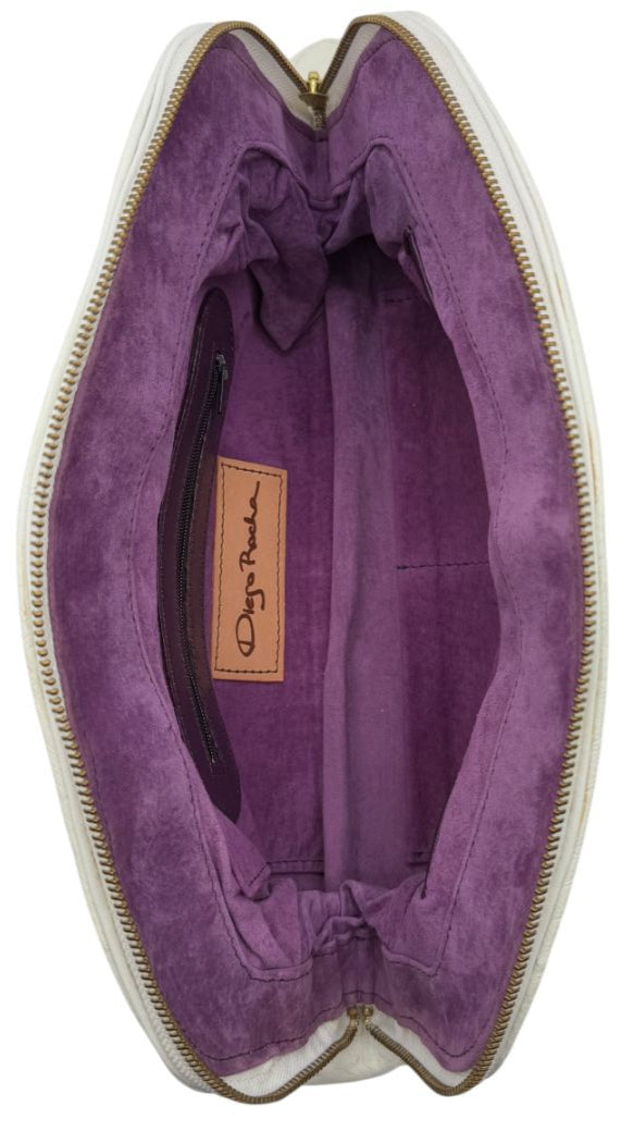 The top zipper opens to reveal a rich purple suede-lined interior with one zippered pocket and an elastic slip pocket for secure storage.
