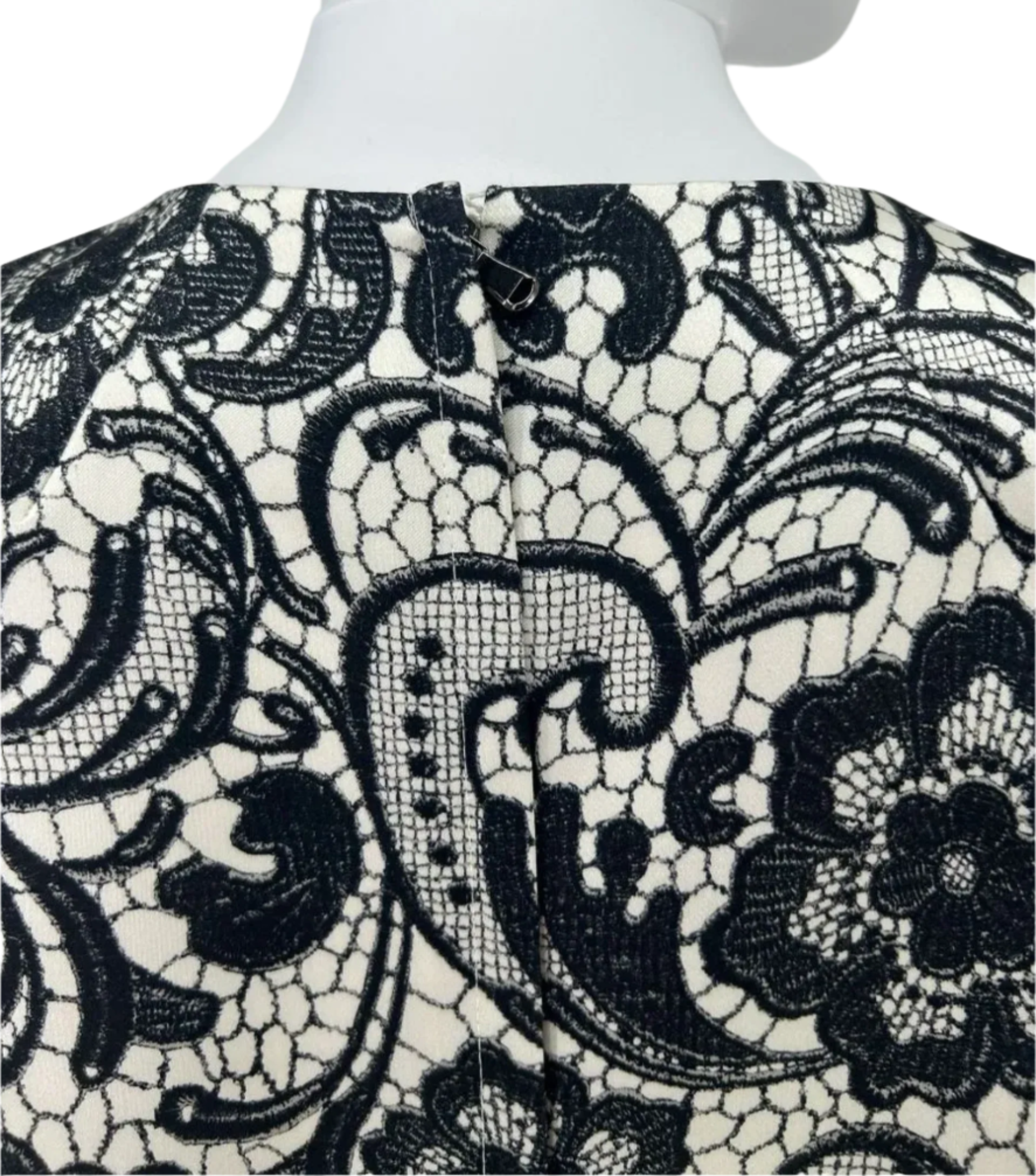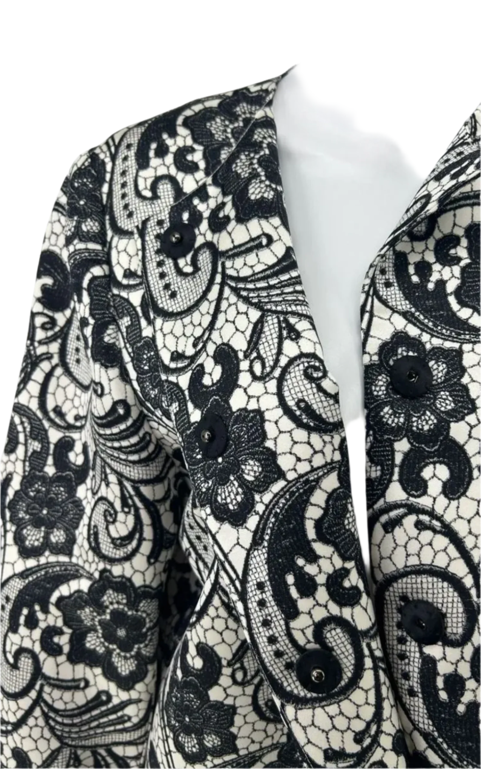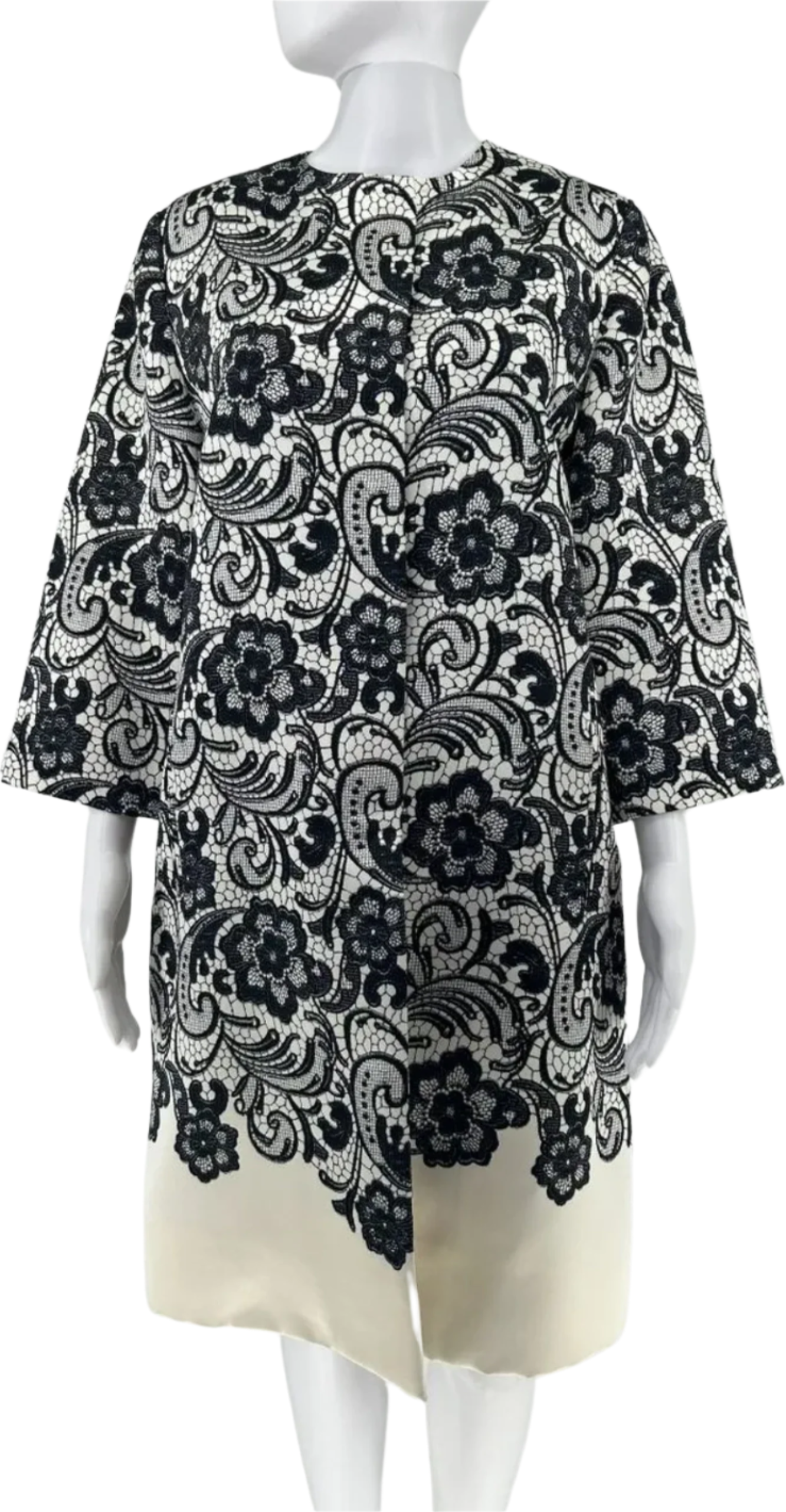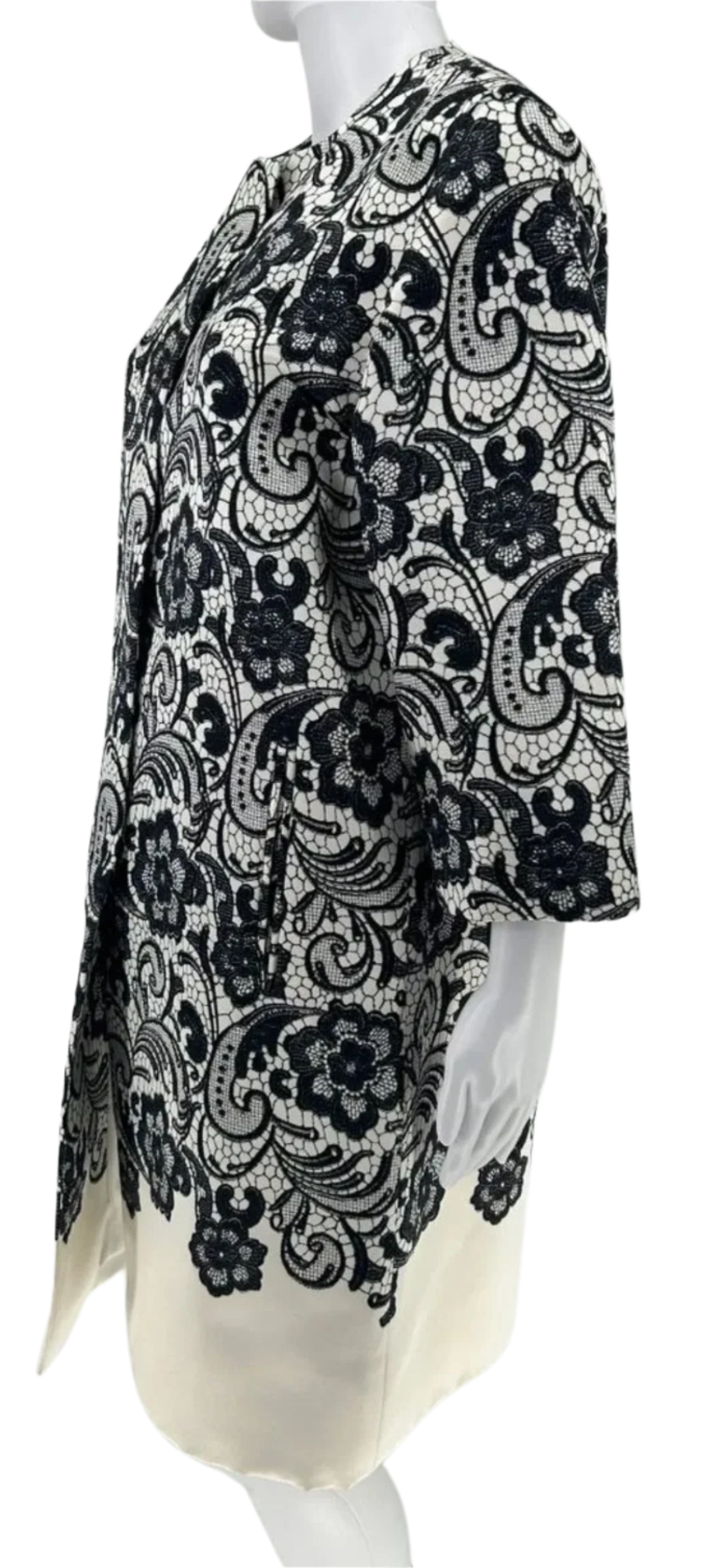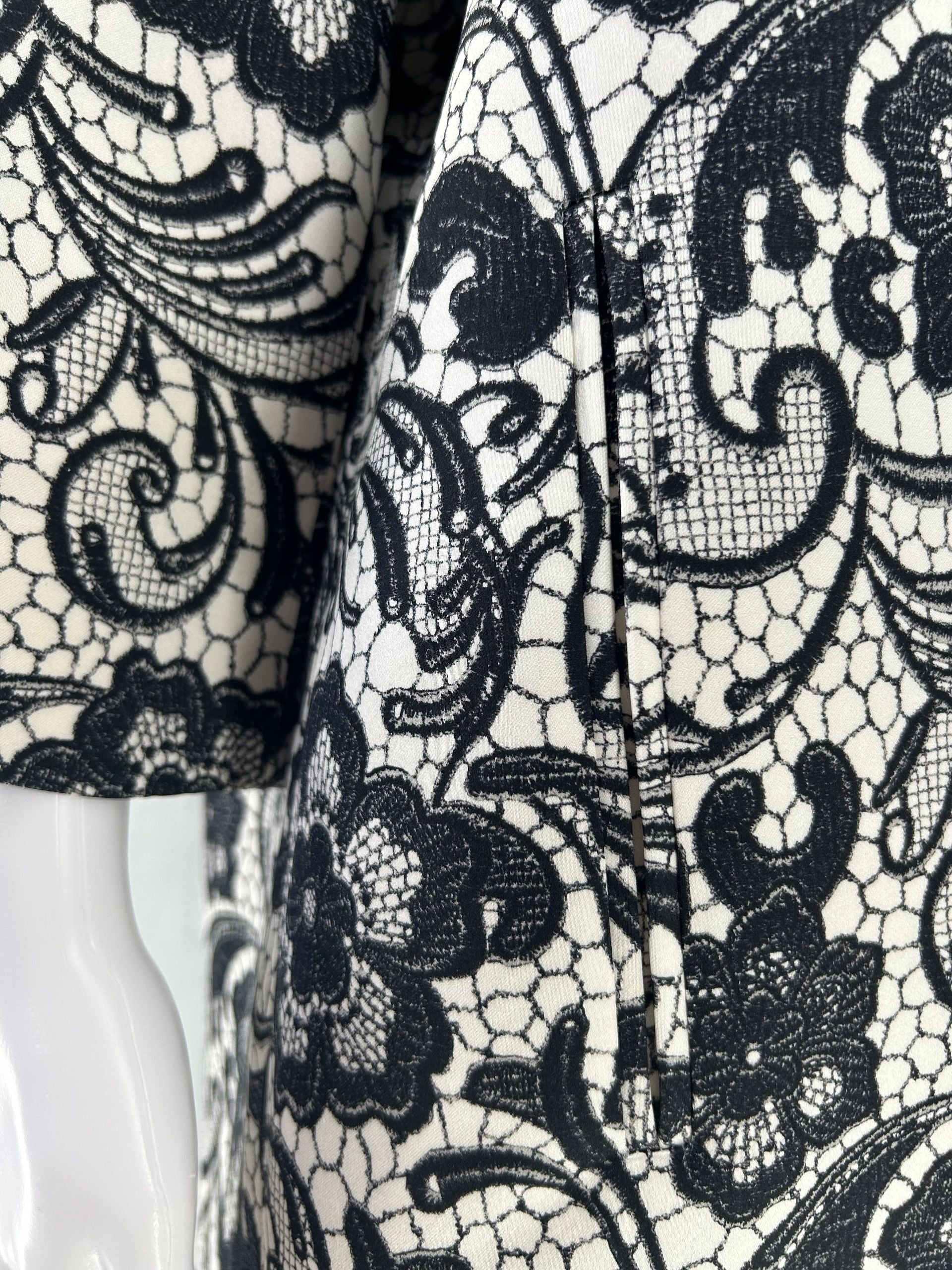Streamlined Round jewel neck, Hidden pockets at each side, Closes at neck with large hidden snaps. Structured straight silhouette with bracelet length sleeves. This bold black lace pattern finishes just above the hem where ivory creates a solid base for hem.