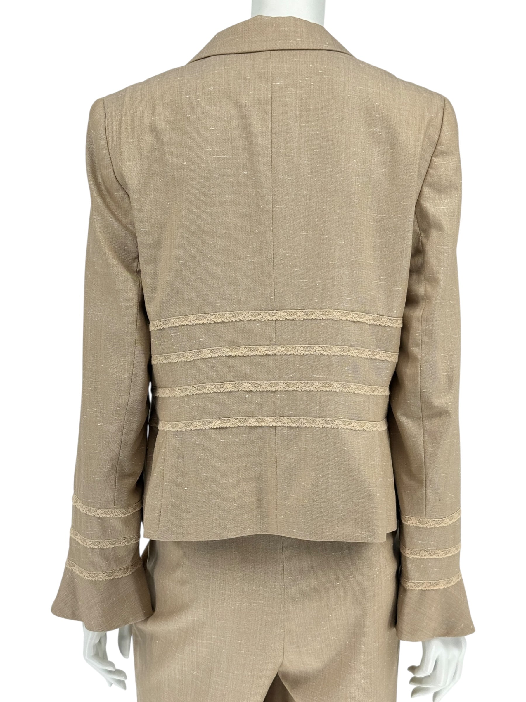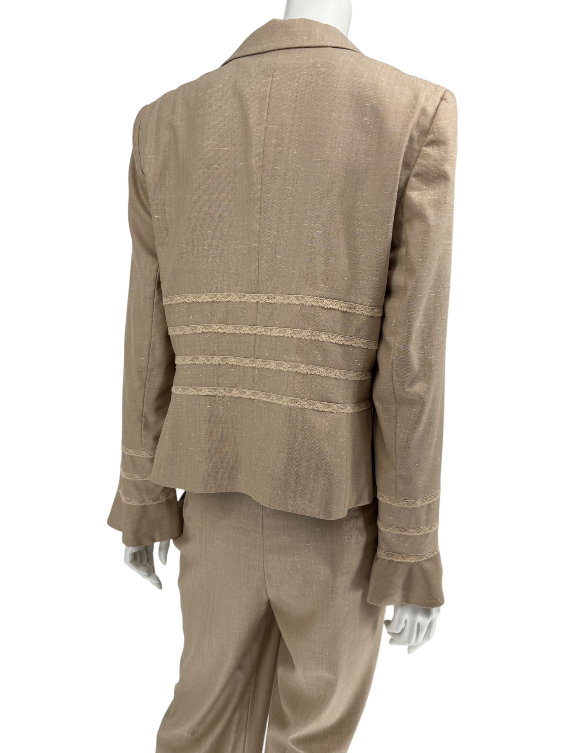 Excellent Pre-Owned Condition. This Escada suit embodies timeless elegance with refined tailoring and feminine detailing. The blazer features structured shoulders, a single-breasted button front, and delicate lace trim accents at the waist and cuffs for subtle sophistication. The coordinating trousers are cut with a straight-leg silhouette and finished with a flattering side-zip closure for a smooth, tailored fit. Crafted from a luxurious wool-silk blend with stretch, this set balances structure with comfort—perfect for boardroom to evening transitions.