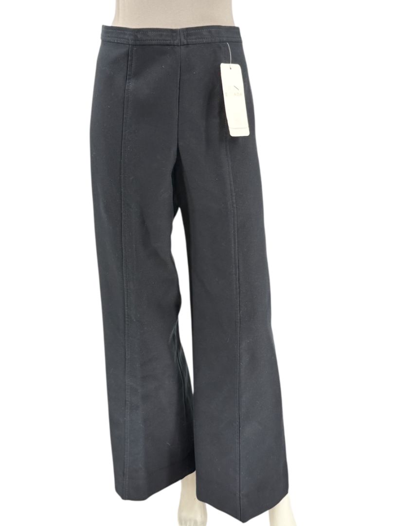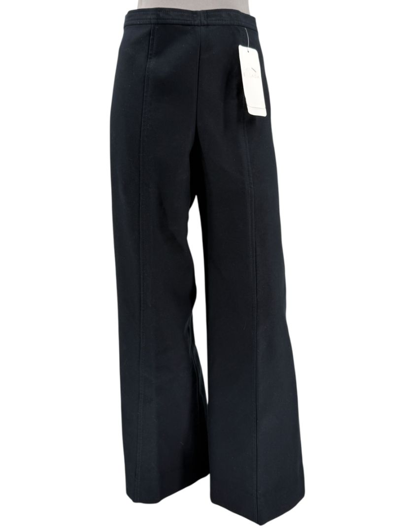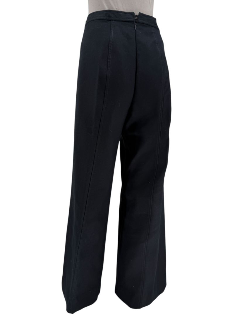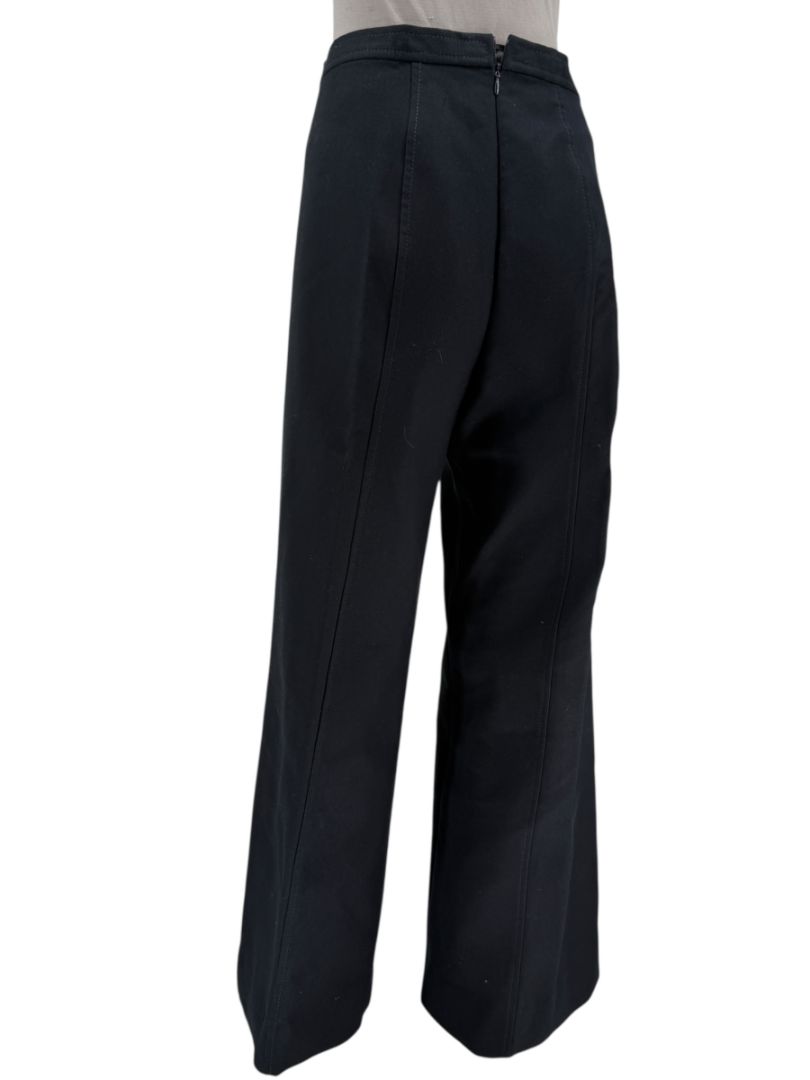 Pristine Escada wide-leg trousers crafted in structured 100% cotton with impeccable tailoring and a clean, elongating silhouette. Designed with a flat waistband and concealed back zip closure, these trousers fall into a fluid wide-leg shape enhanced by sharp front and back seam detailing for a lengthening effect. The rich black tone and architectural cut make them endlessly versatile—equally powerful styled with a silk blouse and heels or pared back with a knit and loafers.