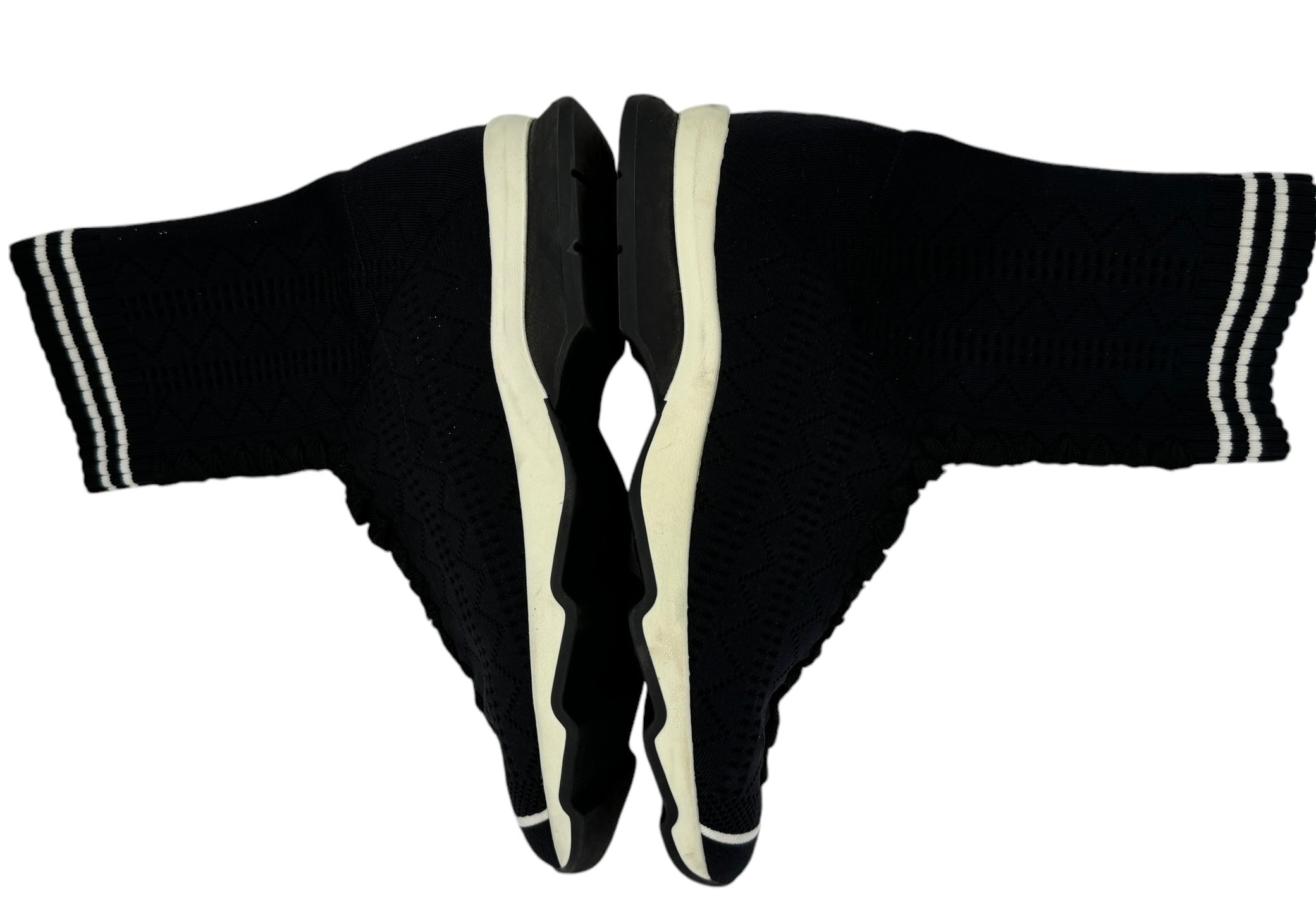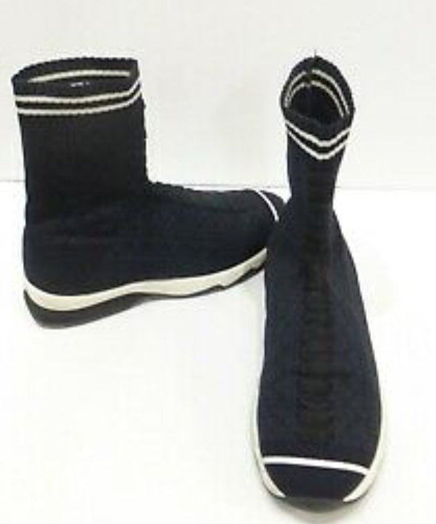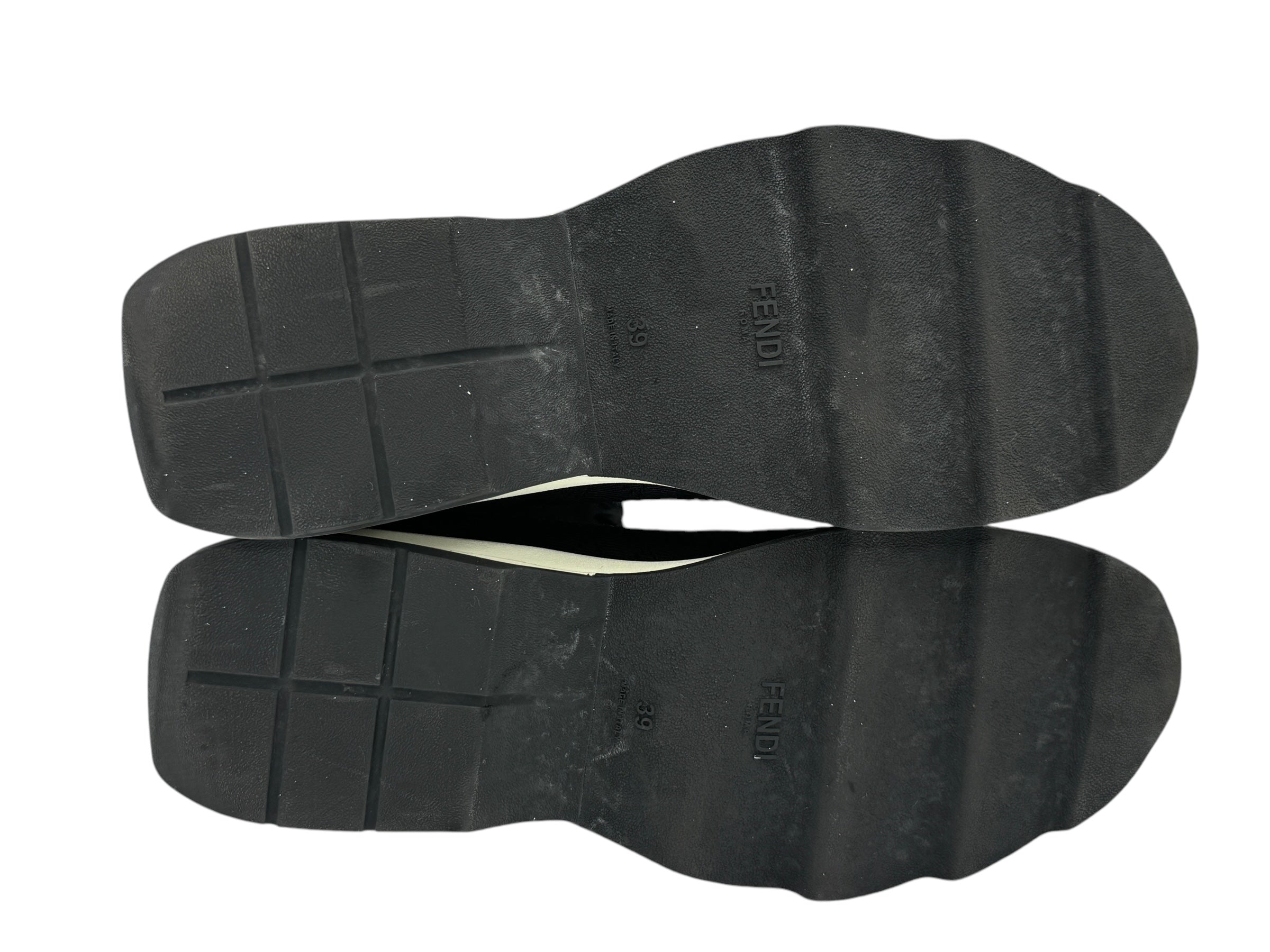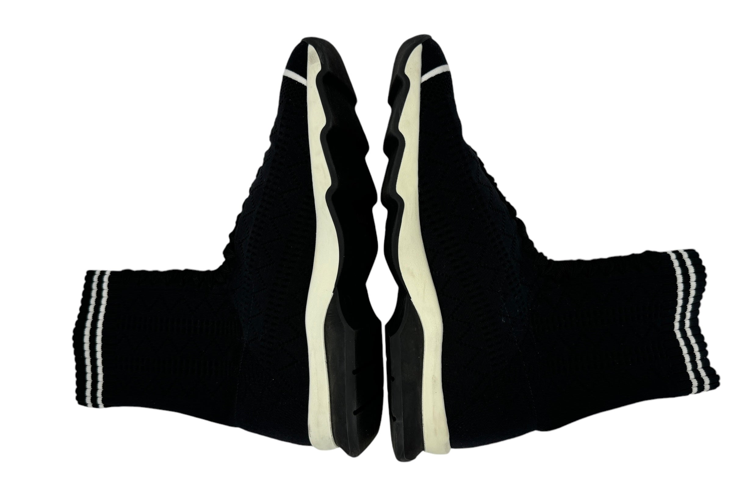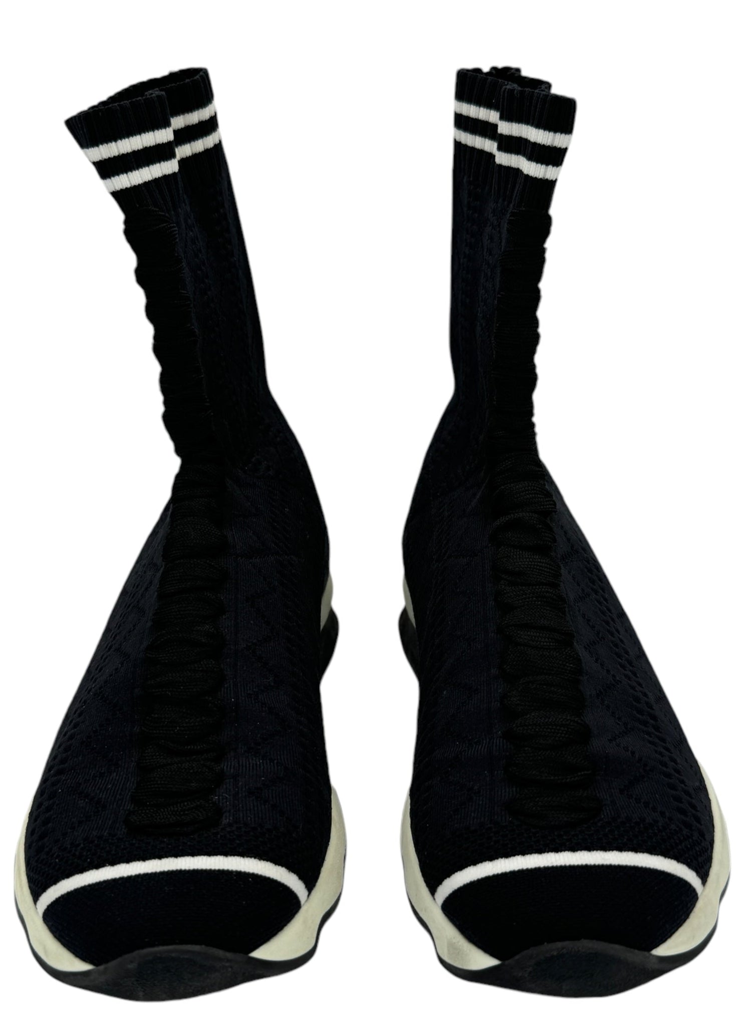 Runway trainers in total black stretch yarn, openwork all over the shoe. The ultra-modern design is highlighted by the "sock" detail that covers the ankle, finished with a ribbed edge and a double white stripe. The black laces are inserted in the center and do not tie. Color-block running-style rubber sole in black and white. Made in Italy Color Black, White Composition 87% POLYAMIDE, 13% ELASTANE, EMBROIDERY: 100% VISCOSE, INSIDE: 100% GOAT LEATHER