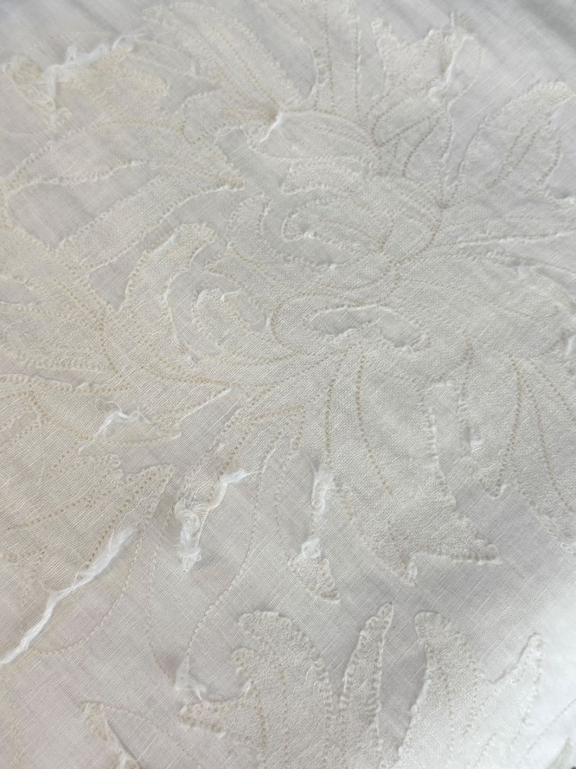 A breezy yet refined piece, this Fendi tunic is crafted in airy white linen and elevated with tonal floral appliqué and raw-edge texturing for a modern, artisanal feel. Its sleeveless silhouette, straight cut, and subtle sheer finish make it a versatile layering piece—perfect styled over slim trousers, leggings, or even as a chic beach cover-up.