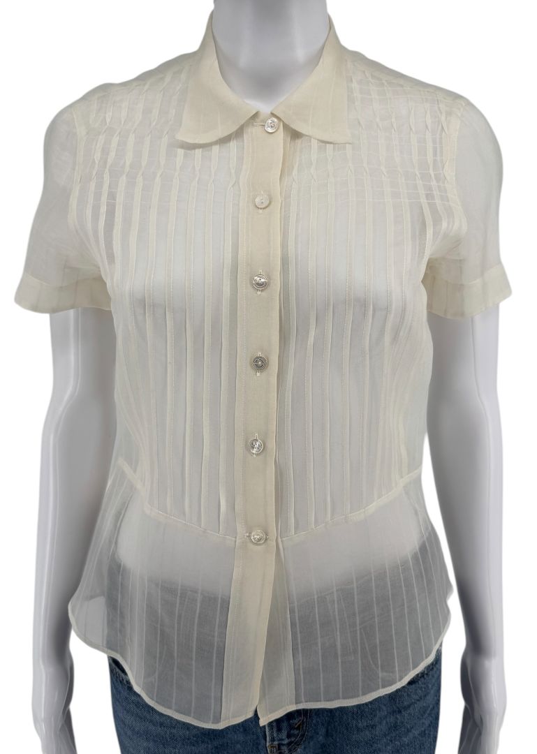 Elevate your wardrobe with this refined Giorgio Armani blouse, crafted in a luxurious sheer silk-blend fabric. Featuring vertical pleating throughout and a fitted silhouette, this short-sleeve blouse is finished with elegant logo-engraved buttons and a classic point collar. The semi-sheer construction adds a soft, ethereal quality perfect for layering or standing alone as a statement piece.
