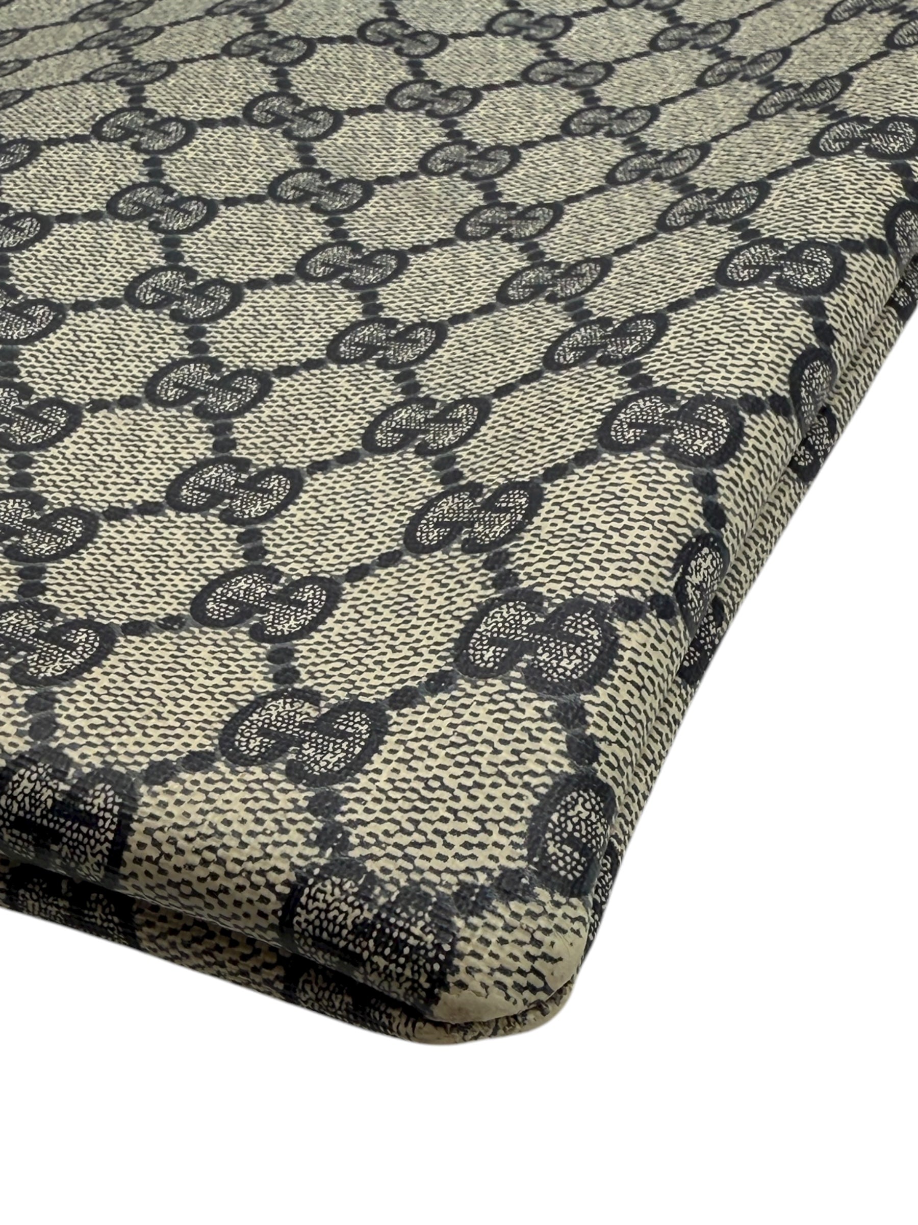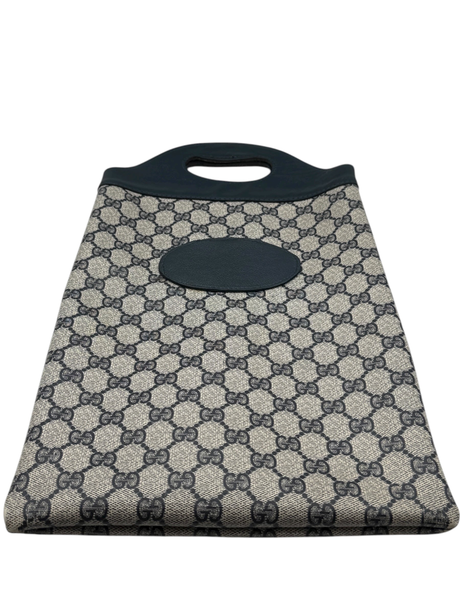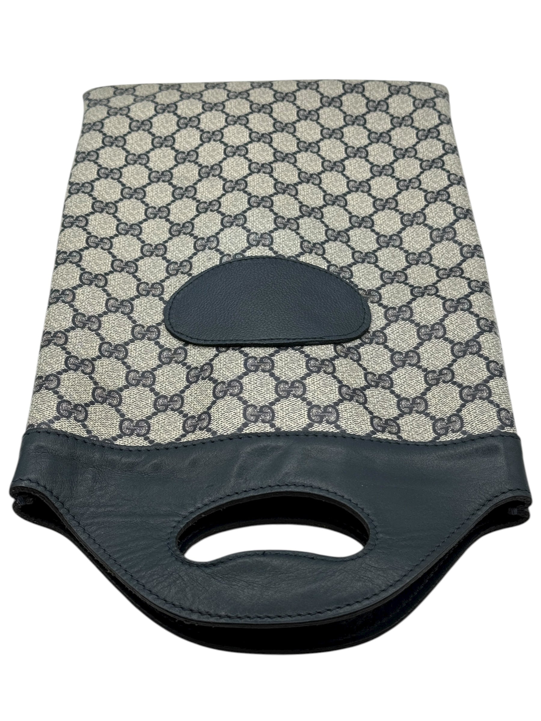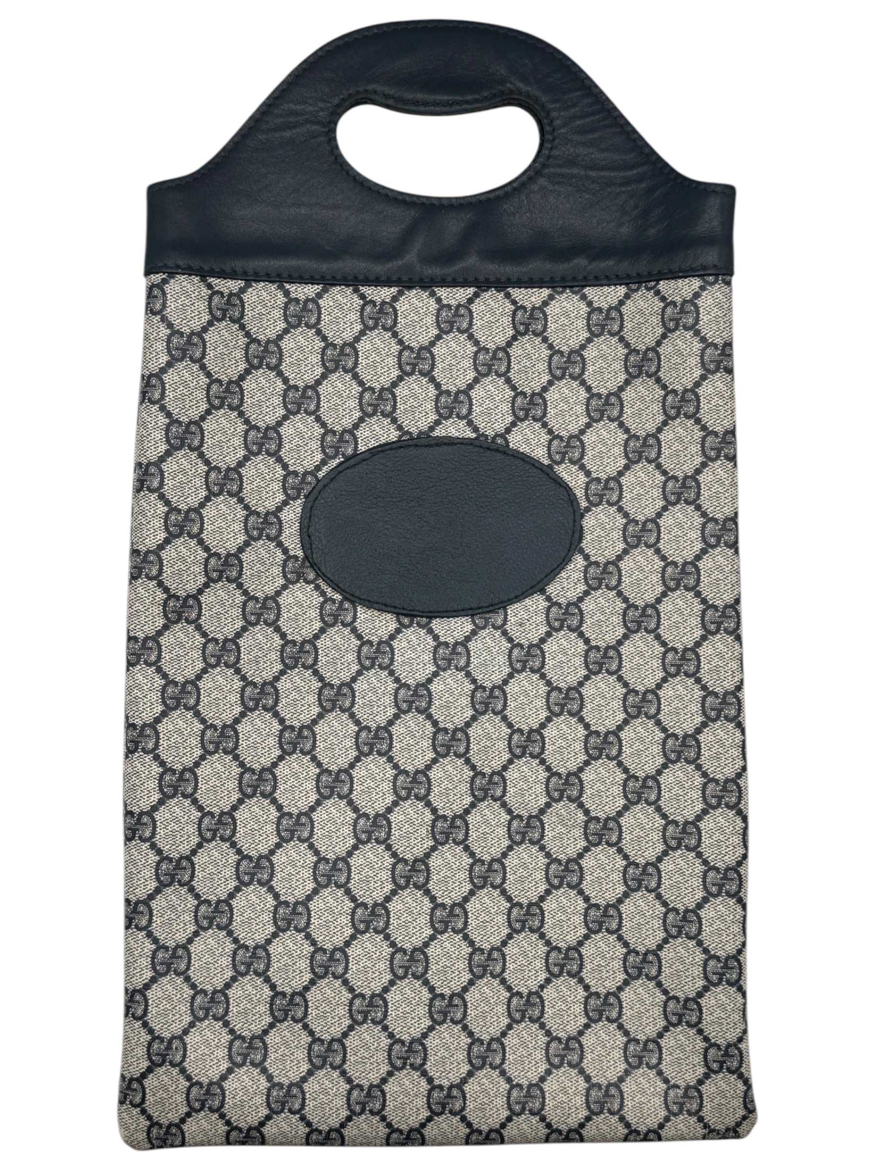 Crafted in Italy, the exterior features Gucci’s signature beige and navy GG monogram canvas paired with deep navy leather trim and integrated top handles. The elongated silhouette, precision stitching, and oval leather patch detail evoke the understated luxury and heritage that define the house of Gucci.