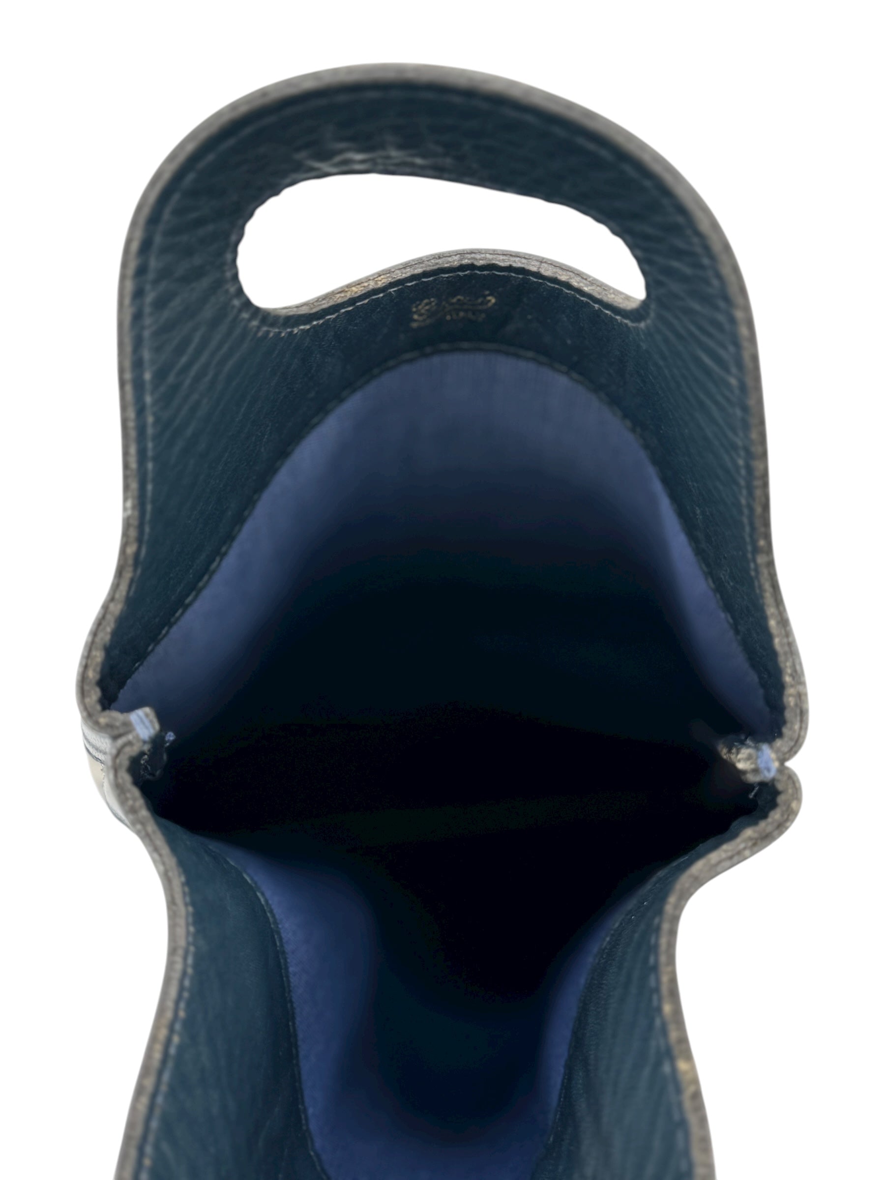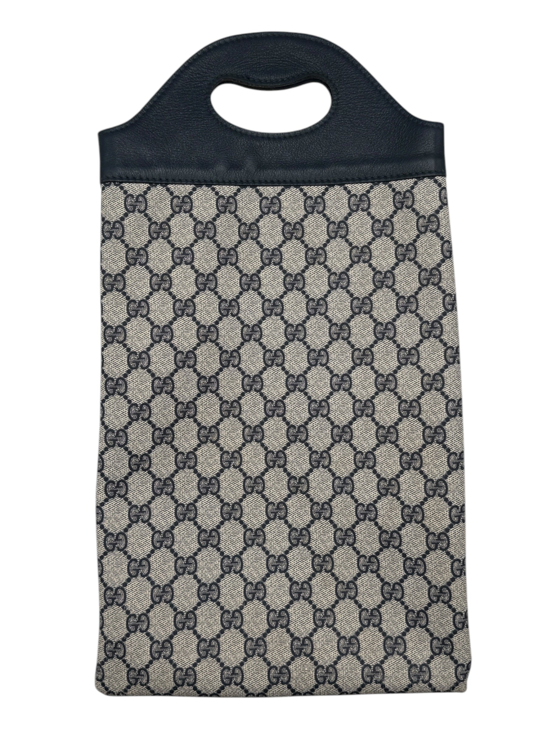The interior is lined in a durable navy textile that helps cushion and protect a bottle. With its slim, sculptural shape and cut-out handles, the bag doubles as a stylish host’s accessory, a conversation-starting display piece, or a collectible addition to any curated Gucci collection.