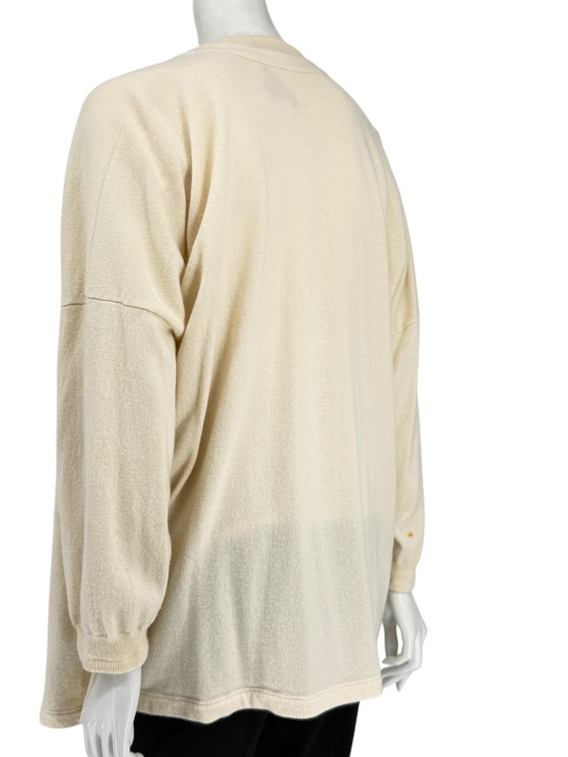 Condition: Good Pre-Owned Condition. One visible spot on the arm (as pictured) and faint discoloration near the pocket area (as pictured). Otherwise, the cashmere remains soft and wearable with no holes or major flaws; overall structure is intact.